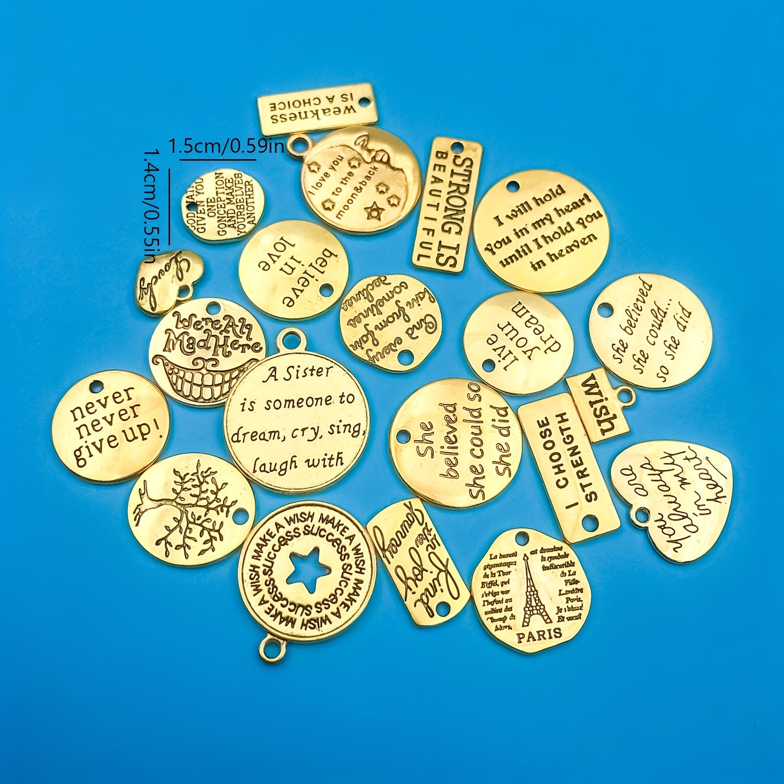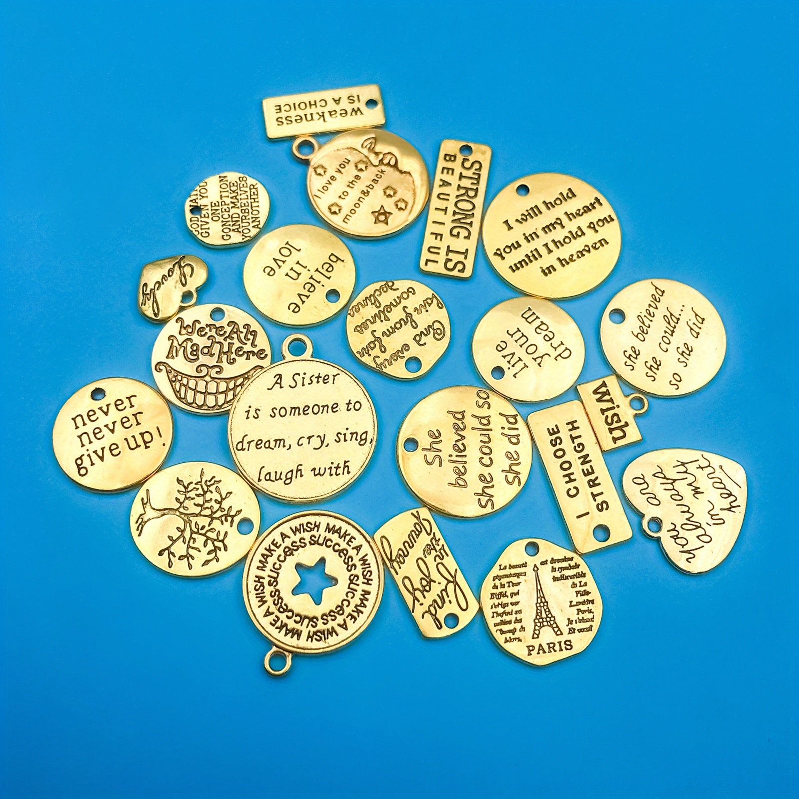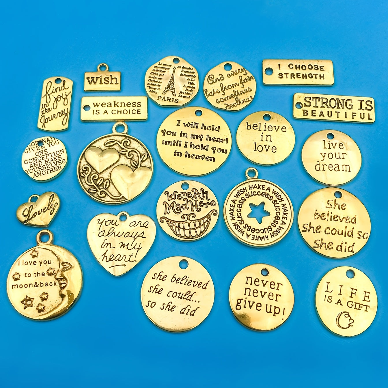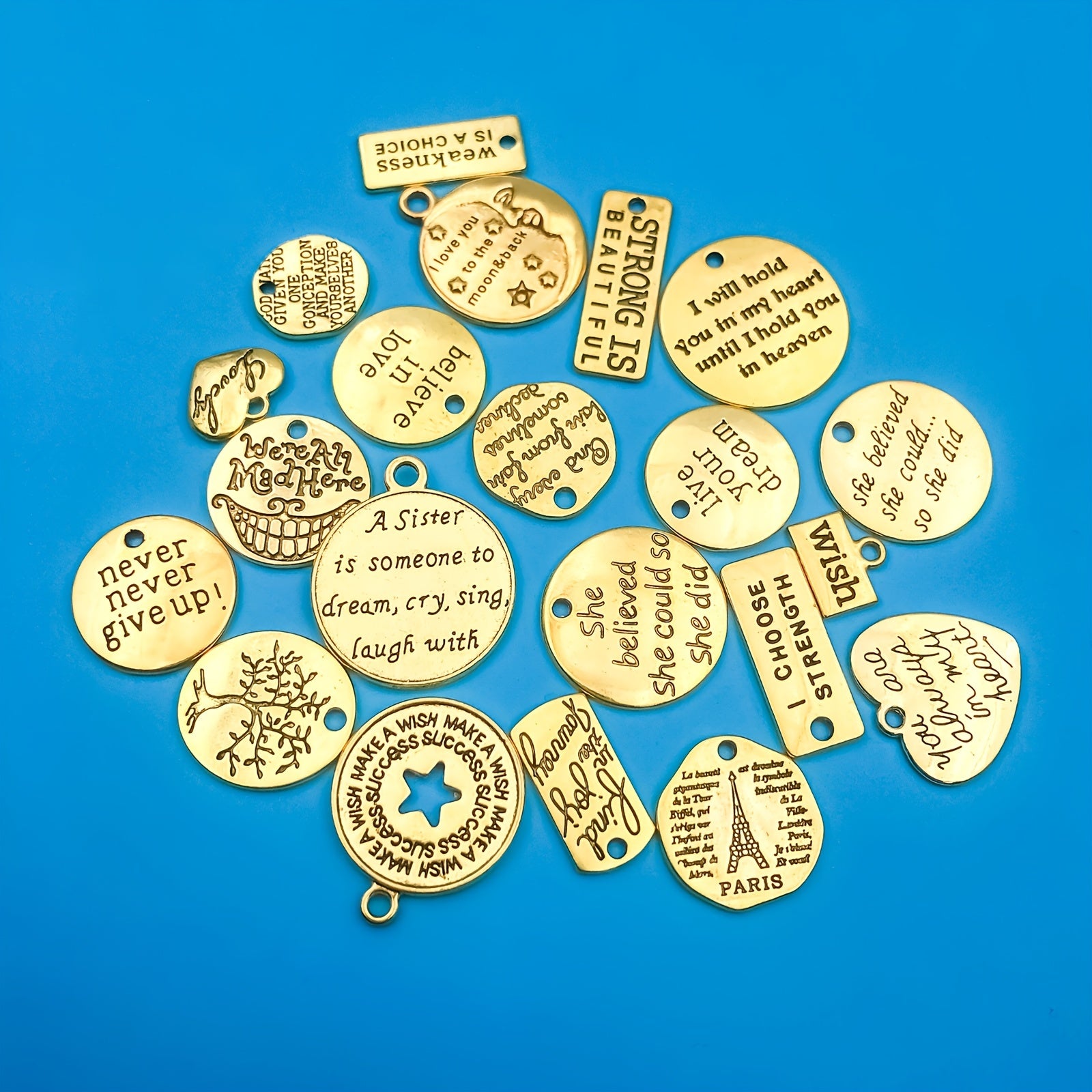 This set includes 21 zinc alloy pendants in antique golden finish with letter, circle and square shapes. Perfect for creating necklaces, bracelets, earrings and other jewelry pieces.