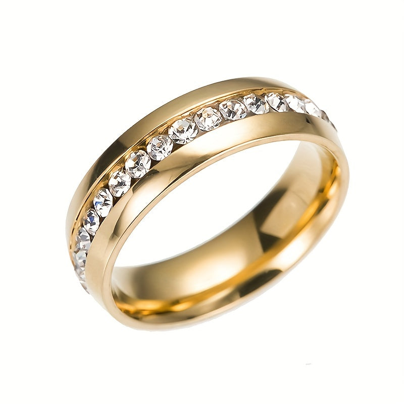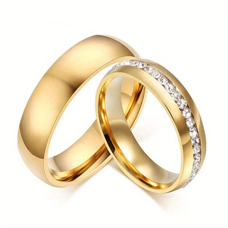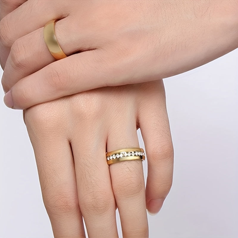 Add a touch of sparkle with this set of 2 stainless steel rings featuring one row of rhinestones. Perfect for weddings or special occasions.
