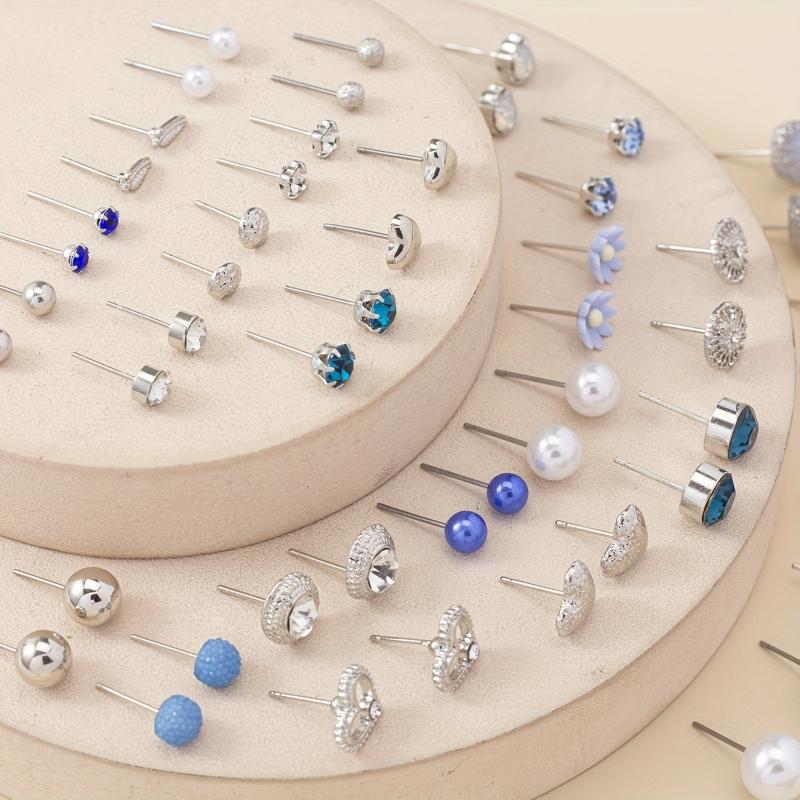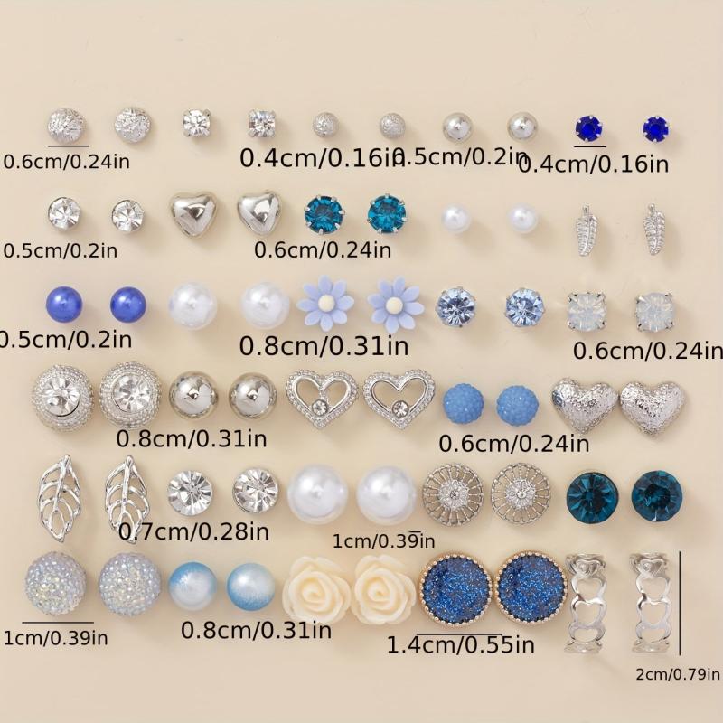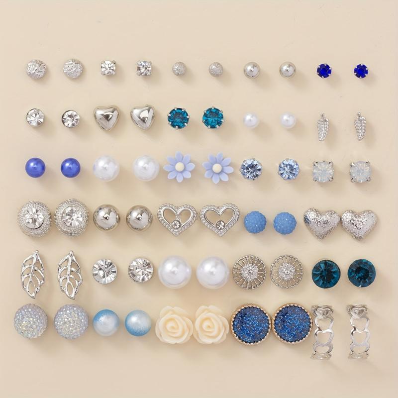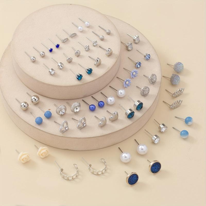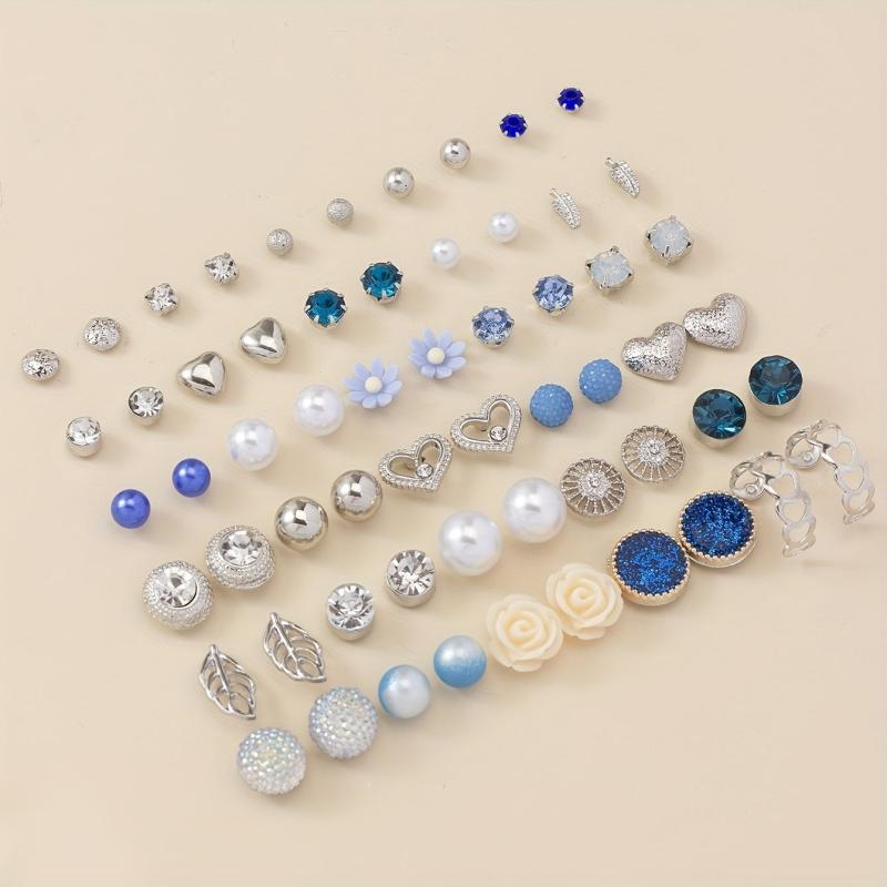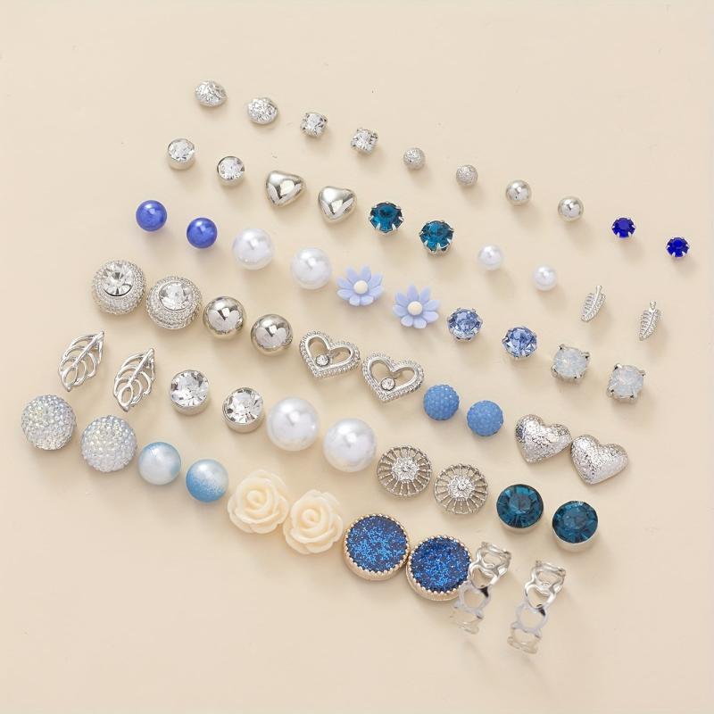 Complete your outfit with this set of 30 pairs of stud earrings featuring a variety of flower, leaf, rhinestone, and faux pearl designs. Made of high-quality zinc alloy, these earrings are stylish and versatile, perfect for everyday wear or special occasions.