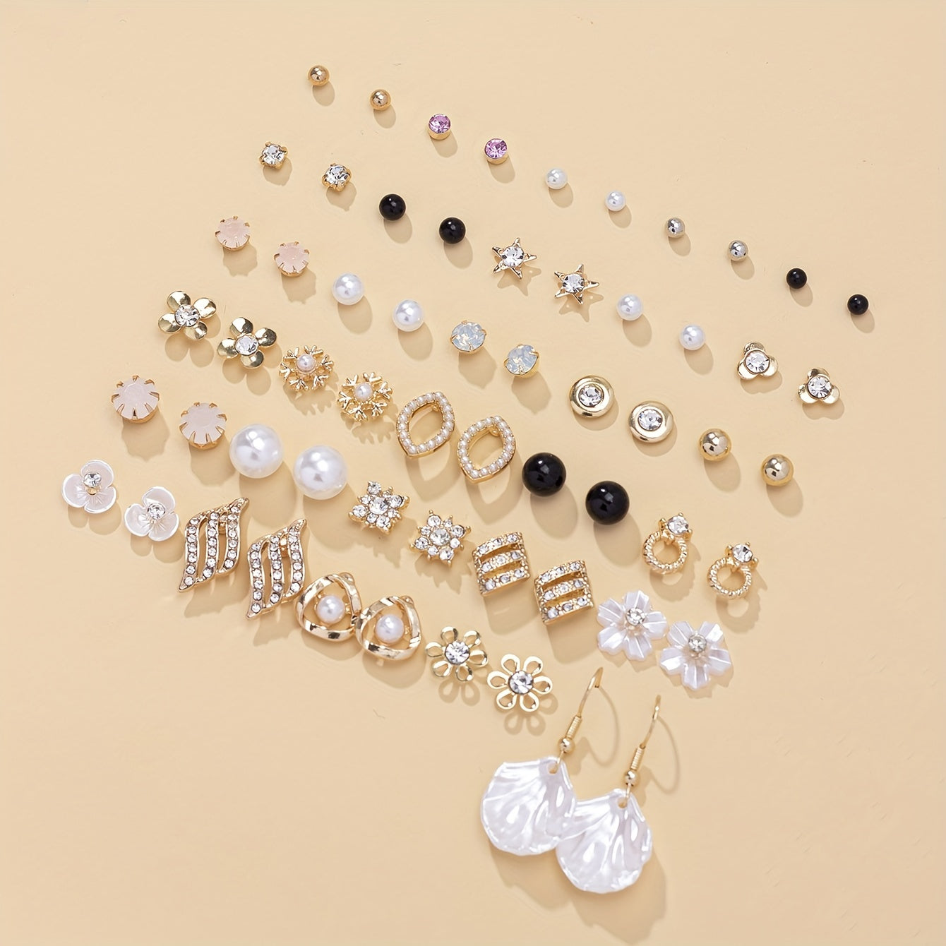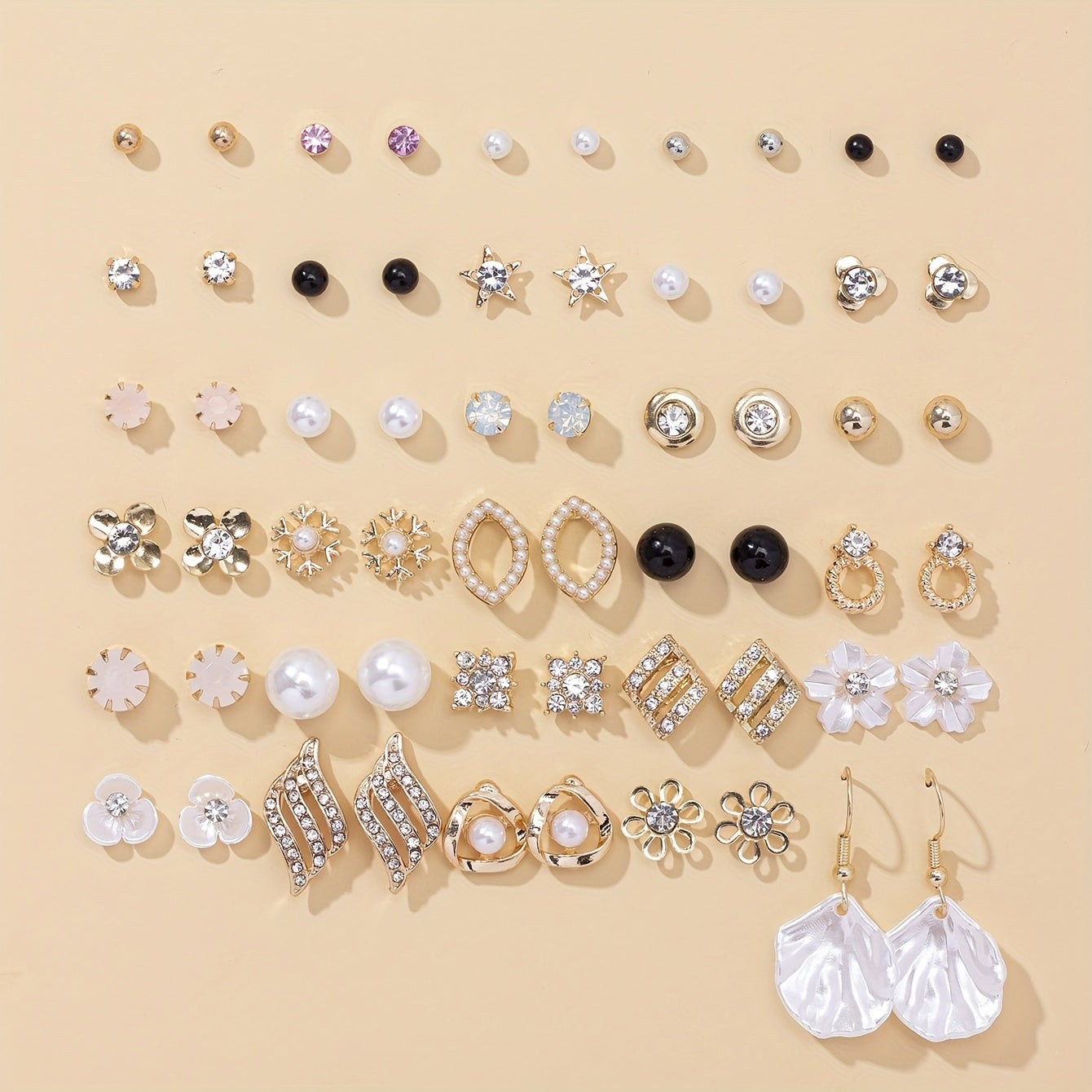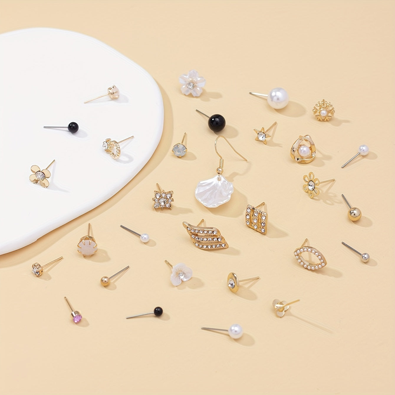 This set includes 30 pairs of stud earrings featuring shells, snowflakes, stars, small flowers, and faux pearls. Perfect for adding a touch of elegance to any outfit.