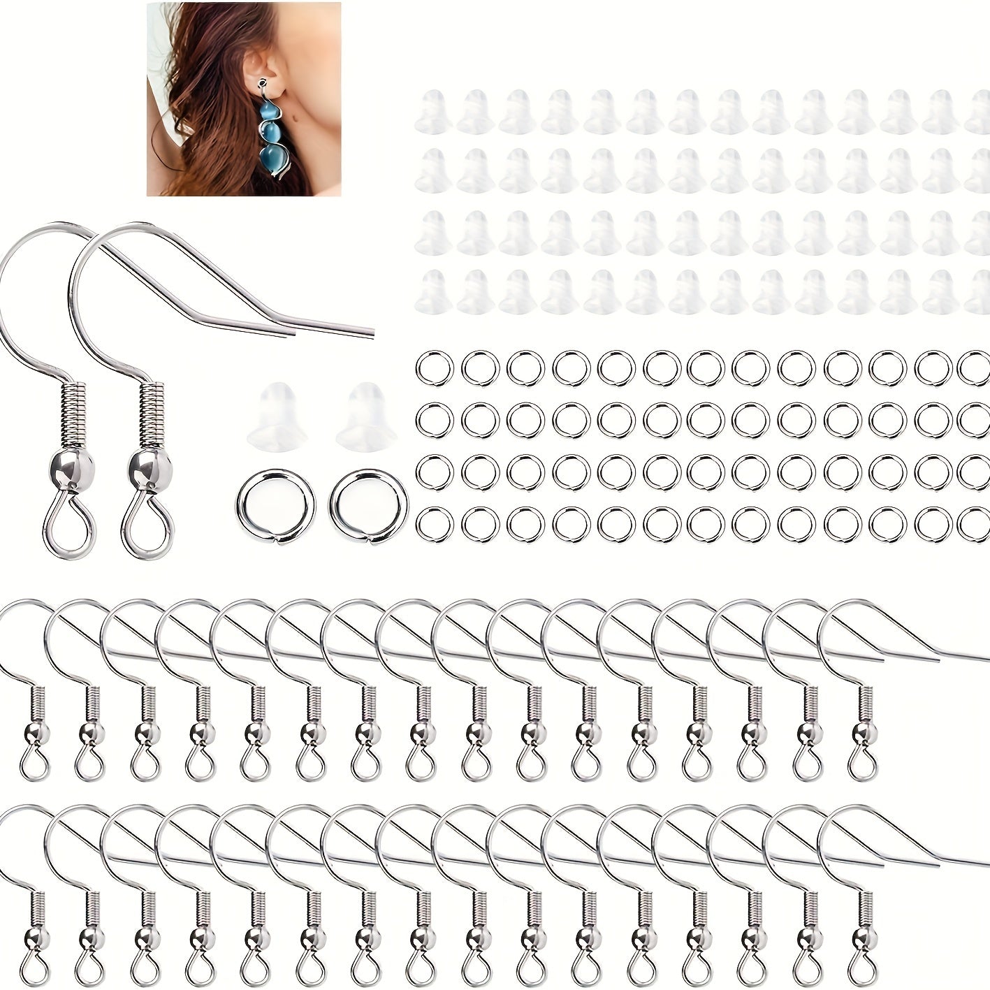This kit includes hypoallergenic silver earring hooks, open jump rings, and earring backs for making DIY earrings. Perfect for crafting unique jewelry pieces.