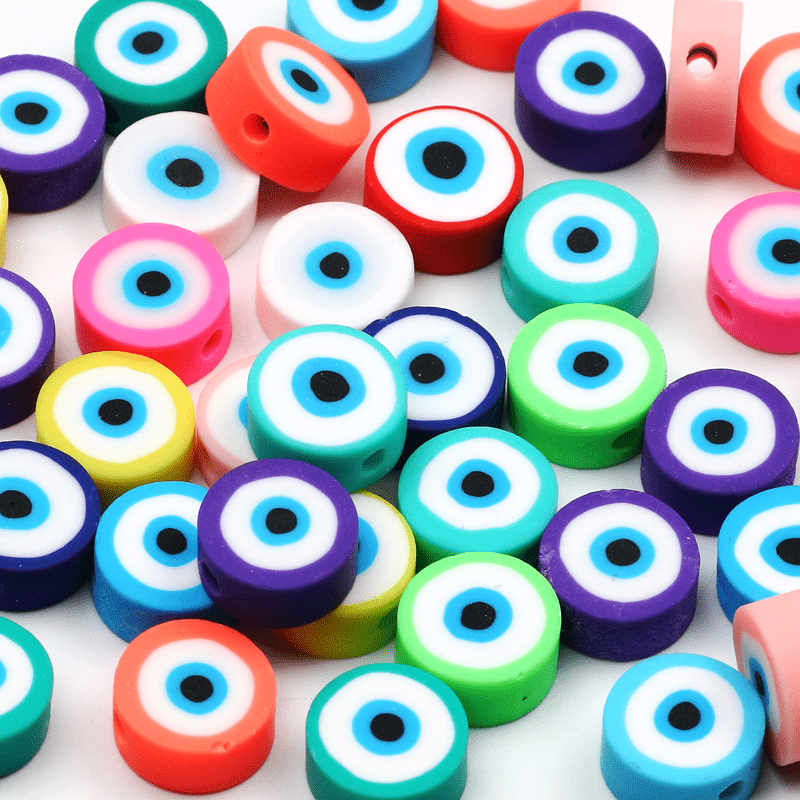 Get creative with this set of 30 mixed eyes pattern flat round polymer clay beads. These loose spacer beads are perfect for adding unique charm to your jewelry projects.