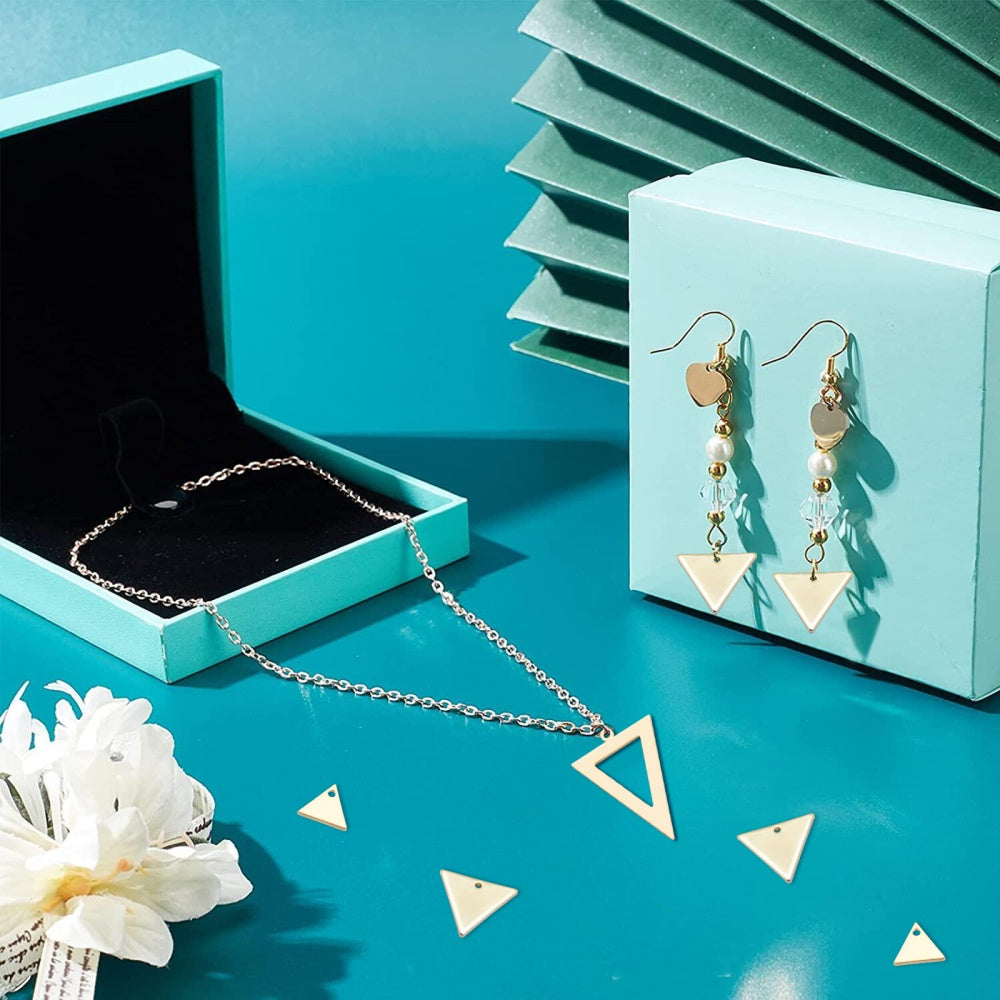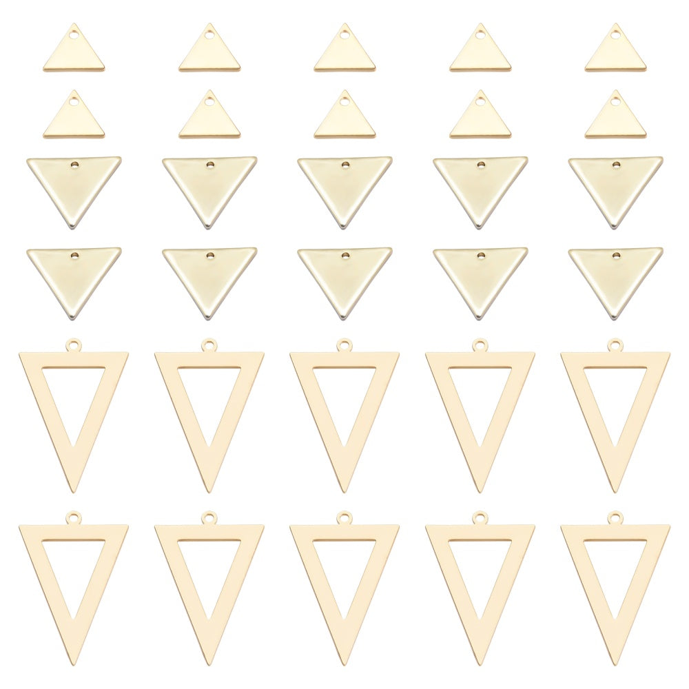 Explore your creativity with this set of 30 triangle charms ideal for DIY jewelry making. Made of real 18K golden plated brass, these hollow geometric dangles are perfect for earrings, necklaces, and bracelets.