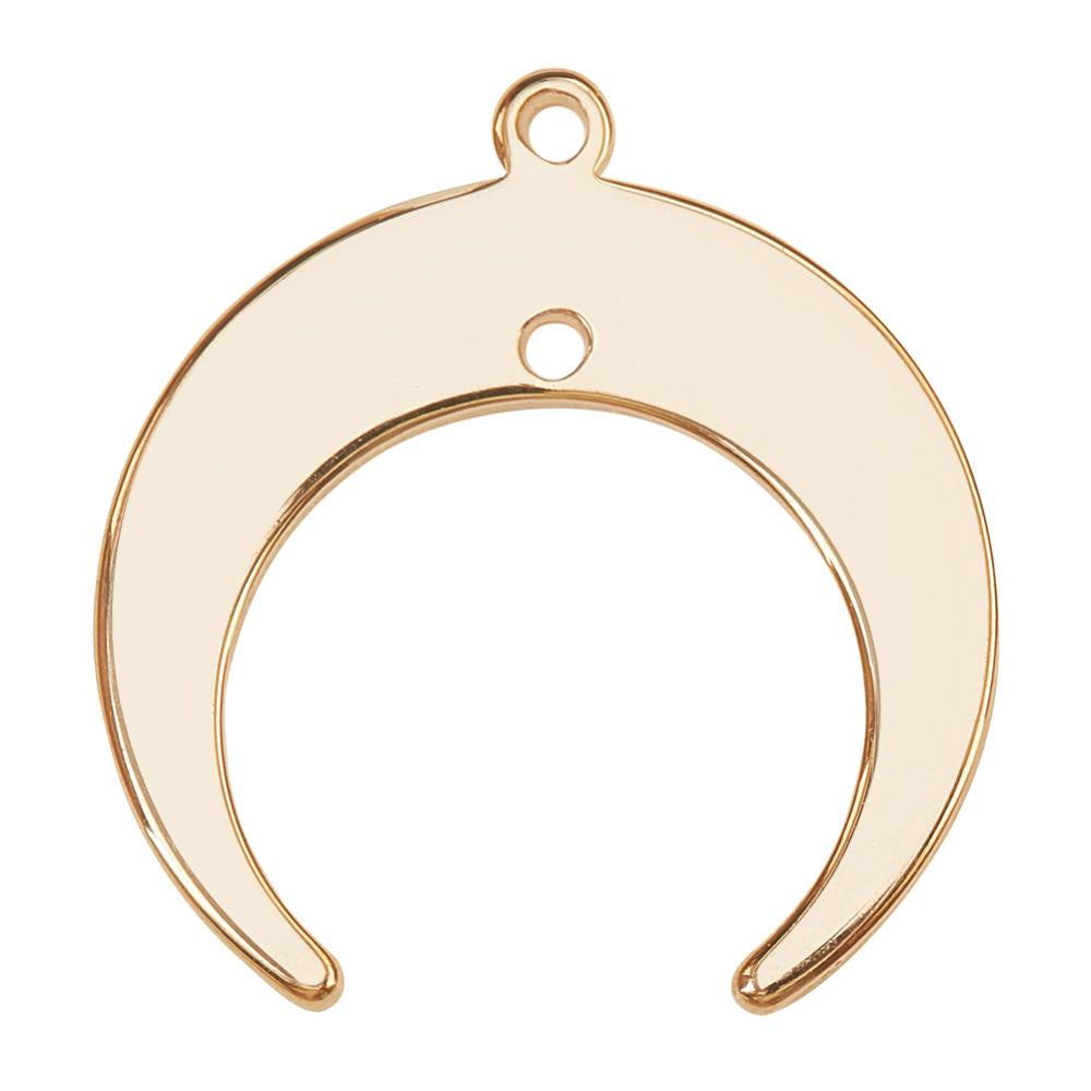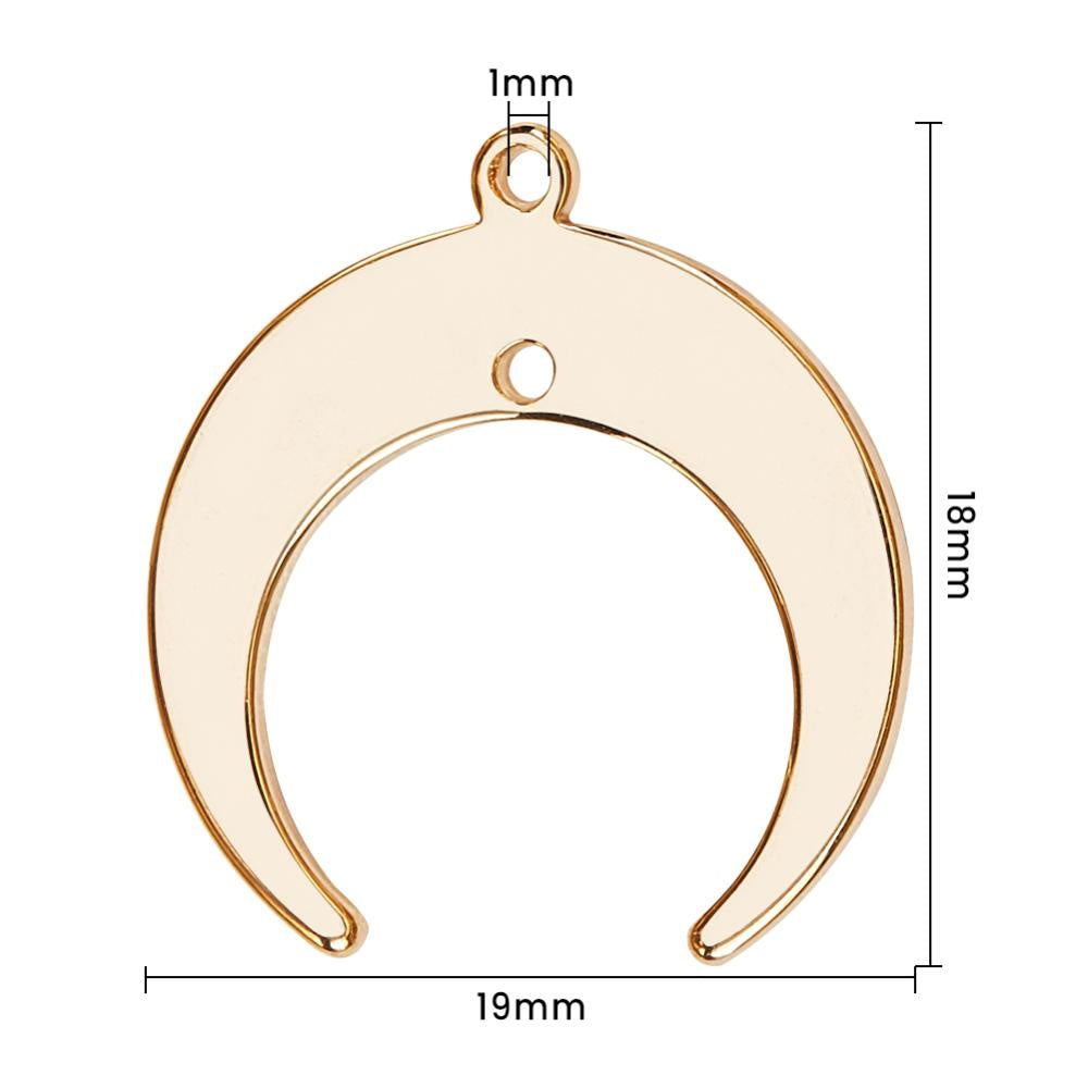 Enhance your jewelry with these 18K golden plated crescent moon charms. With two holes, they are perfect for creating unique DIY pieces. Each charm measures 19x18x1mm.
