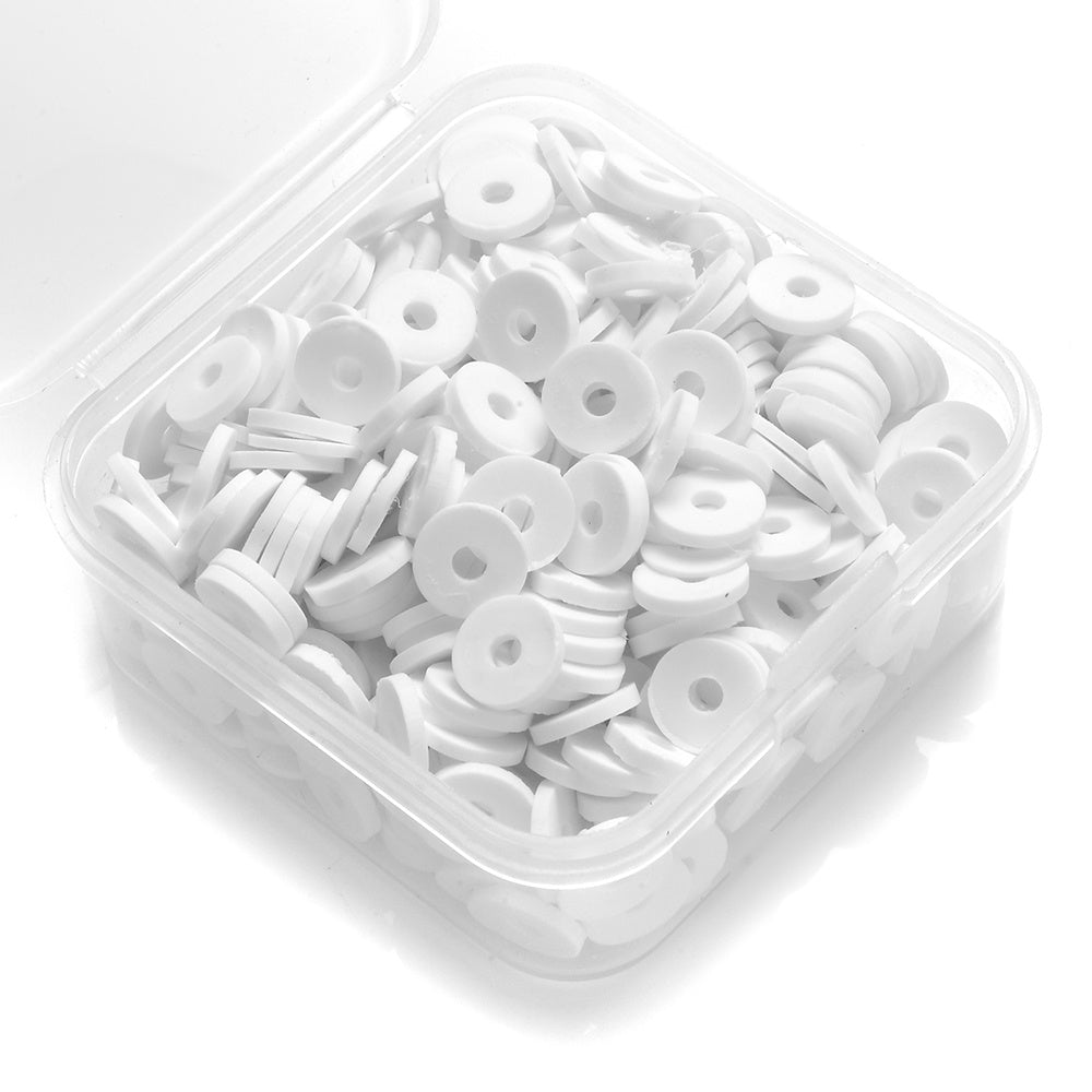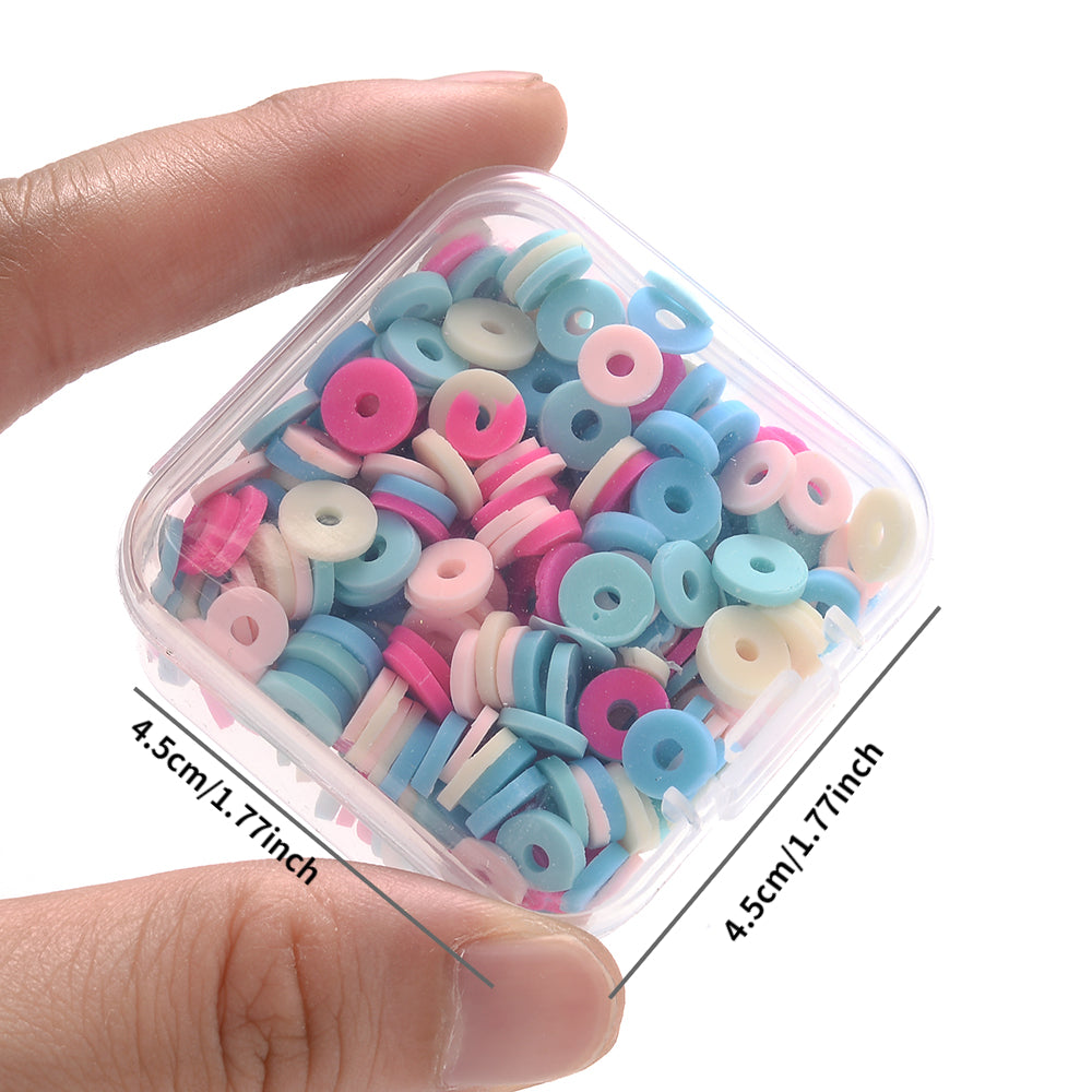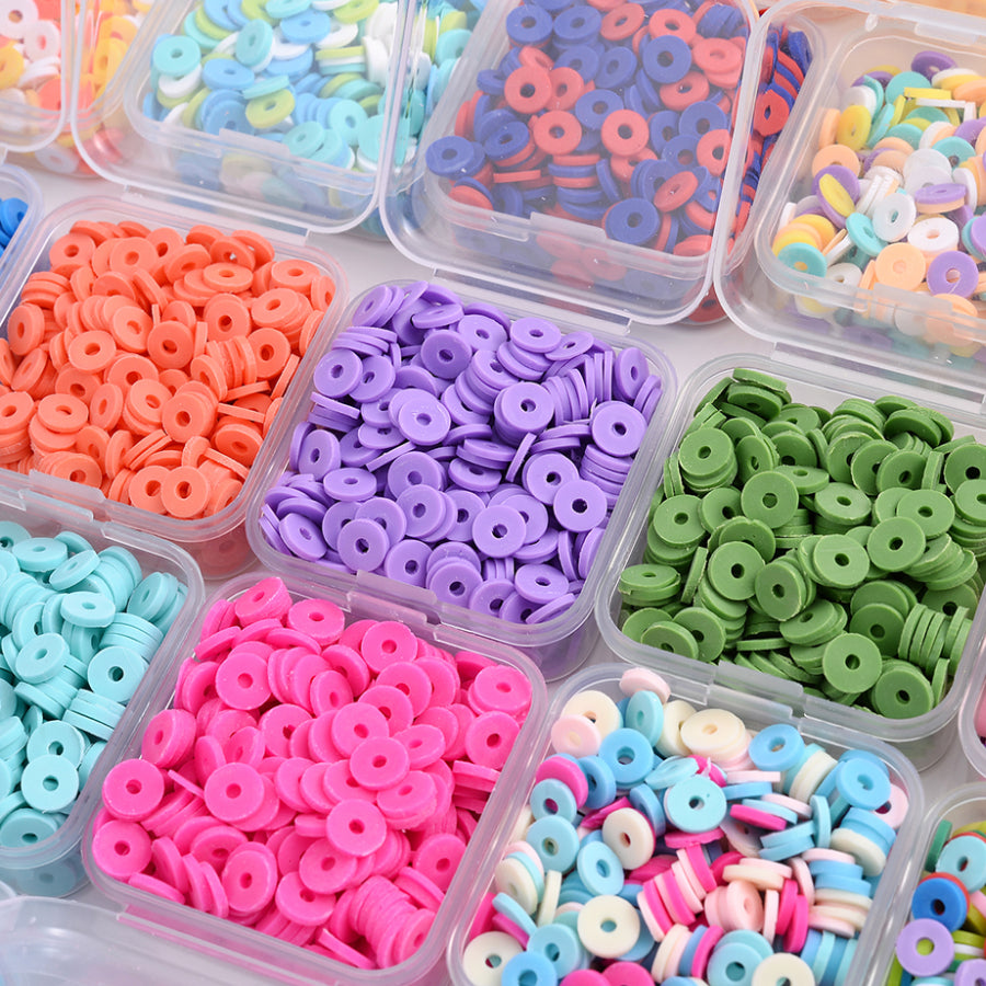 This box contains a mix of flat round spacer beads made of polymer clay, perfect for creating unique jewelry pieces. The beads are 6mm in size and come in a variety of colors.