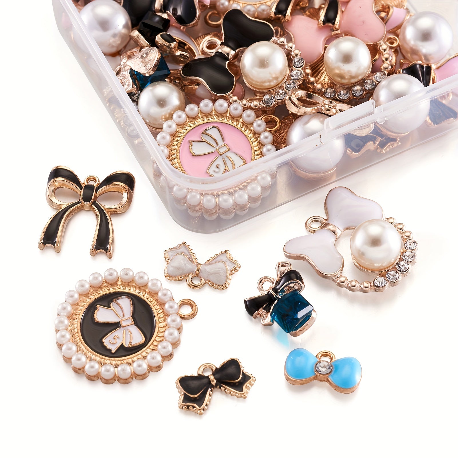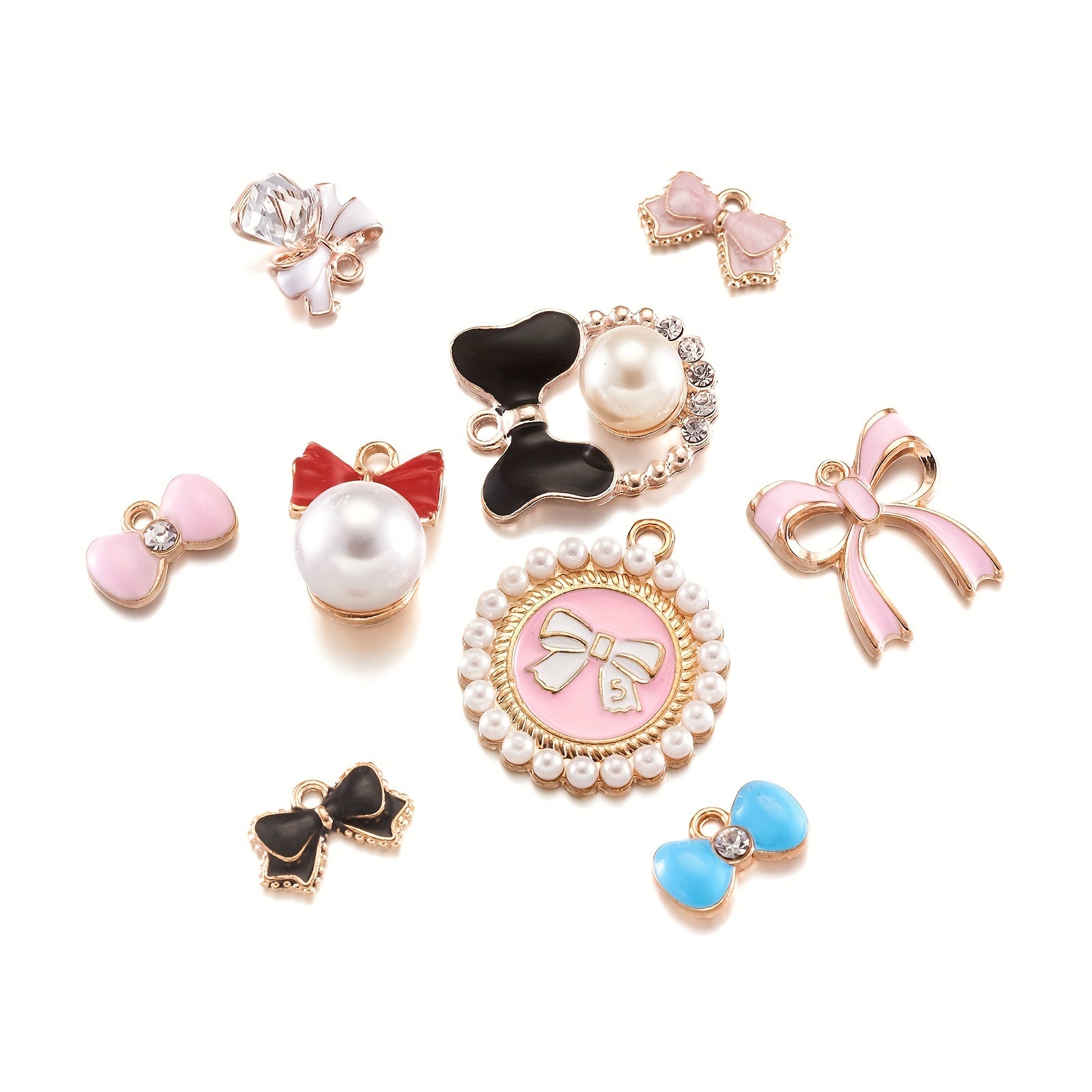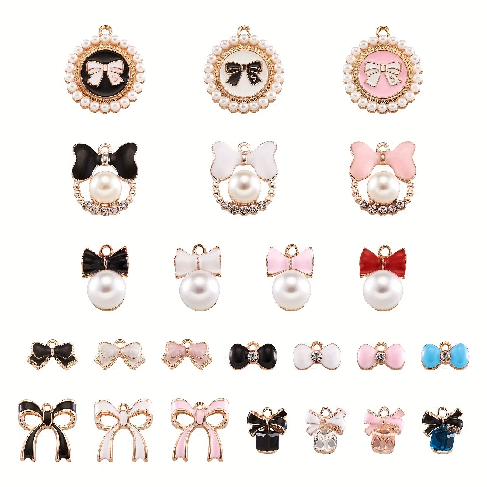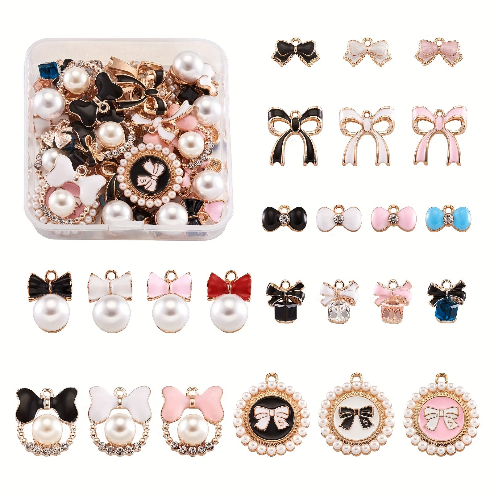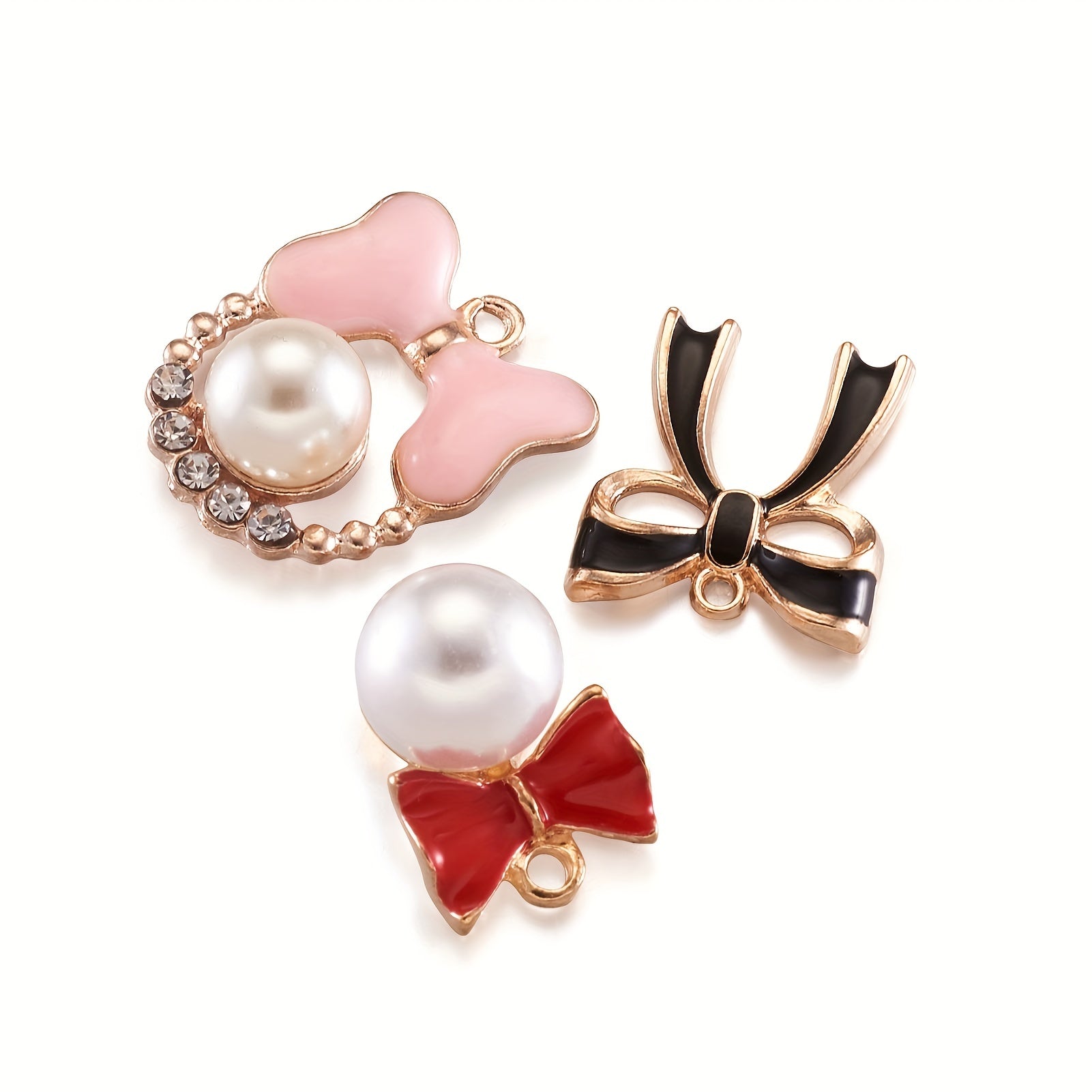 This box contains 48 light golden faux pearl bowknot enamel pendants with a hole size of 1.5mm. Perfect for creating your own bracelets, necklaces, and other jewelry pieces.