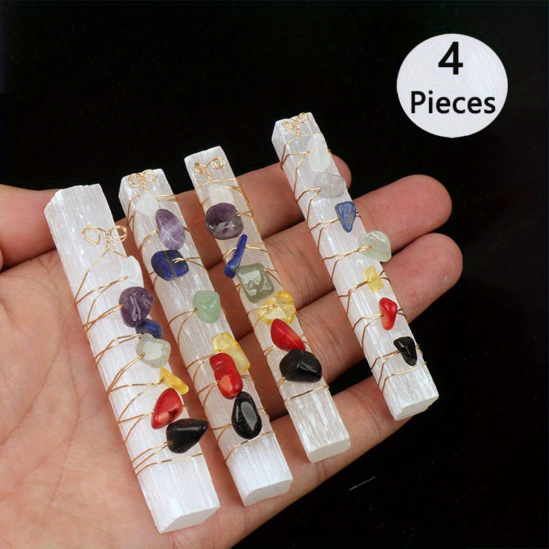 Embrace the power of healing with this set of 4 Chakra stones, wire-wrapped around a raw Selenite stick wand. Perfect for yoga, meditation, spiritual practices, and Reiki balancing.