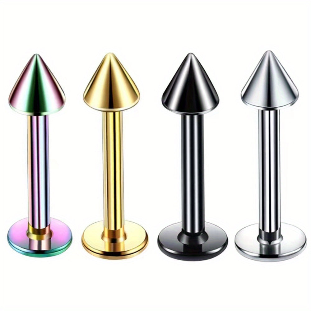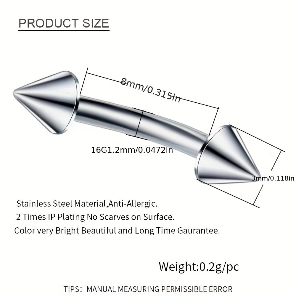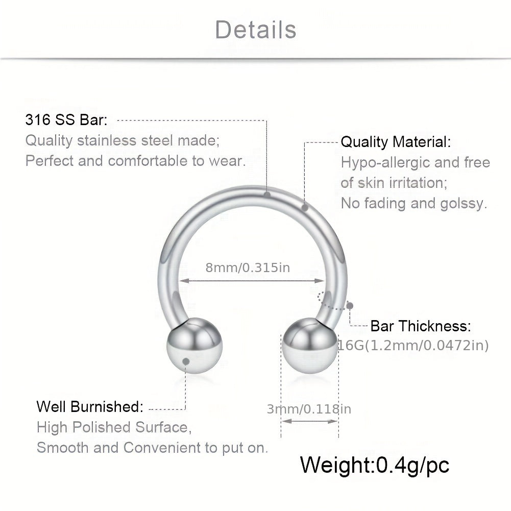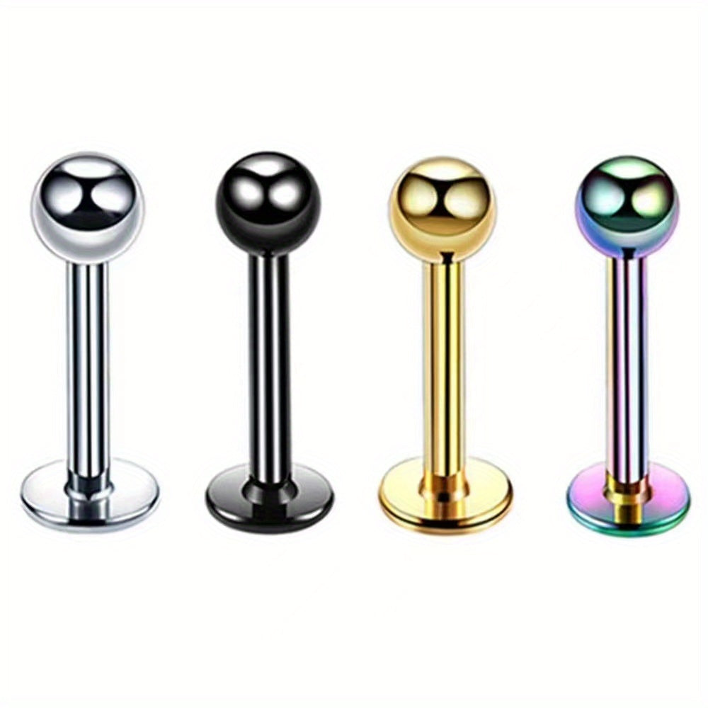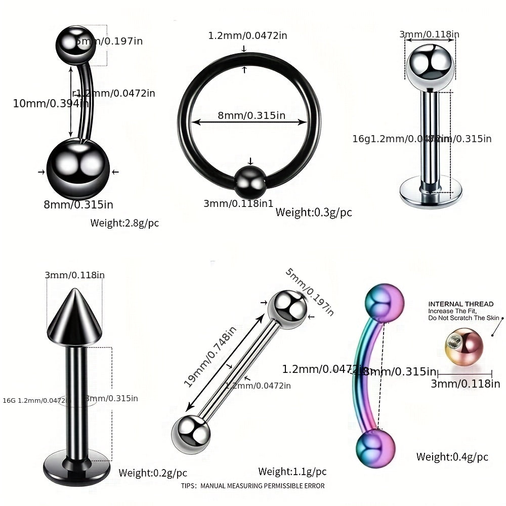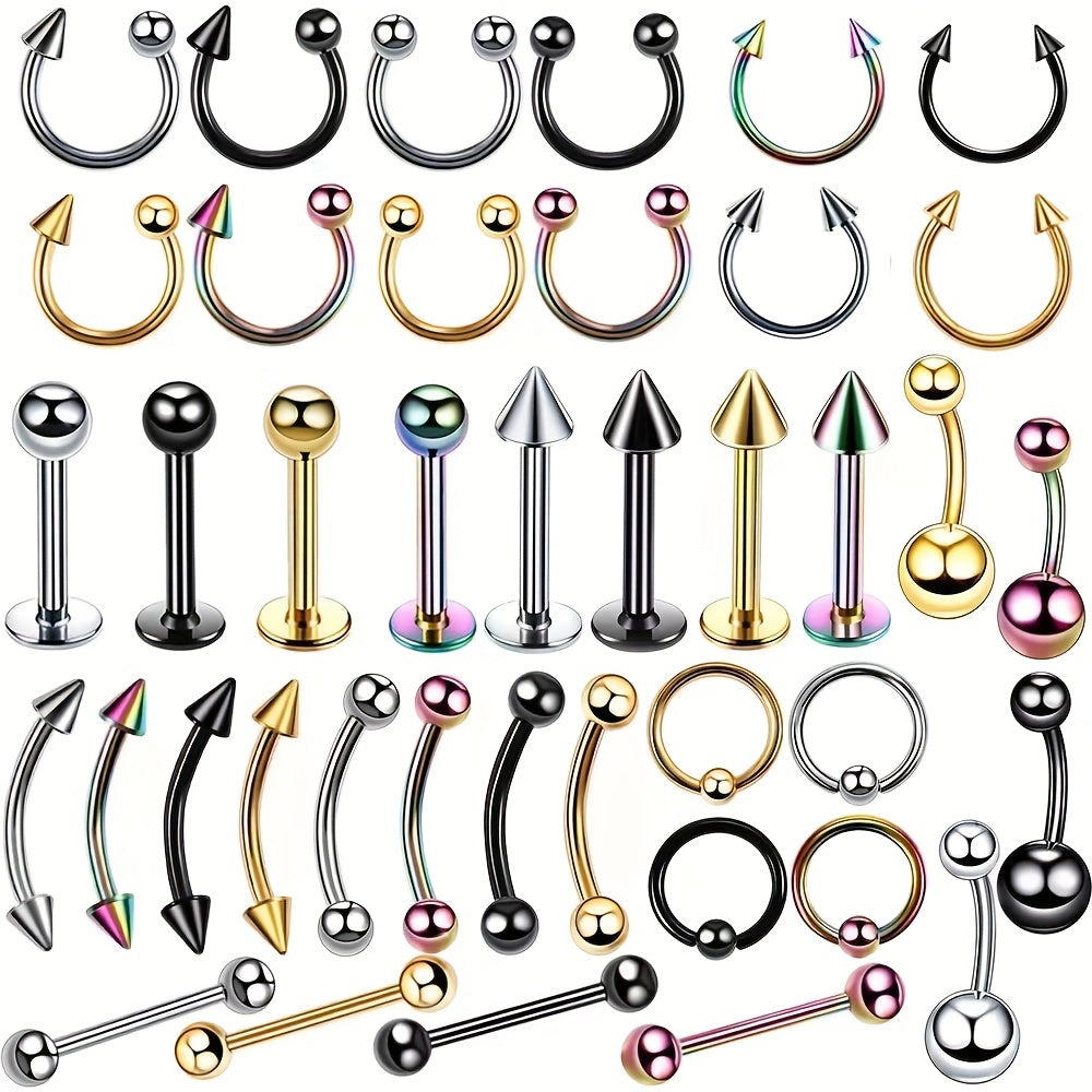 This set includes 4 stainless steel body piercing accessories for nose, navel, eyebrow, and tongue. Suitable for both male and female piercings.