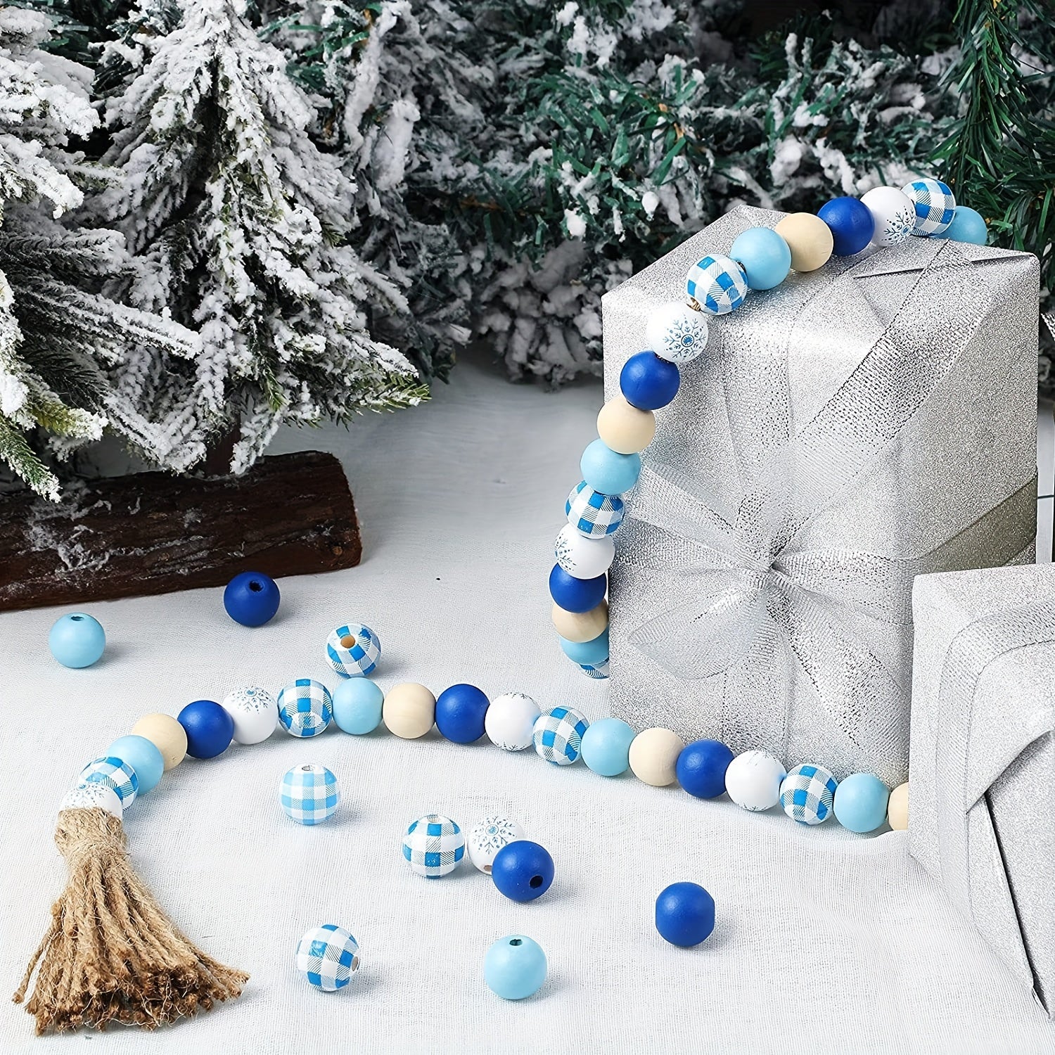 Add a festive touch to your home decor with this set of 50 Christmas-themed wooden beads. Featuring snowflake patterns and plaid designs, these round beads are perfect for DIY projects and party decorations.