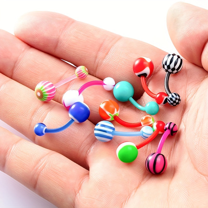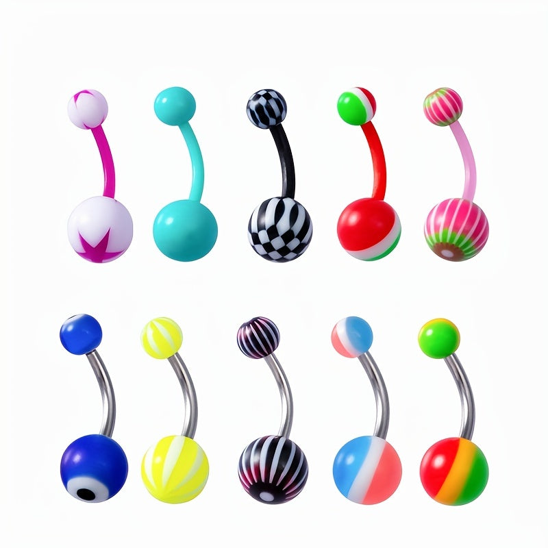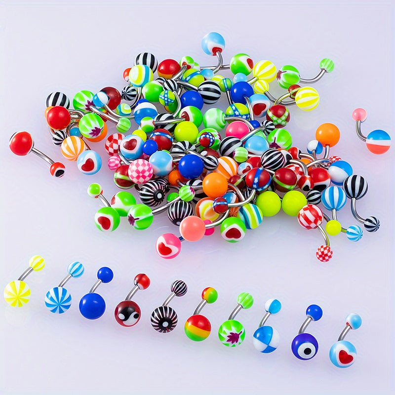 Add vibrant colors to your belly button piercing with this set of 50 colorful acrylic plastic ball belly button rings. Each ring has a stainless steel barbell for added safety and durability. Random assortment of colors.