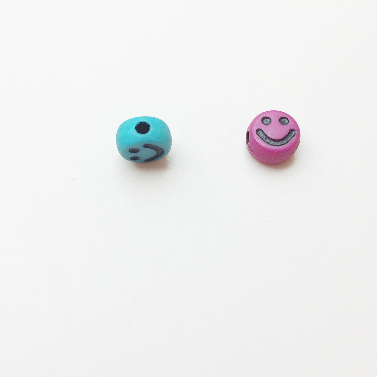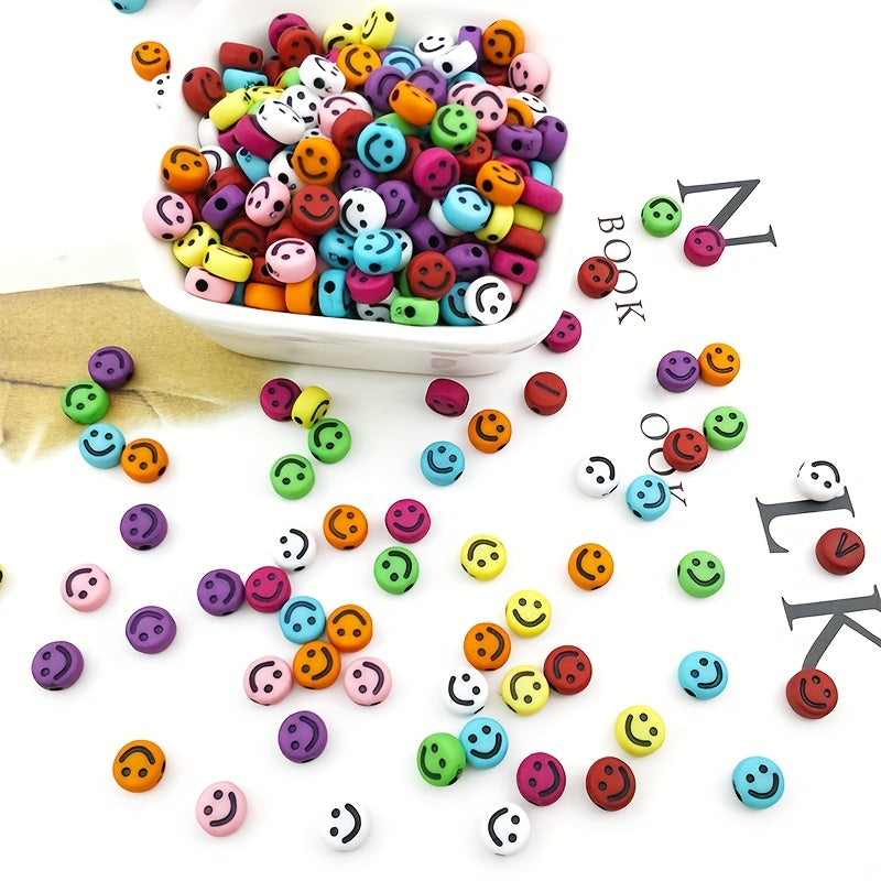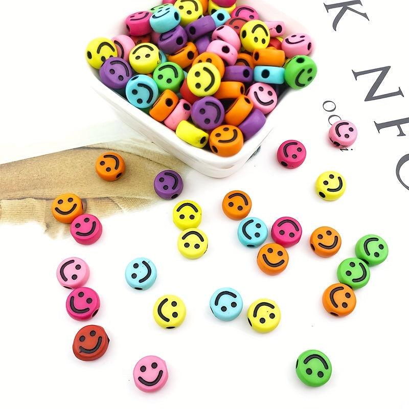 Add fun and charm to your jewelry pieces with these colorful round beads featuring smiling faces and random letters. Perfect for creating unique bracelets, necklaces, and earrings.