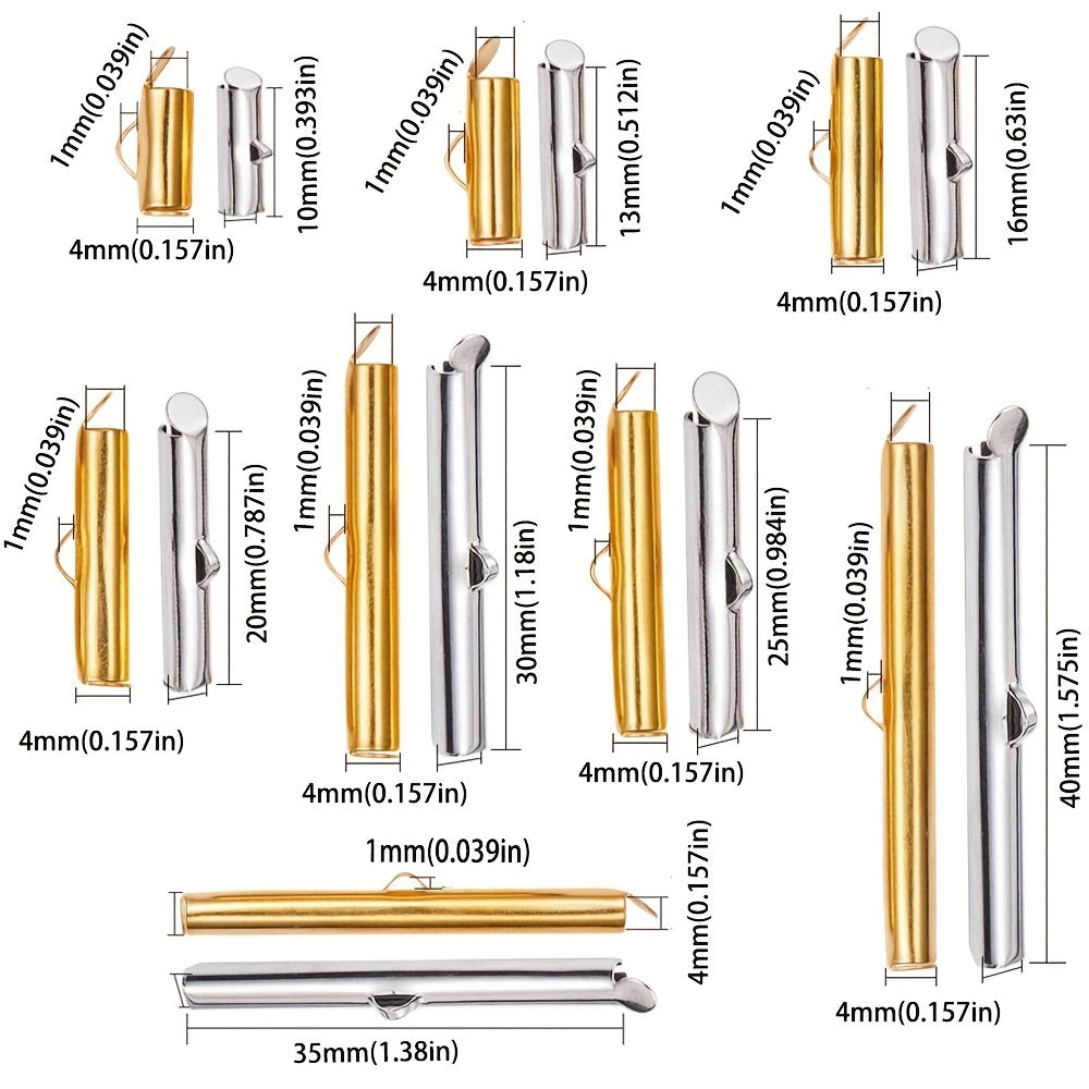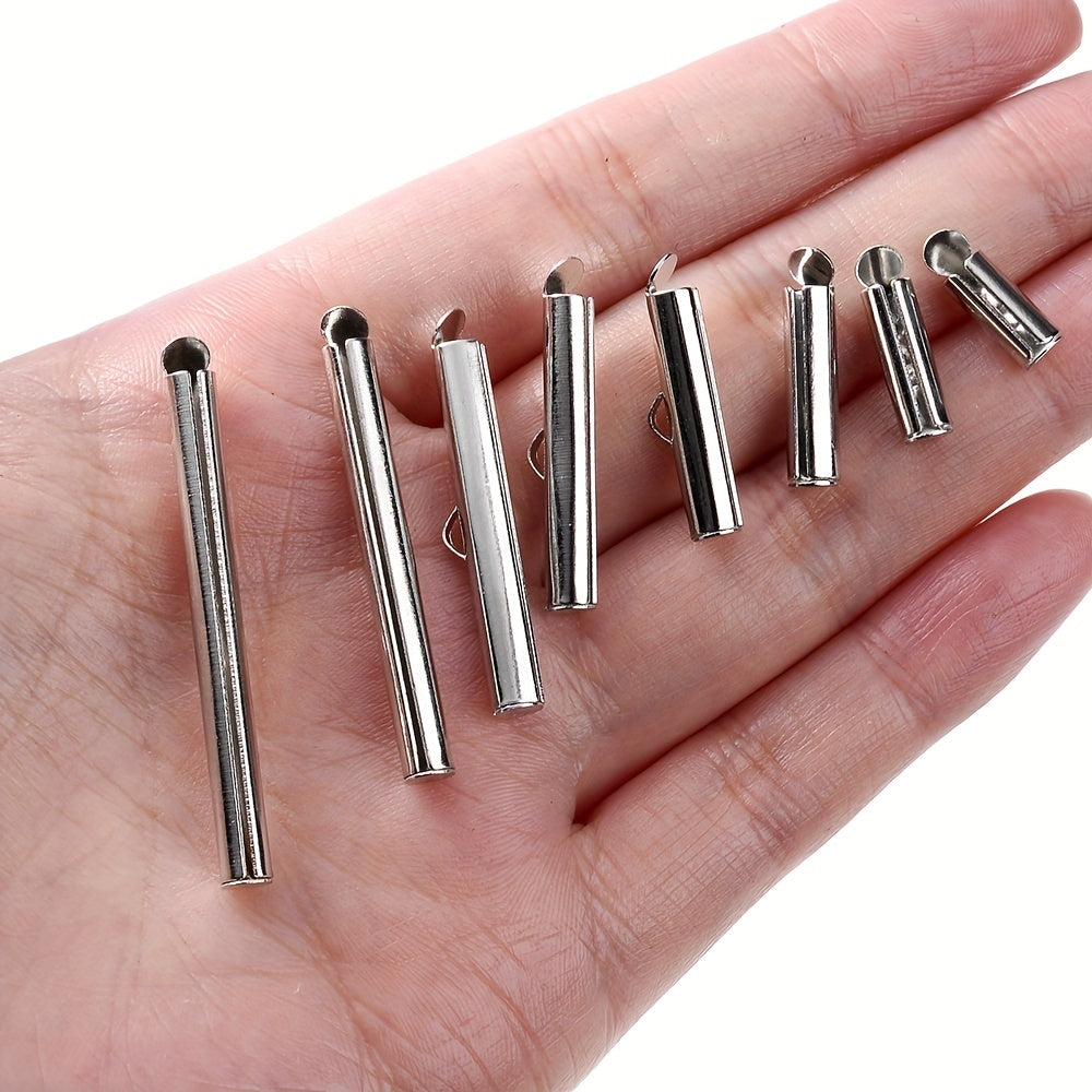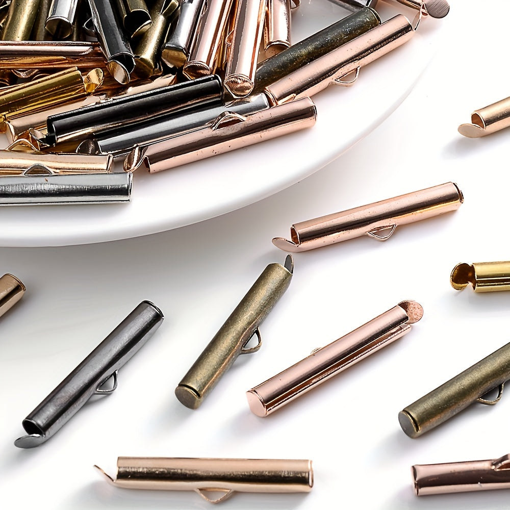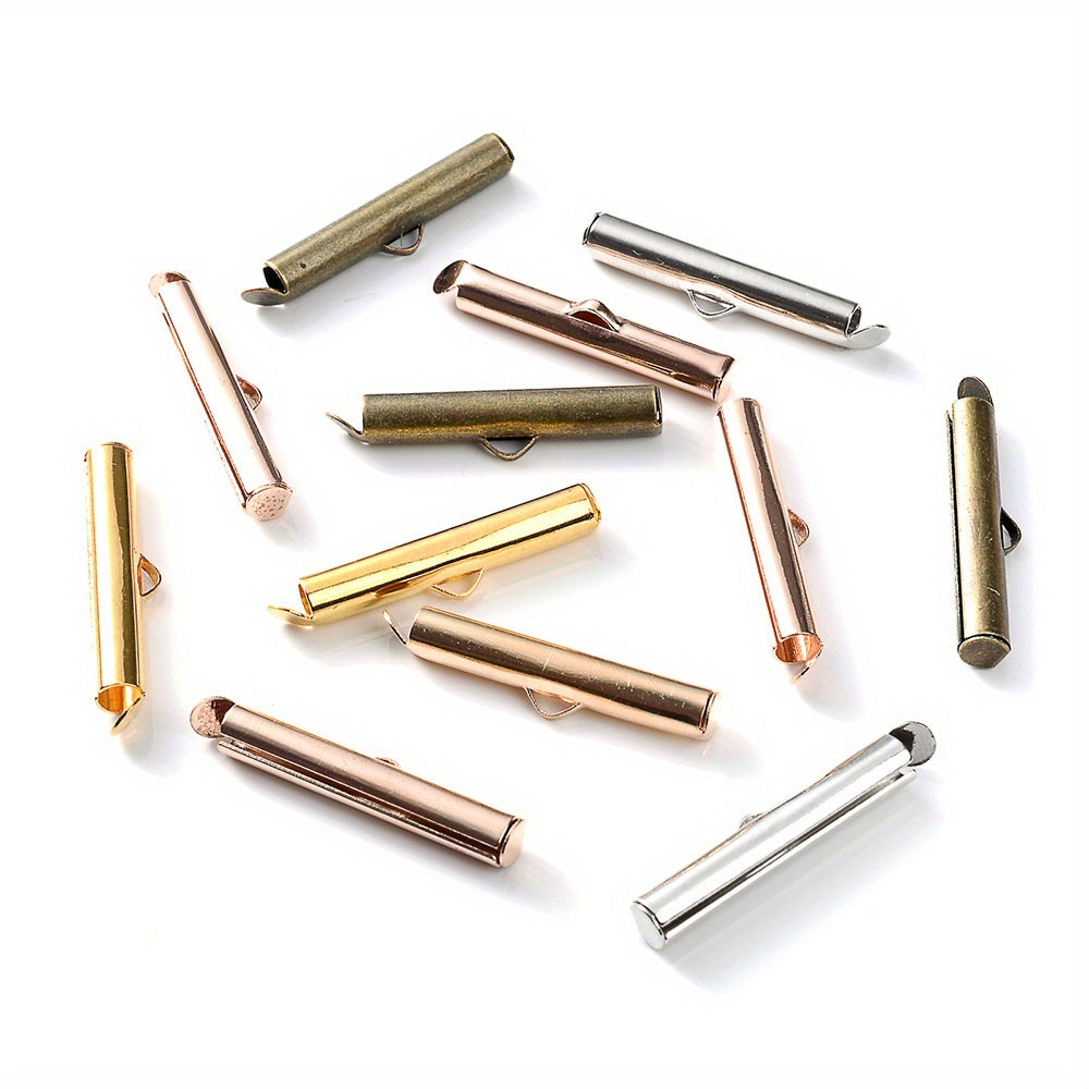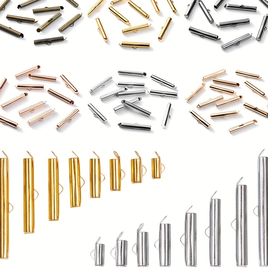 Enhance your jewelry making projects with this set of 50 crimp end caps, slider clasps, and buckles. Perfect for creating necklaces and bracelets.