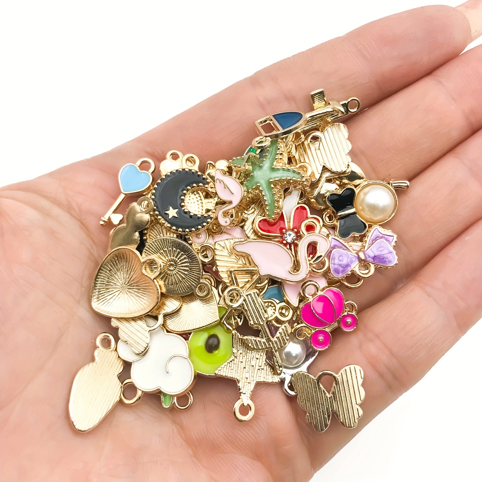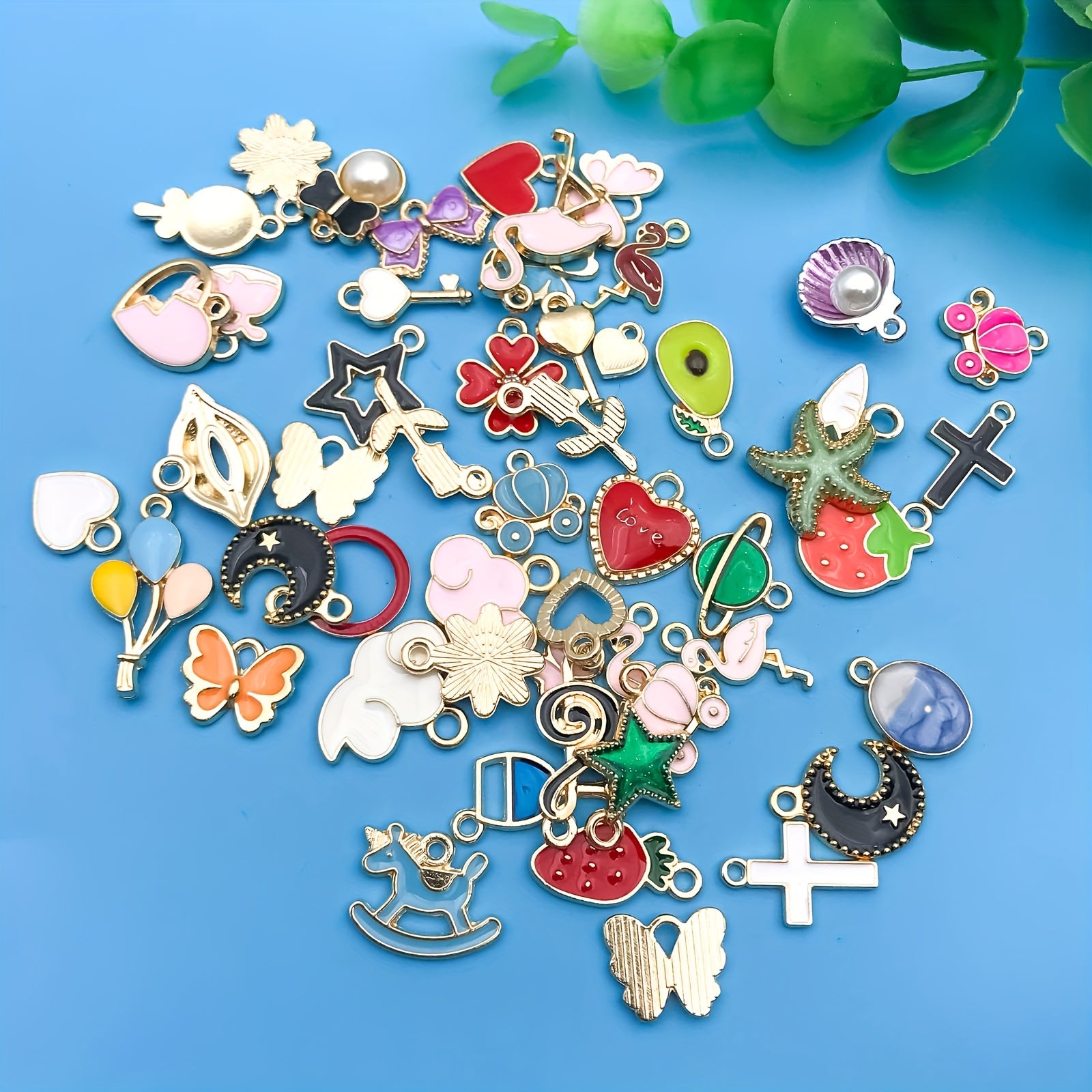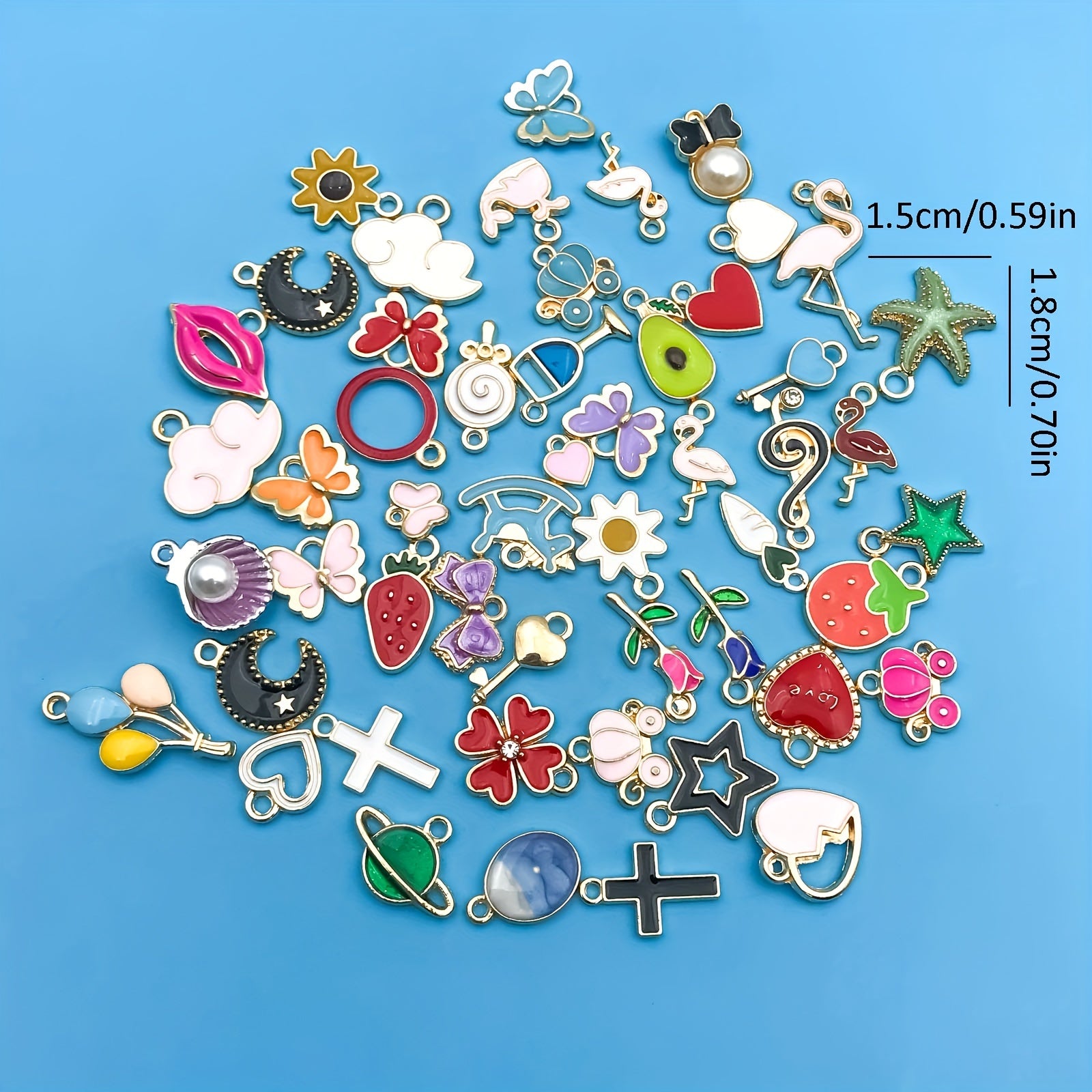 Enhance your crafting projects with this set of 50 enamel mix flowers heart shaped charms pendants. Ideal for creating necklaces, bracelets, earrings, and more.