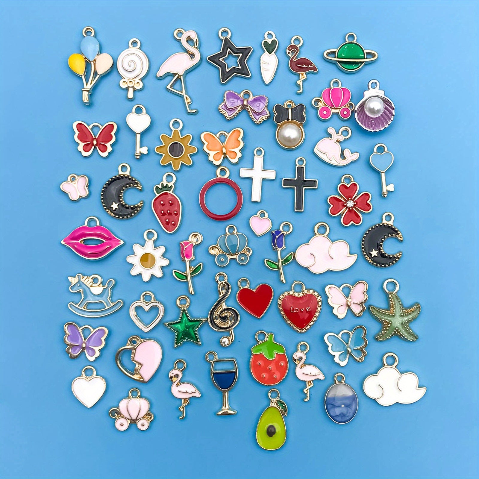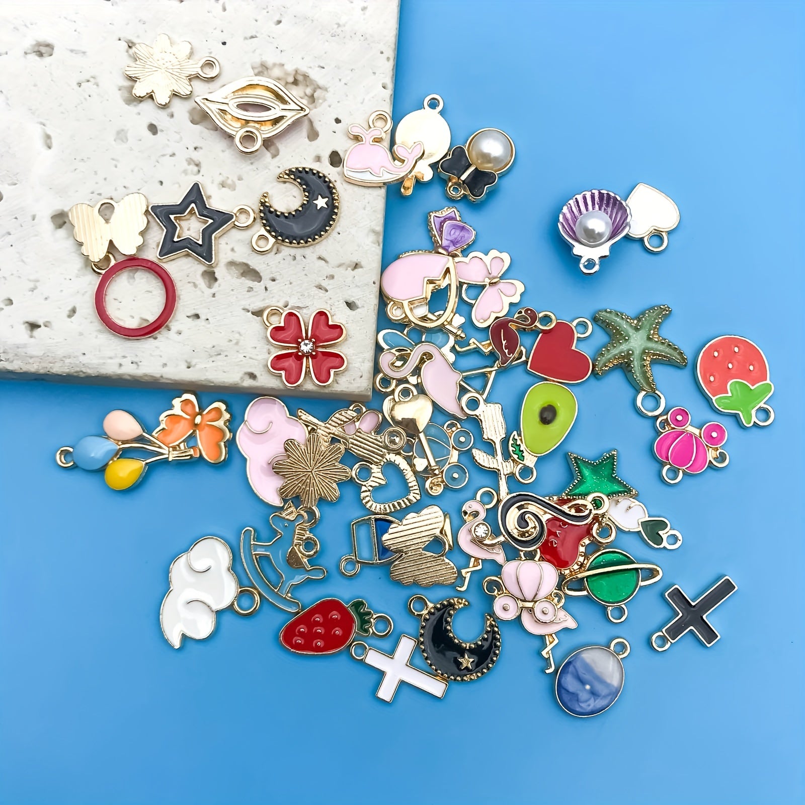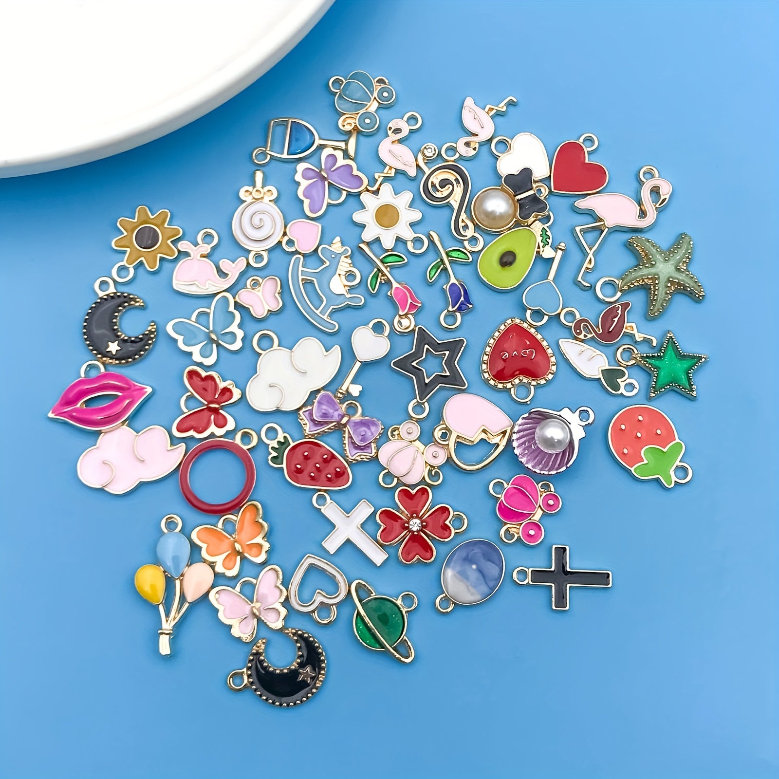 Enhance your crafting projects with this set of 50 enamel mix flowers heart shaped charms pendants. Ideal for creating necklaces, bracelets, earrings, and more.