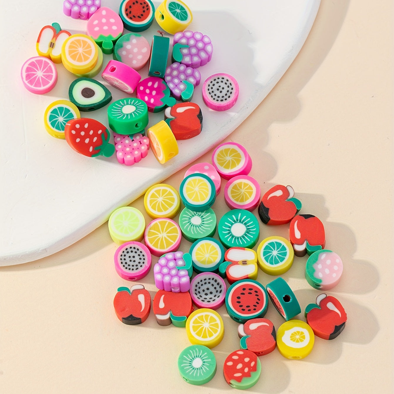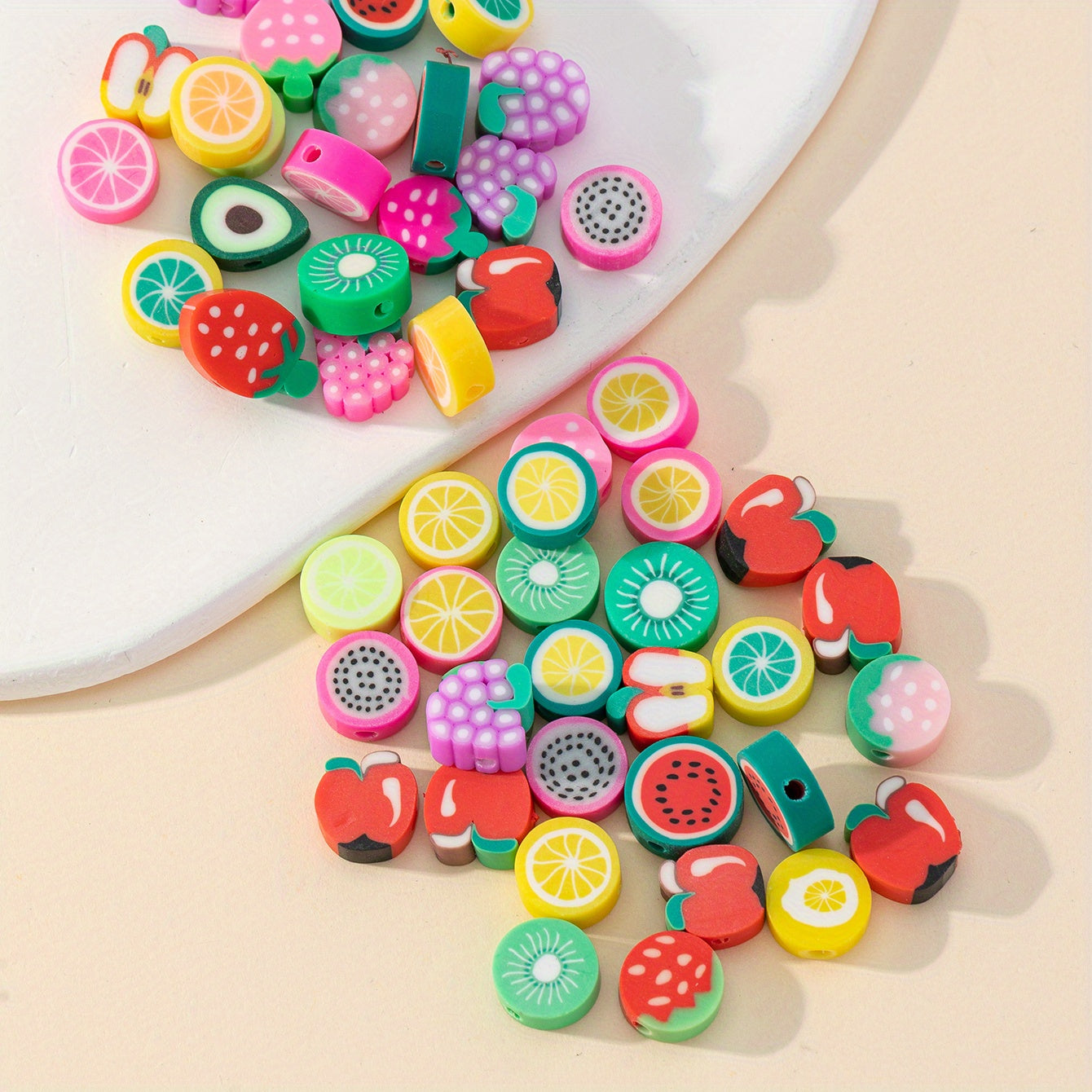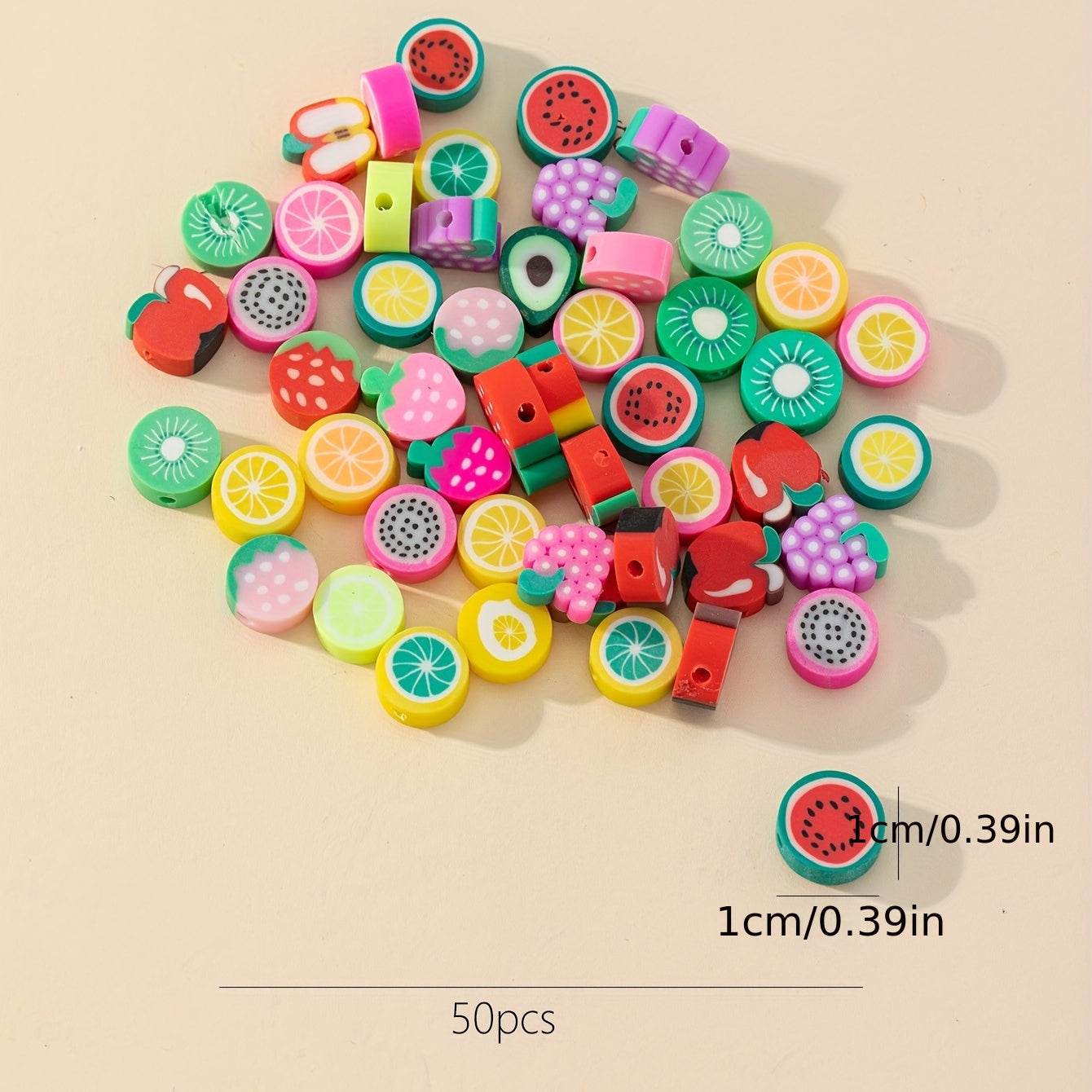 Enhance your jewelry making with this pack of 50 flat fruit pattern soft pottery beads. Perfect for creating earrings, bracelets, necklaces, and other accessories.