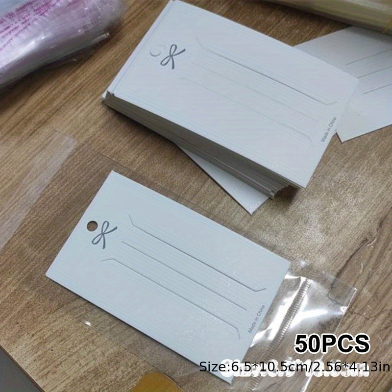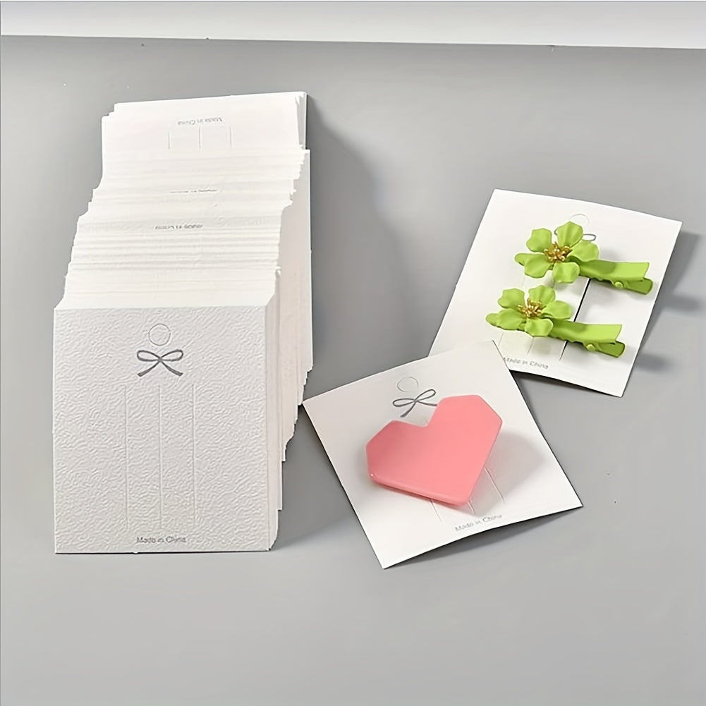 Get this pack of 50 hairpin card trinket bow display cards made of sturdy cardboard packing paper. Perfect for showcasing your hair accessories!