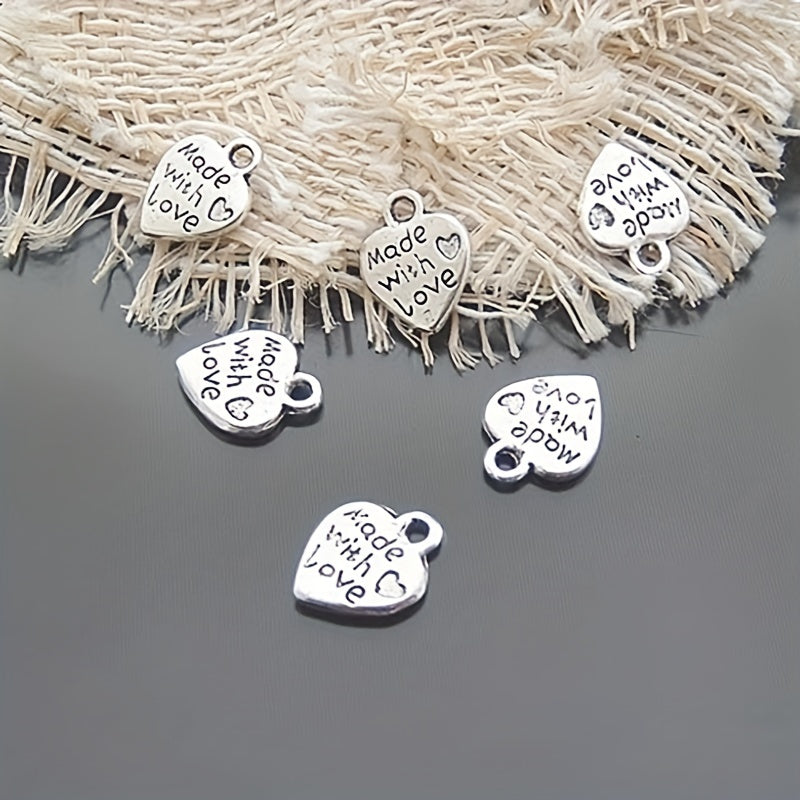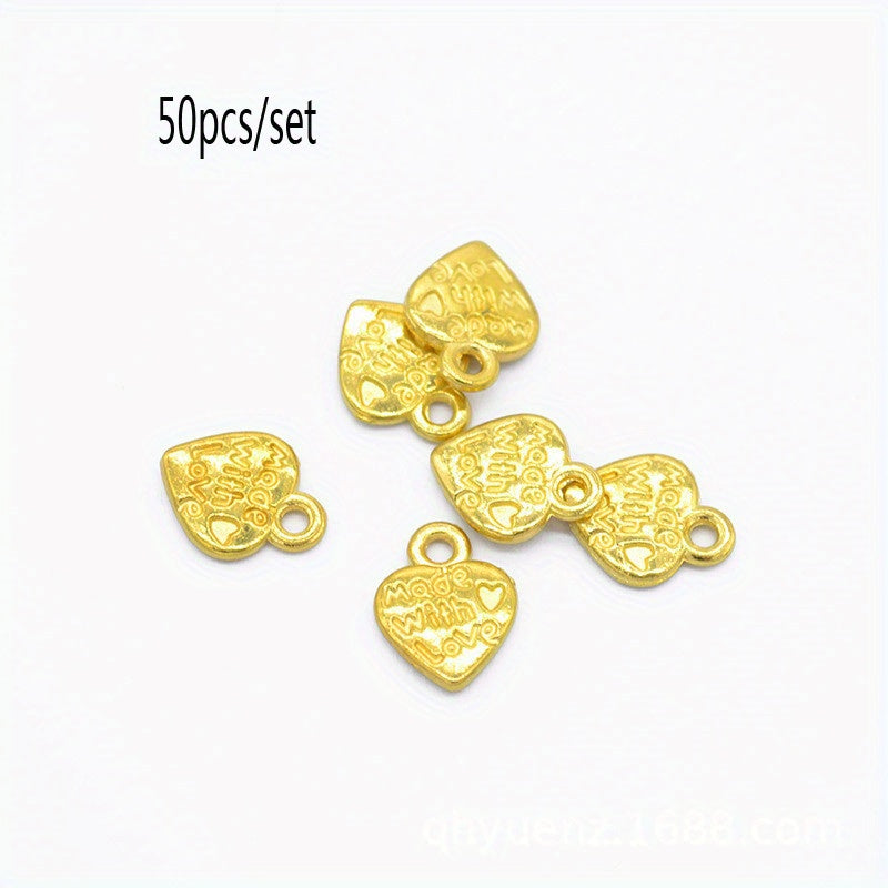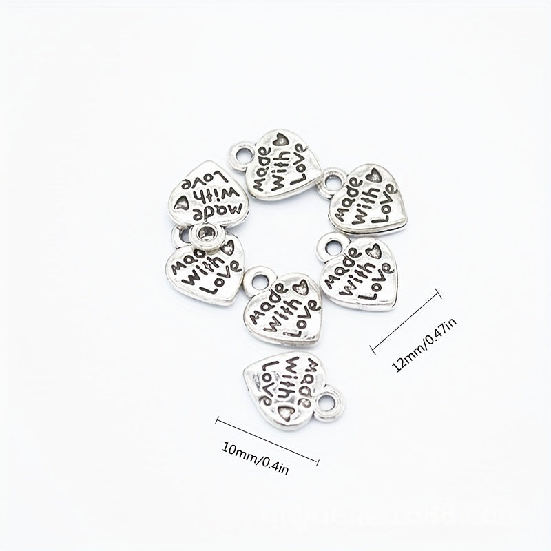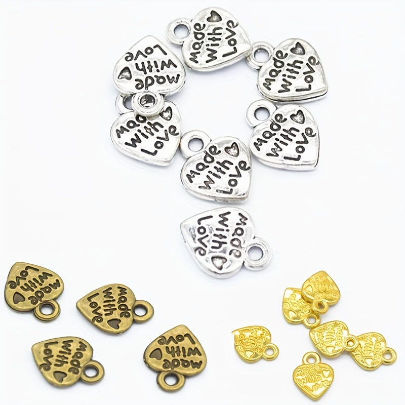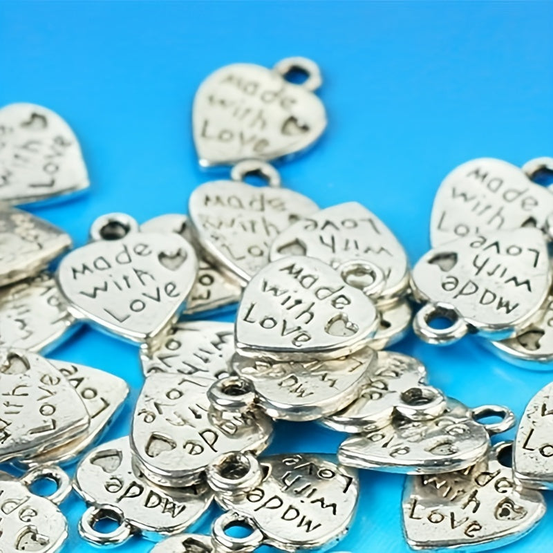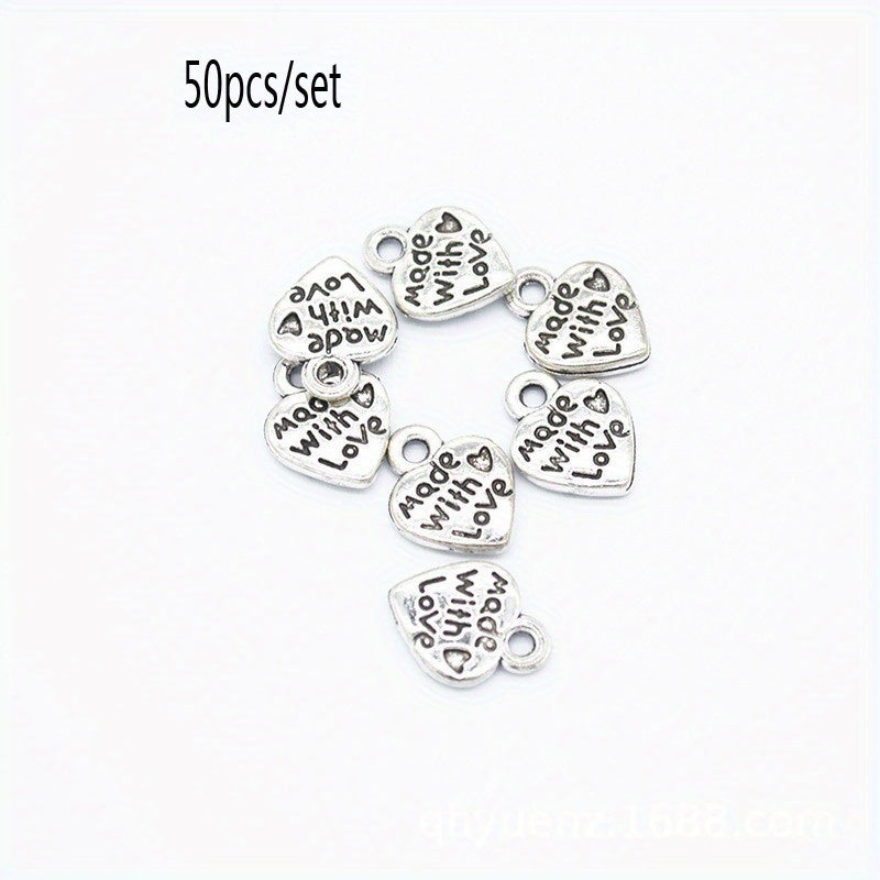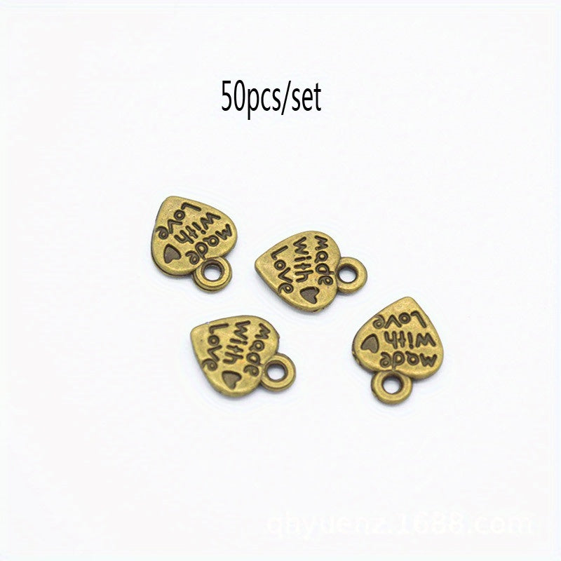 This set includes 50 heart charms in silvery, golden, and bronze plated finishes. Perfect for creating DIY pendants and jewelry pieces with a 'WITH LOVE' inscription.