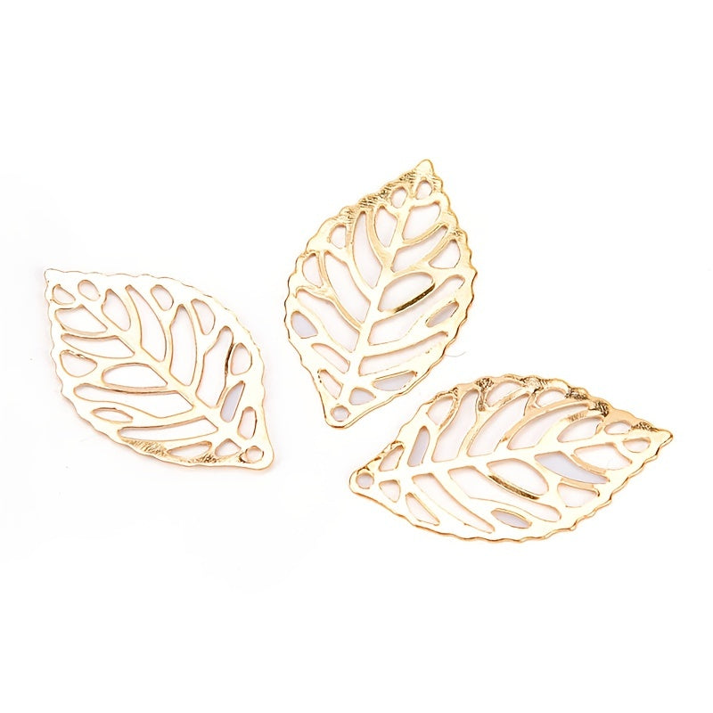 Enhance your jewelry making projects with this set of 50 hollow leaf pendants. These golden charms are perfect for adding a retro touch to your creations. They are made of filigree casted metal with electroplating for a high-quality finish. Use them to make DIY jewelry or embellish hair combs.