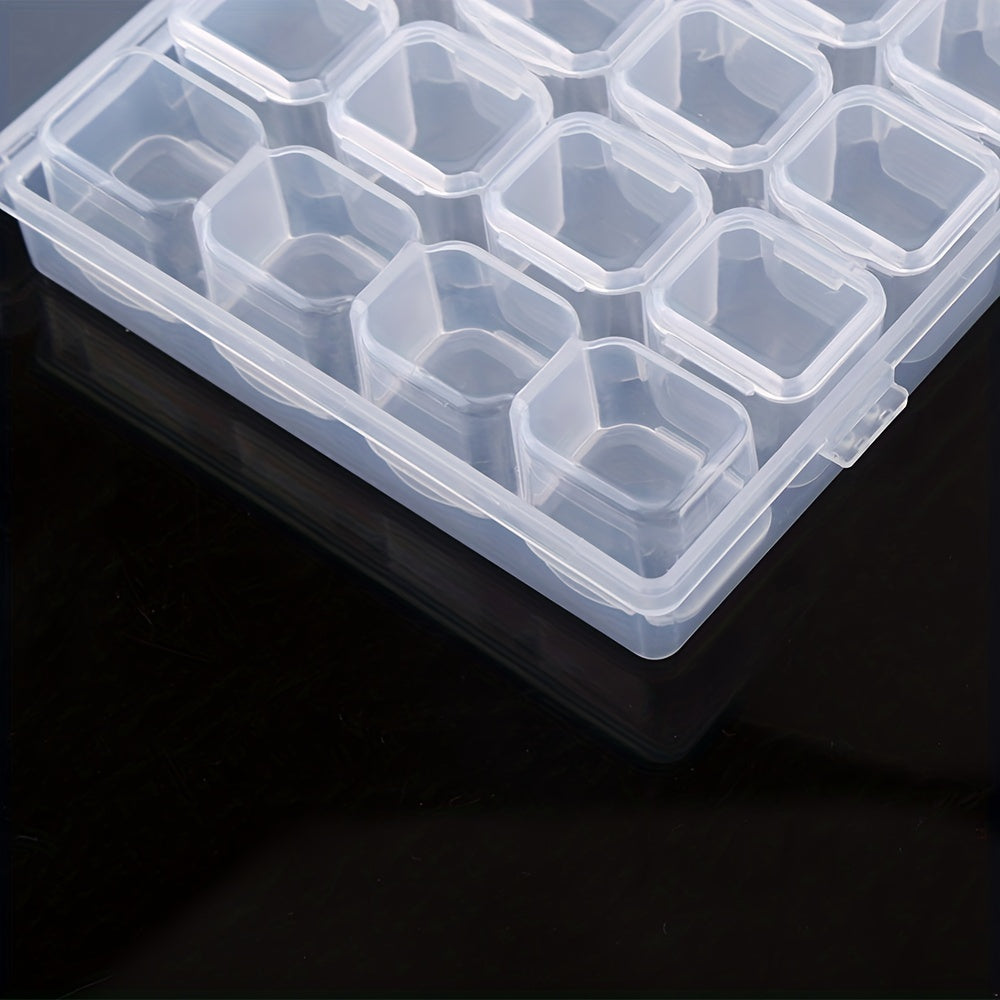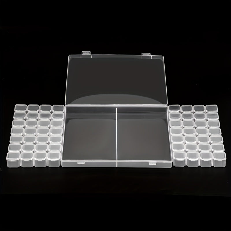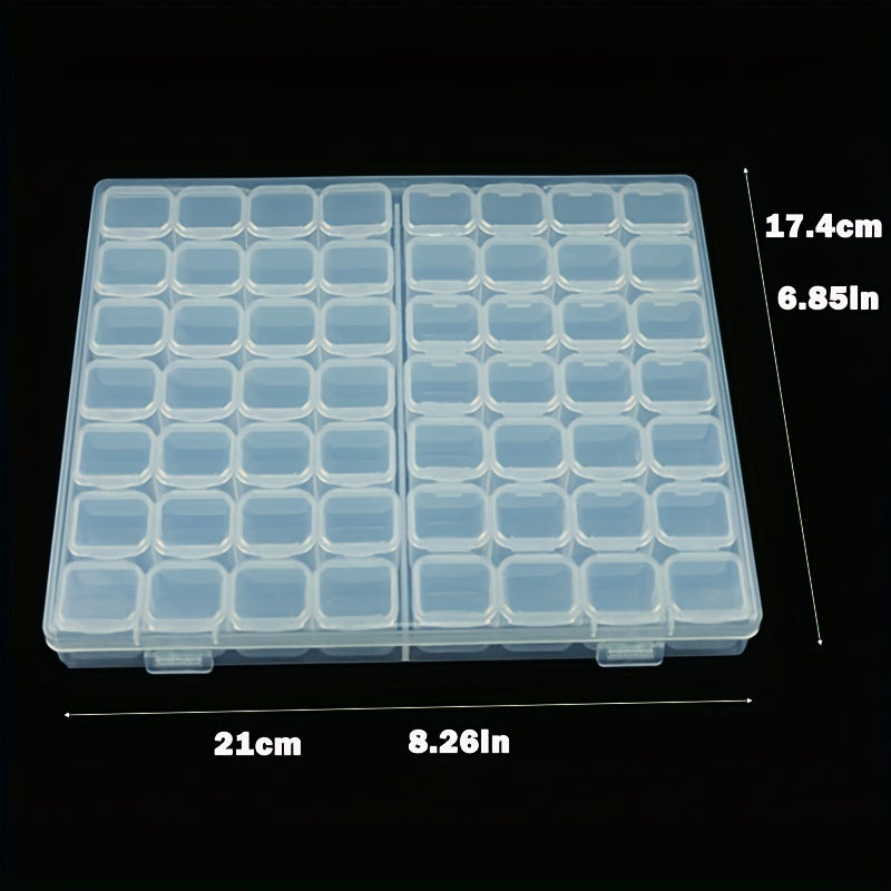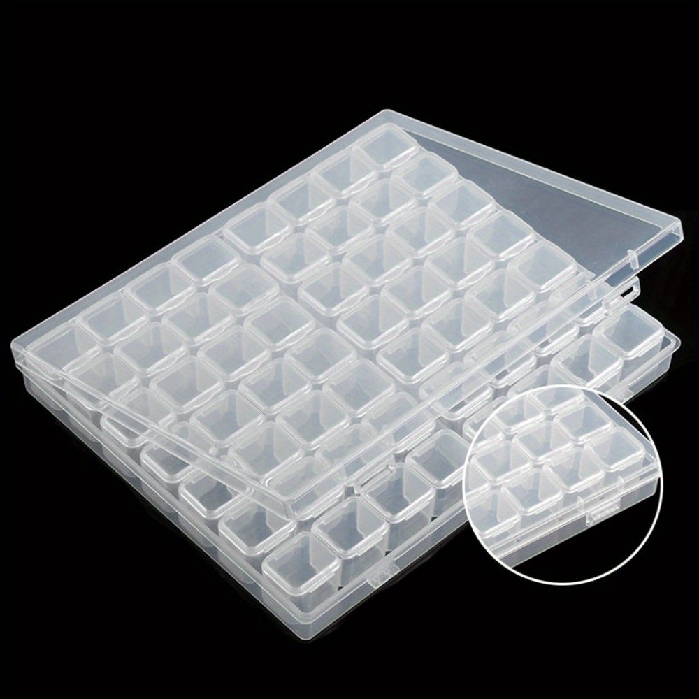This transparent jewelry storage box features 56 grids for organizing necklaces, bracelets, rings, earrings, keychains, beads, and more. It is made of durable plastic and has a removable design for easy access.