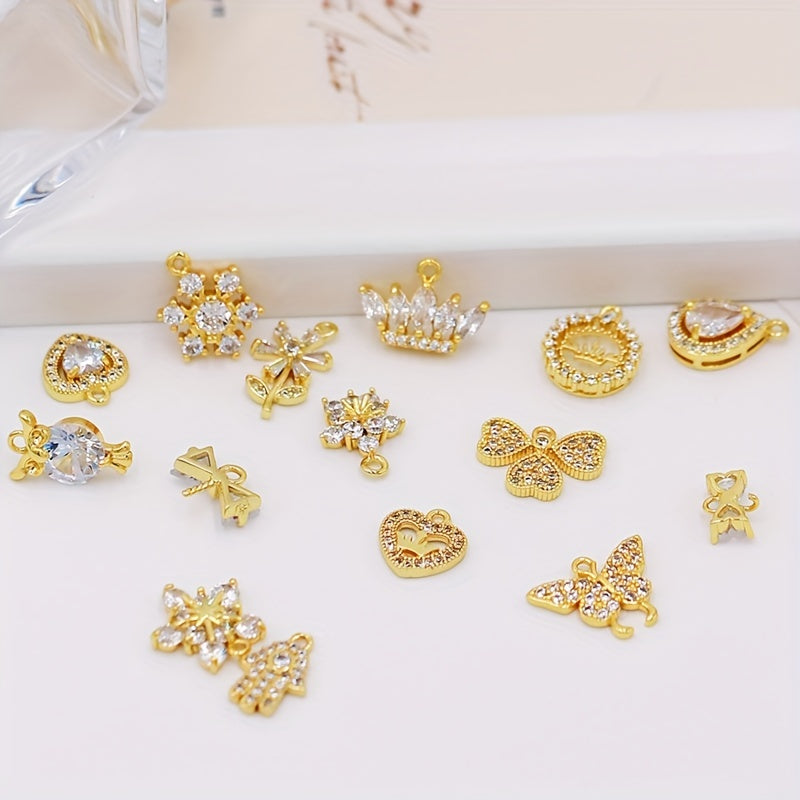 Make stunning jewelry with these 5 assorted golden brass pendants featuring rhinestone decor in butterfly, snowflake, dandelion, water drop, crown, and palm shapes. Perfect for DIY projects!