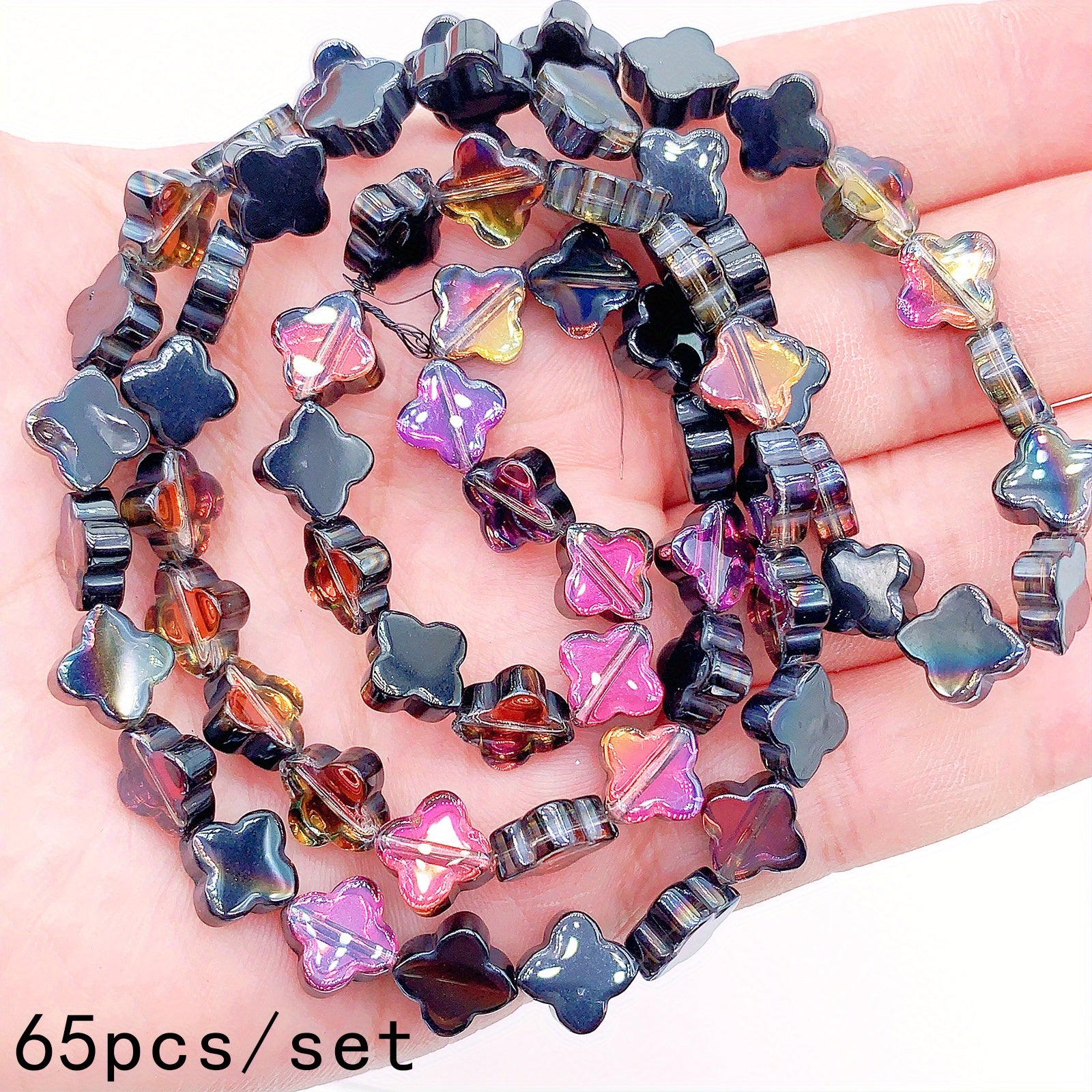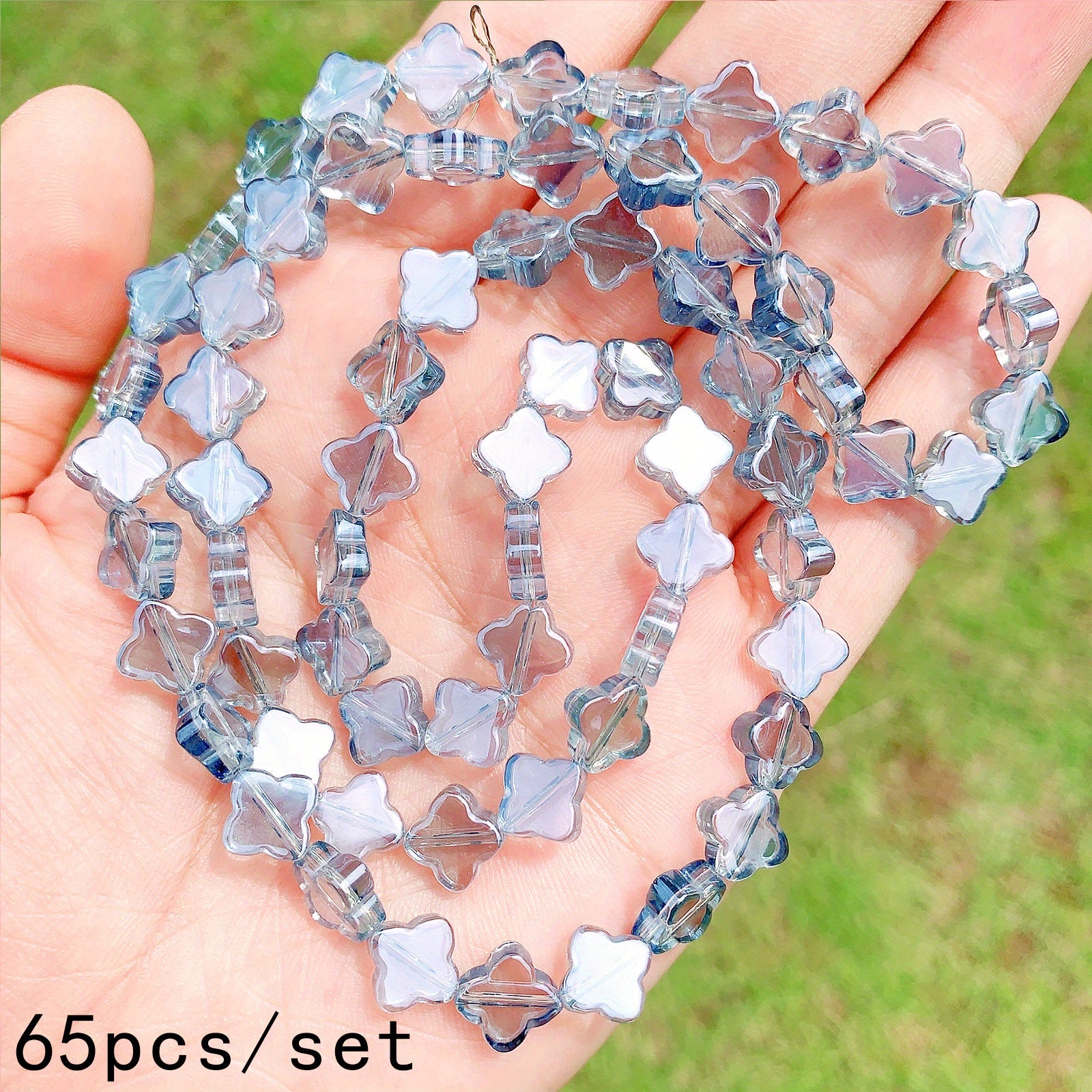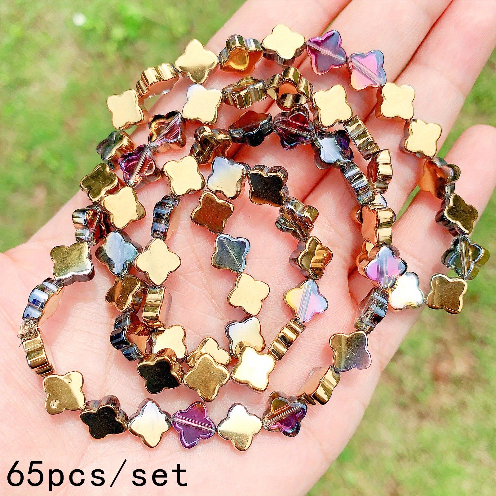 This set includes 65 four-leaf clover shaped crystal beads in plated AB glass, perfect for creating your own unique bracelets and jewelry pieces.