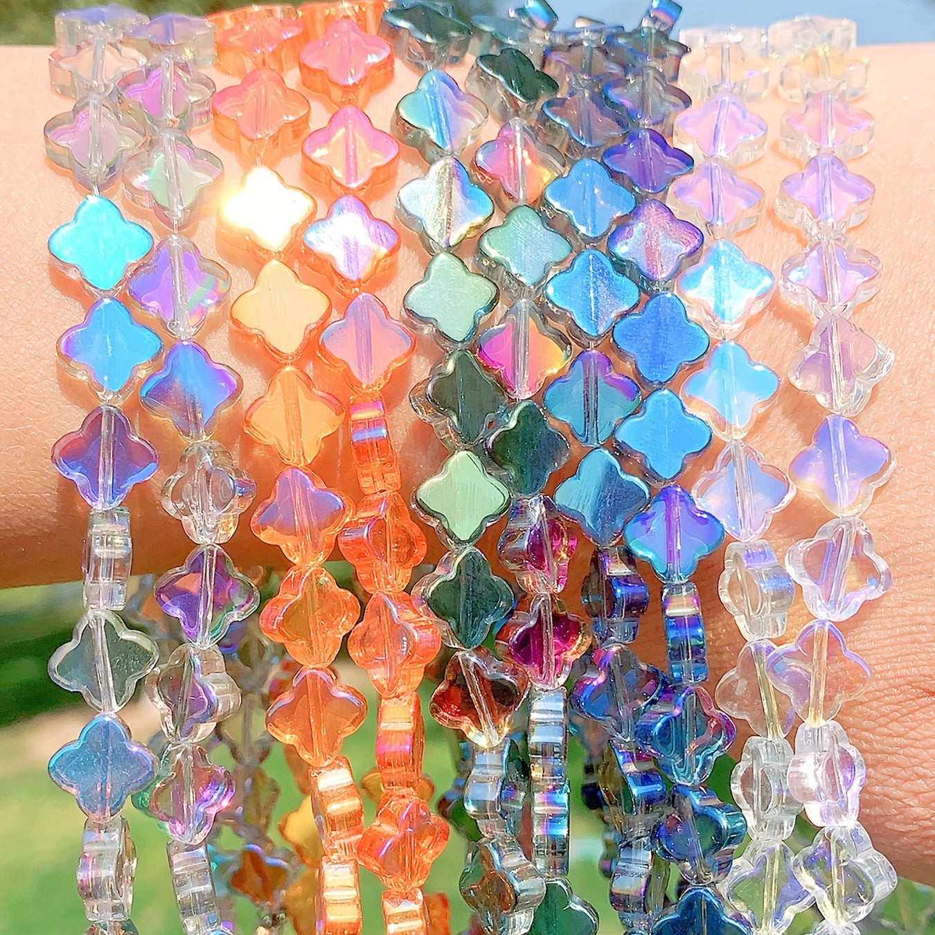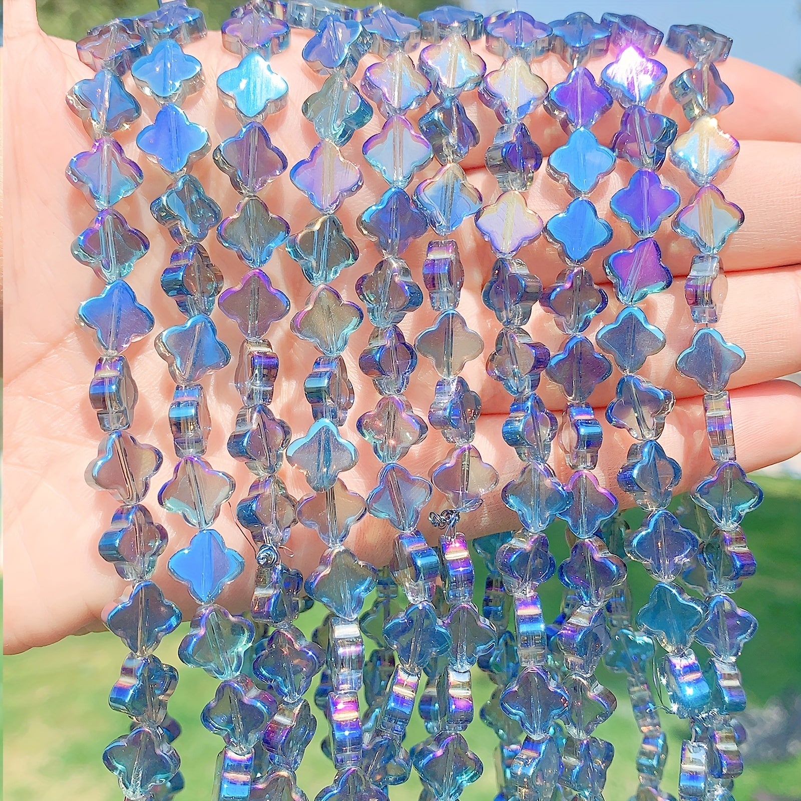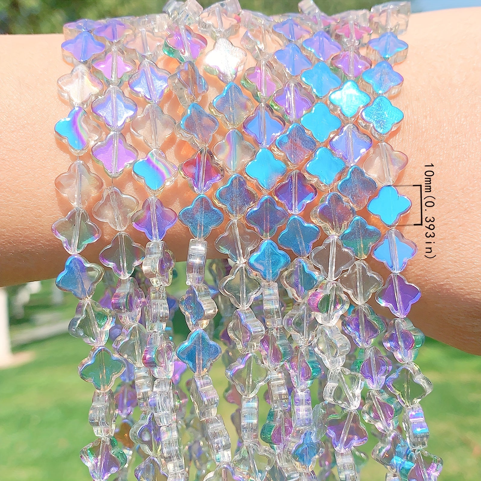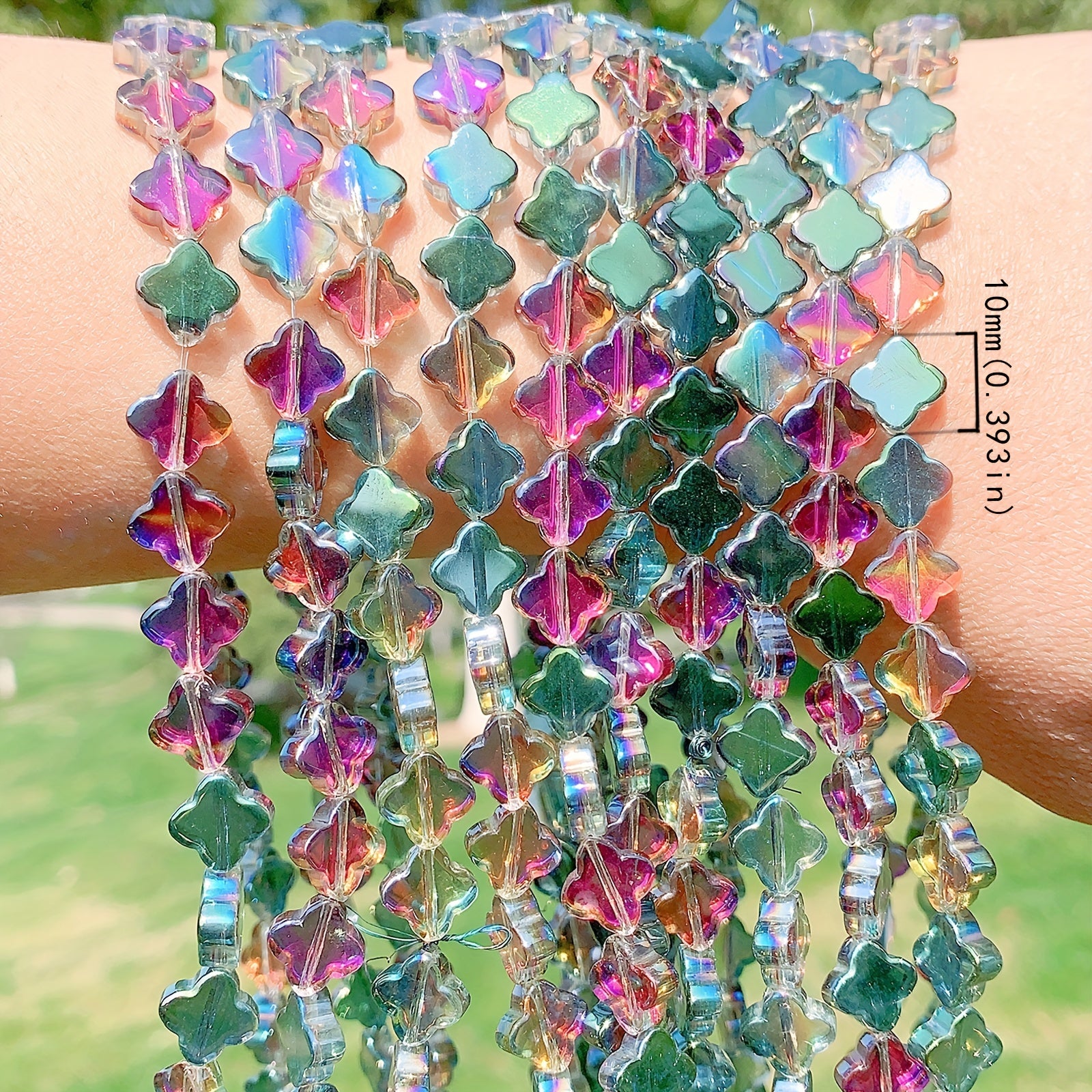 This set includes 65 four-leaf clover shaped crystal beads in plated AB glass, perfect for creating your own unique bracelets and jewelry pieces.