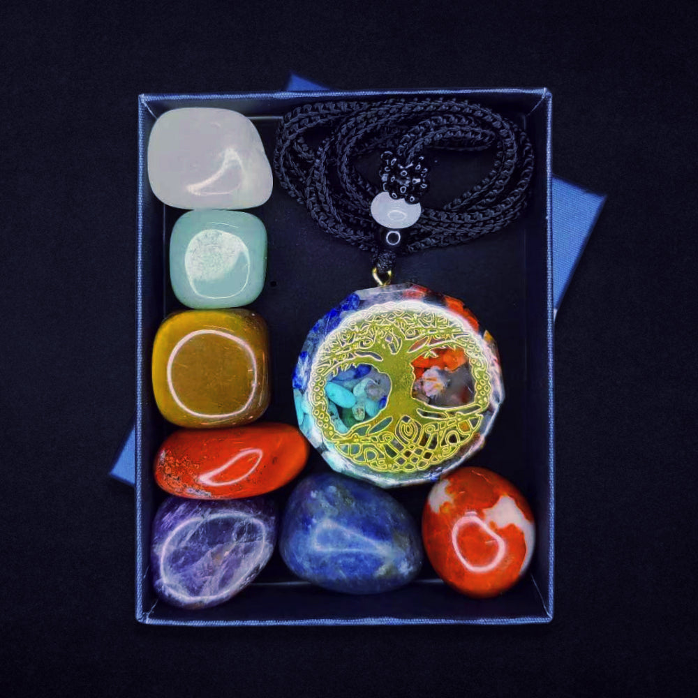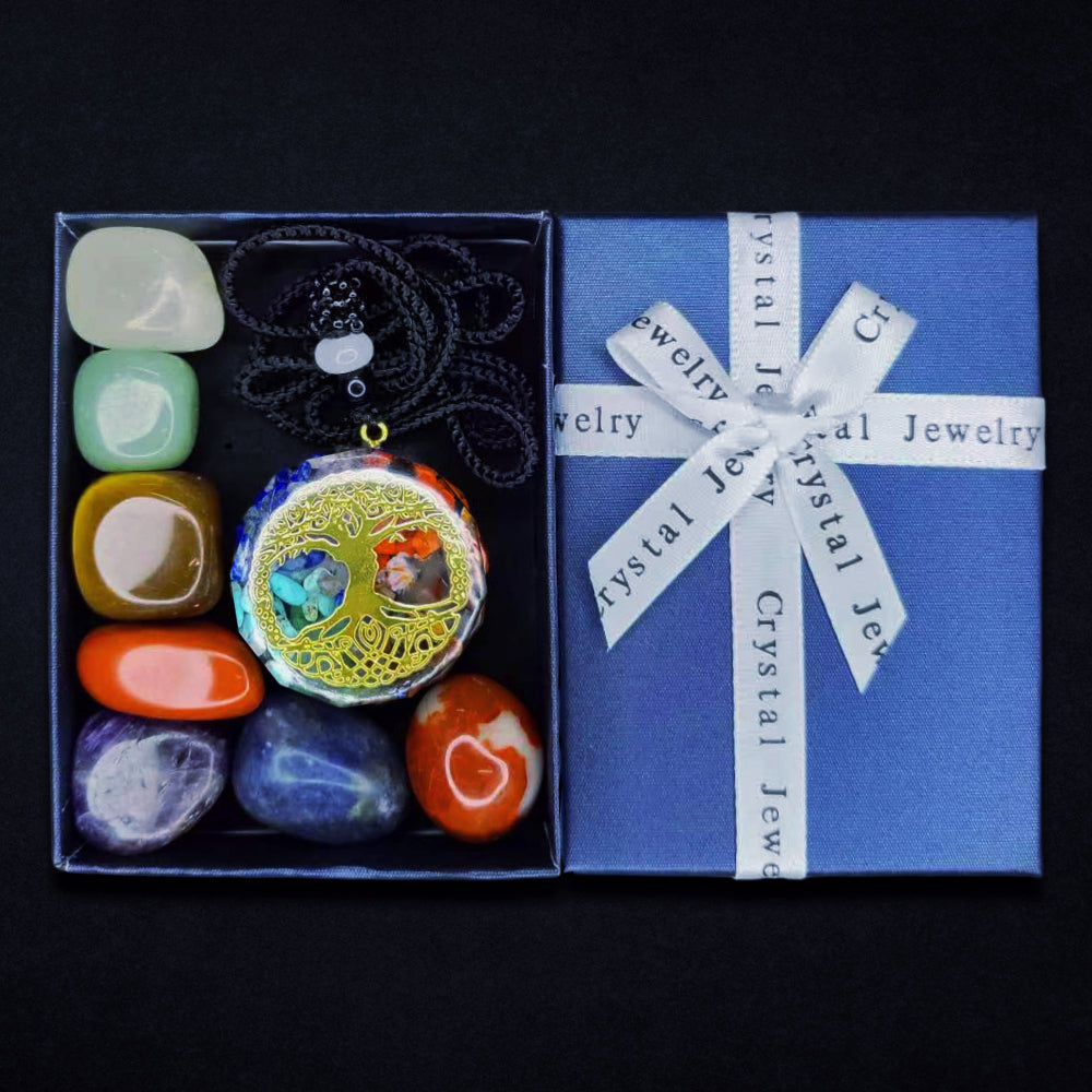 8pcs Vintage Natural Crystal Tree Round Pendant Necklace Set