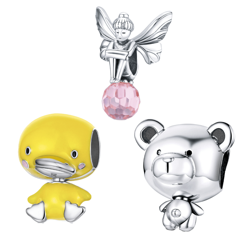 Add a touch of cuteness to your DIY jewelry with this sterling silver charm featuring an angel girl, a little yellow duck, and a silver bear. Perfect for bracelets, bangles, and necklaces.