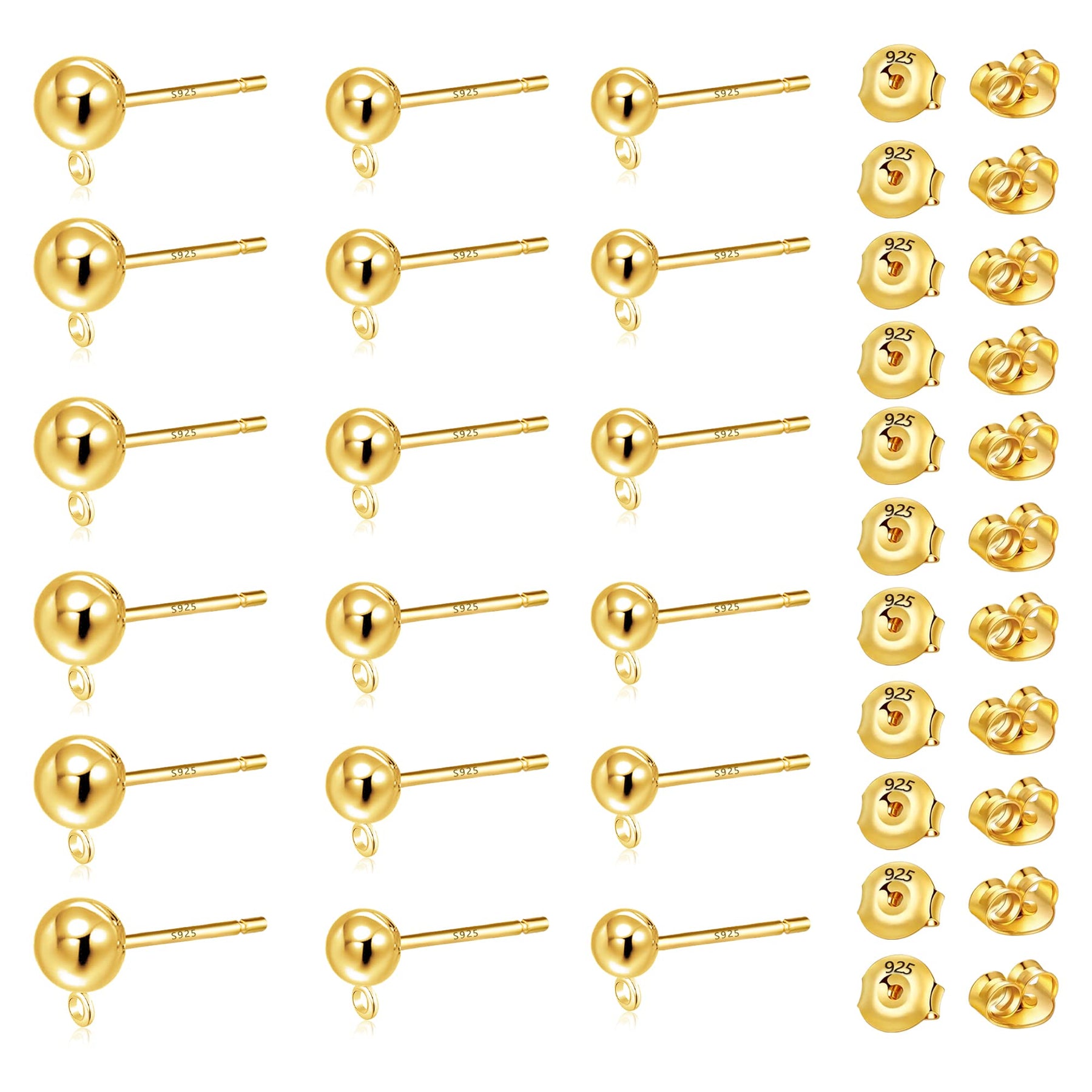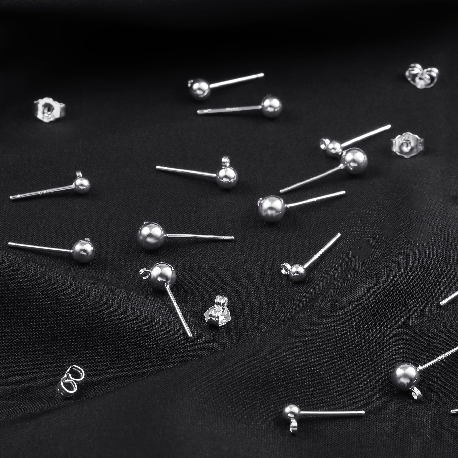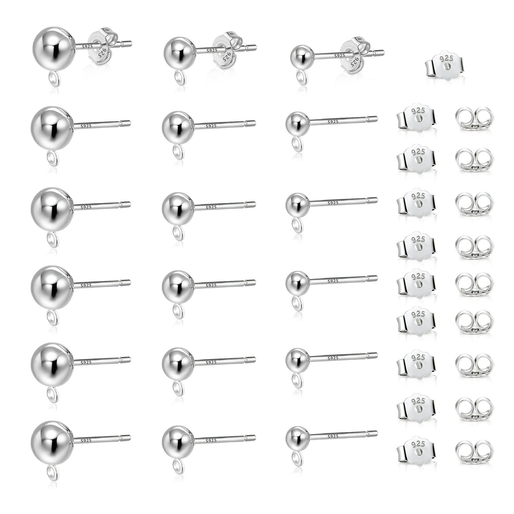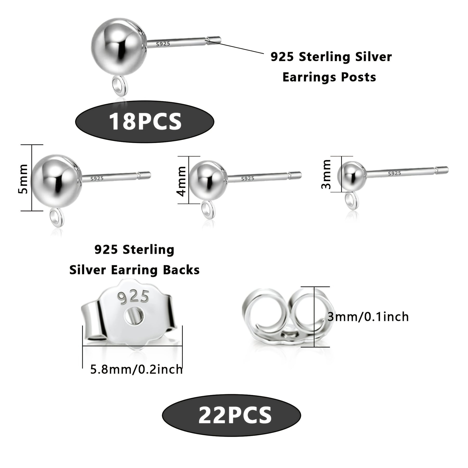 This set includes 18 pairs of 925 silver ball stud earrings in sizes 3mm, 4mm, and 5mm, each with a closed loop. The set also comes with 22 butterfly backs for secure wearing.