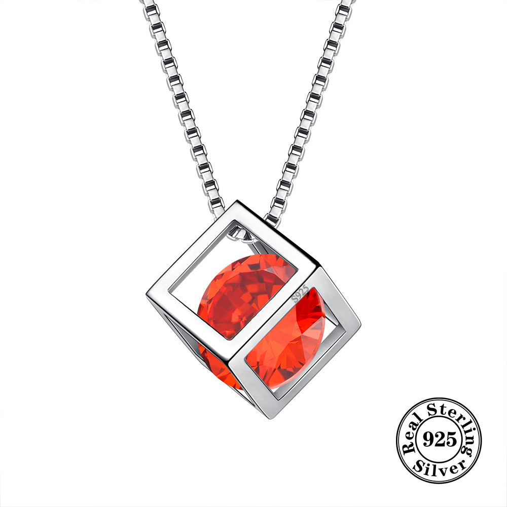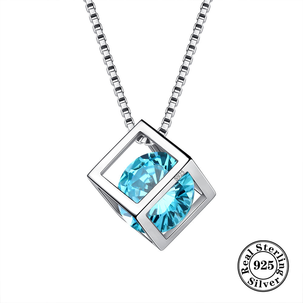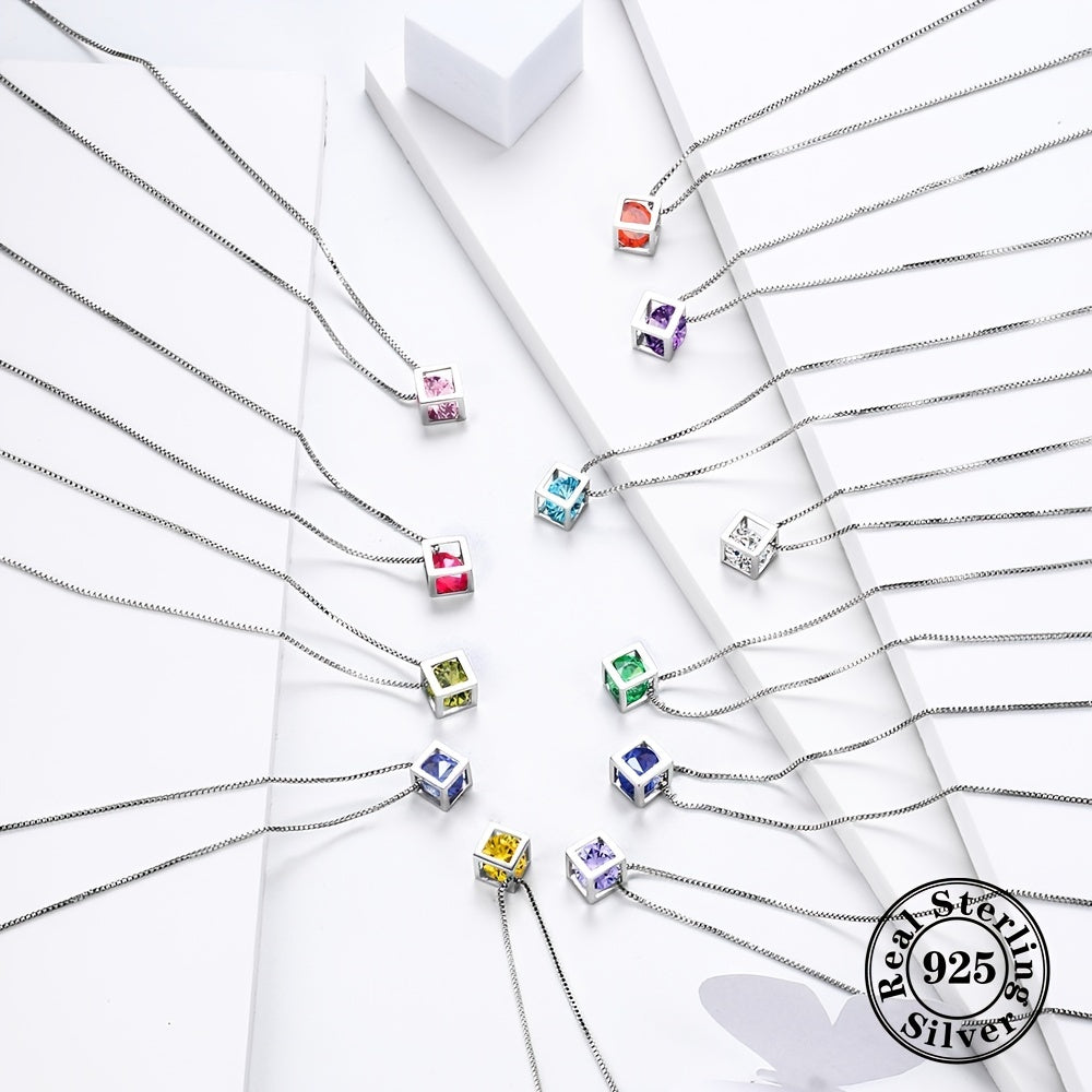 925 Silver Birthstone Necklace Crystal 3D Cube Birth Stone Pendant Jewelry