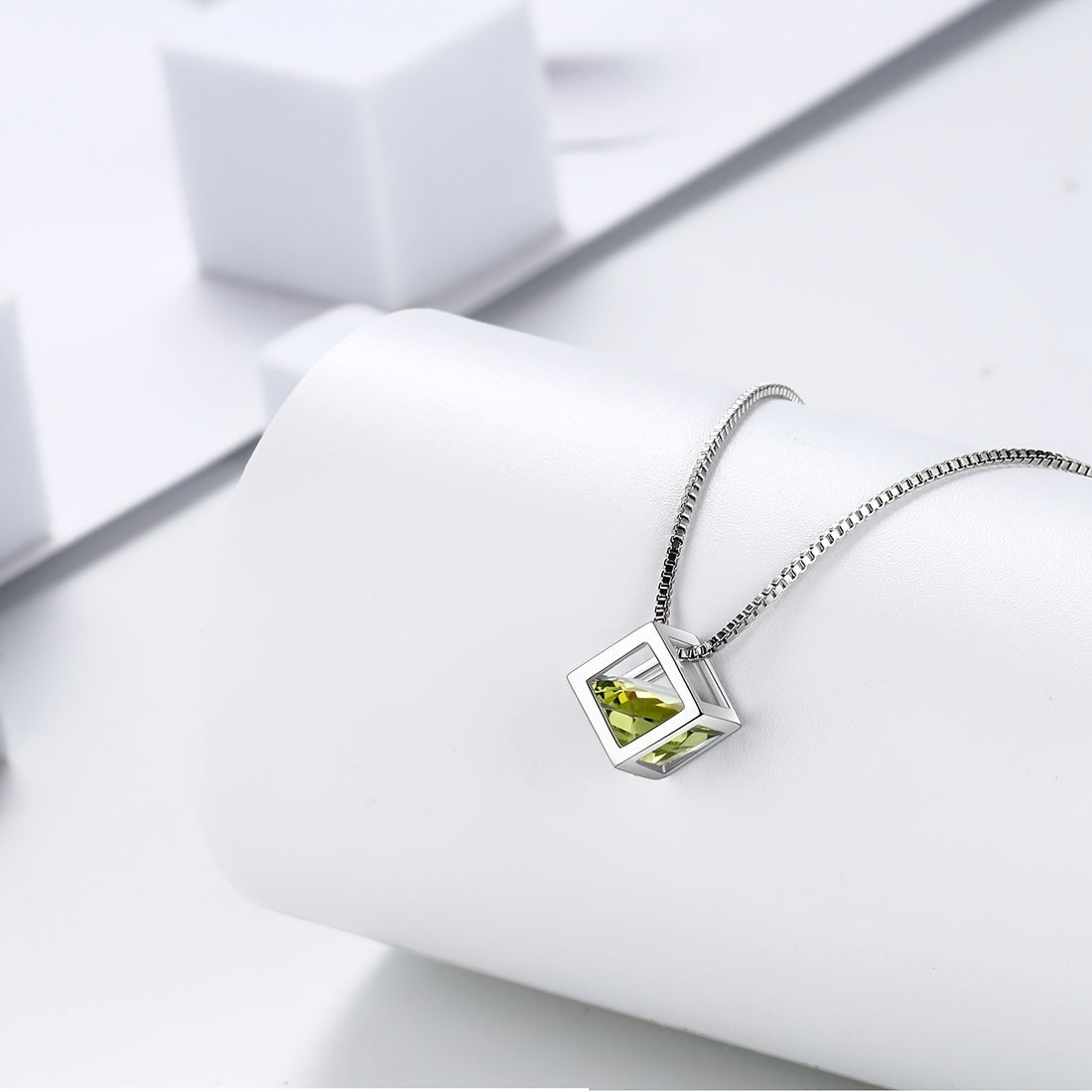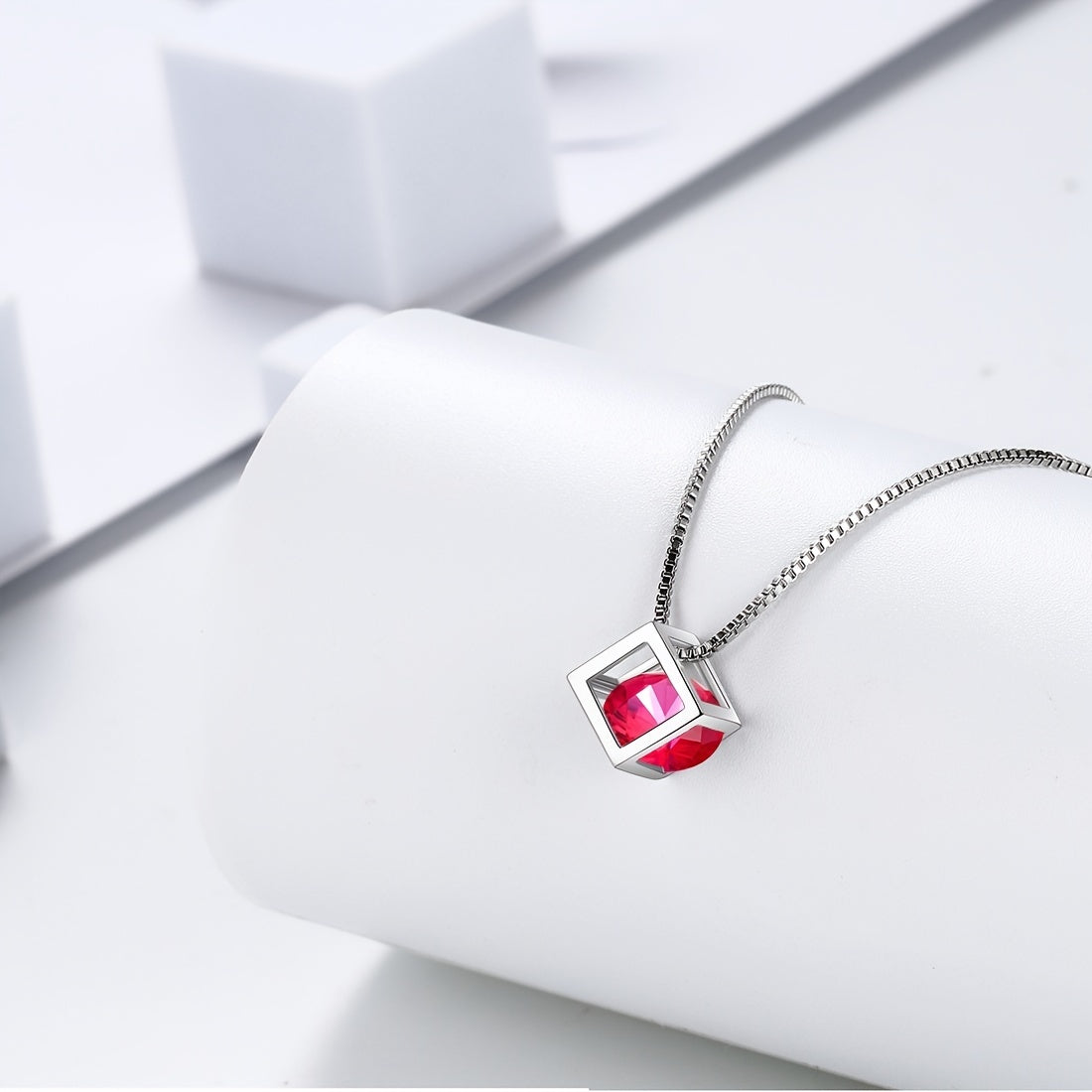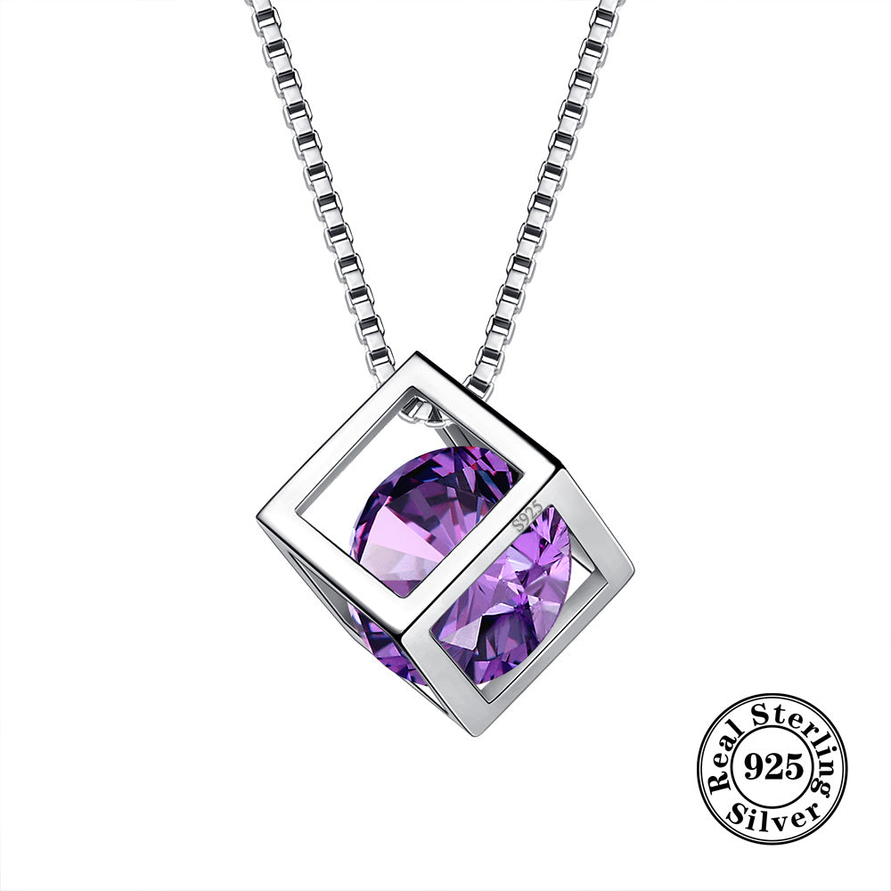 925 Silver Birthstone Necklace Crystal 3D Cube Birth Stone Pendant Jewelry