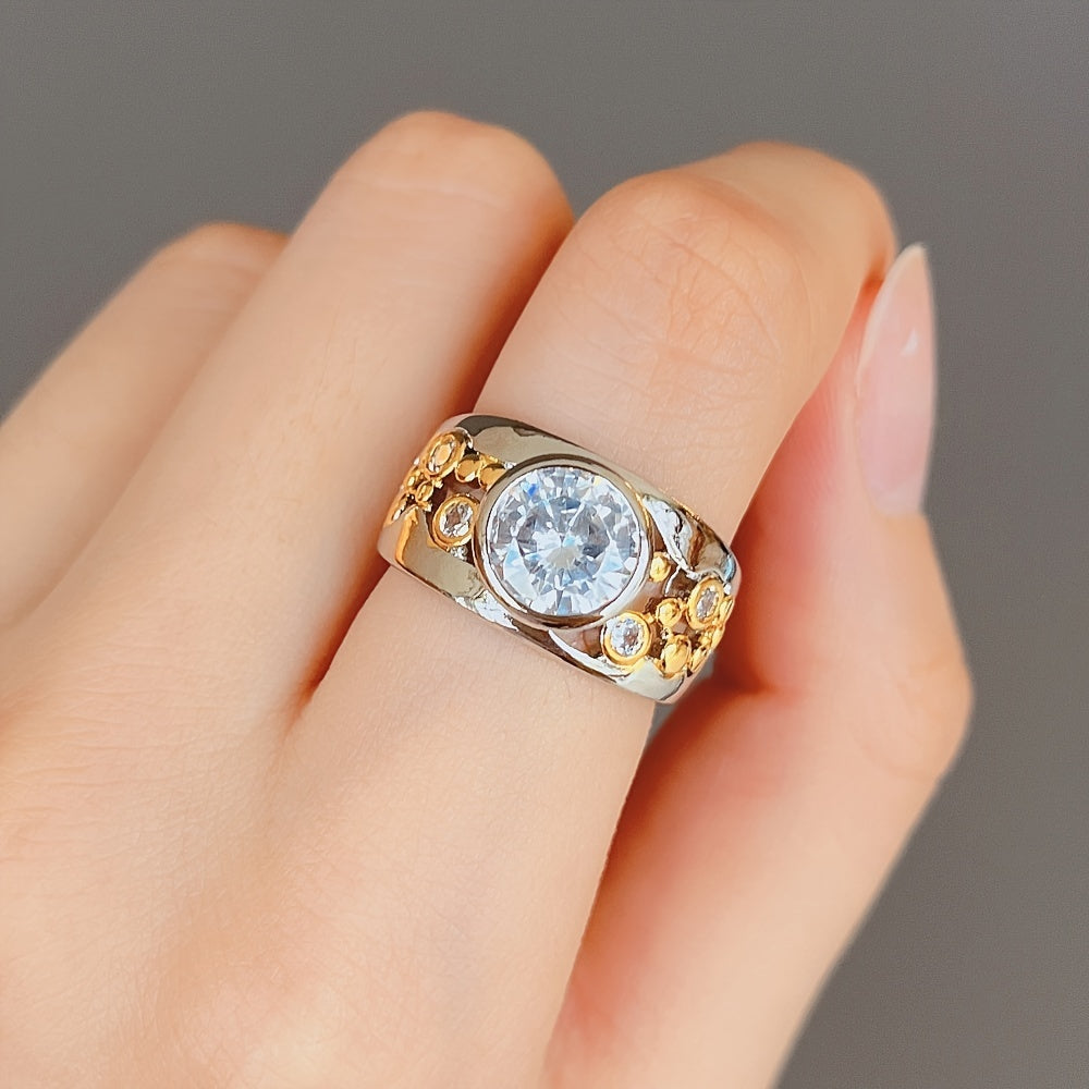 This stunning ring is perfect for bridal engagement or as a proposal gift. It is made of high-quality 925 silver plated with two-tone zircon accents.