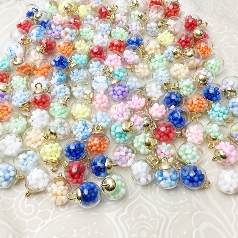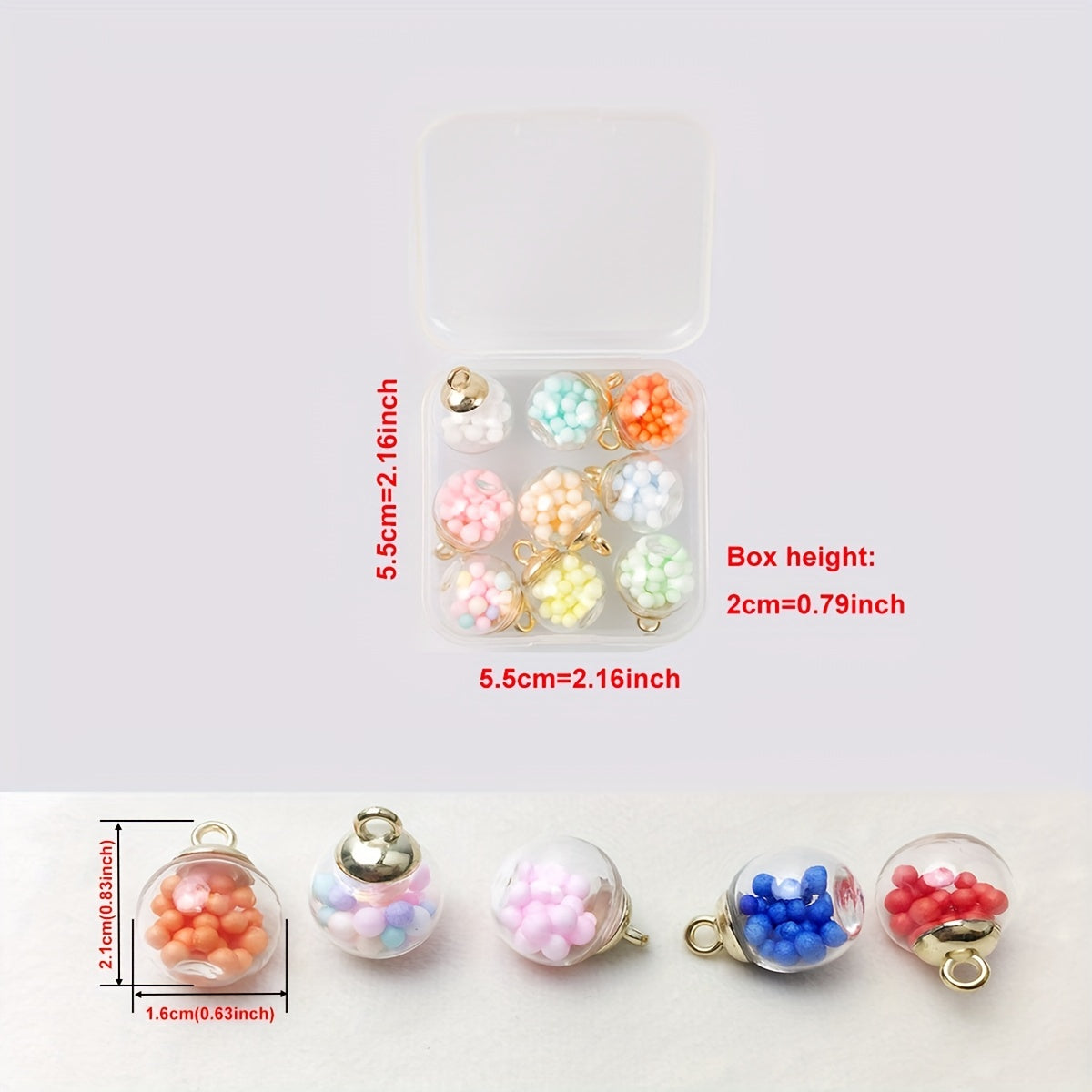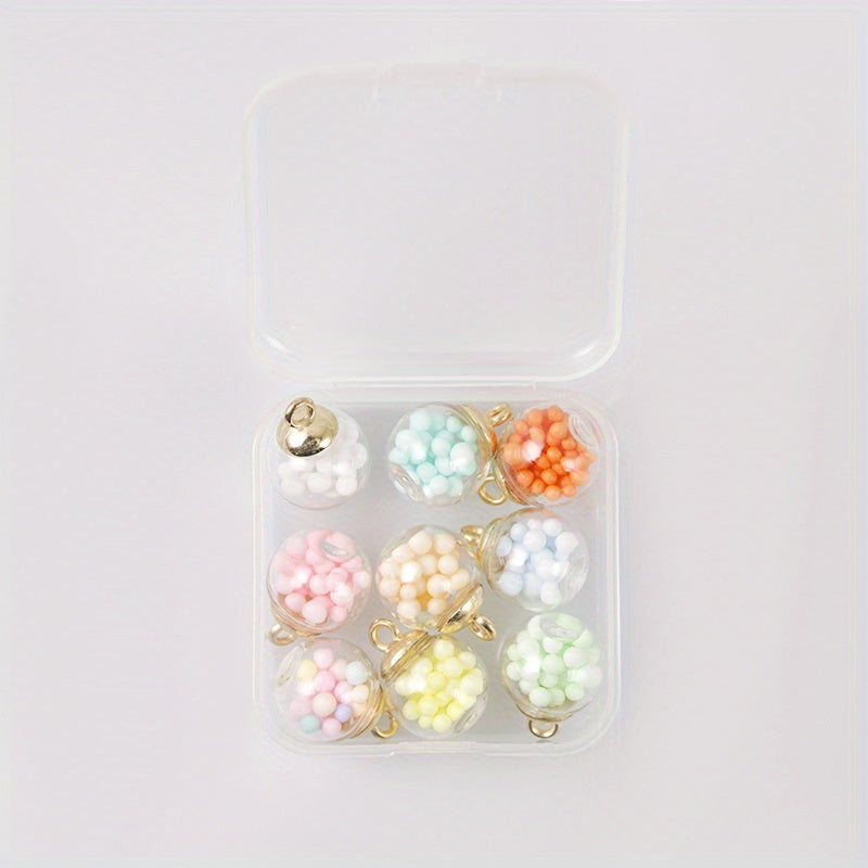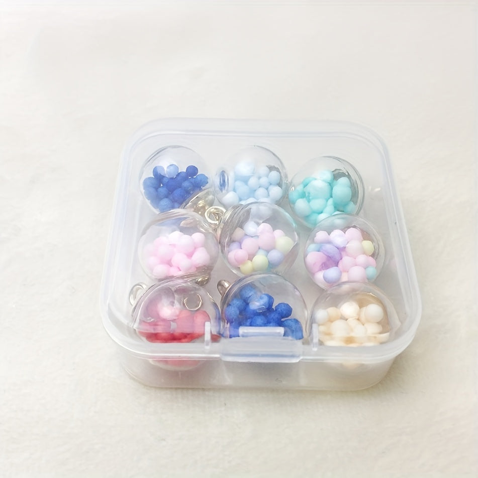 This set includes 9 mixed round transparent glass balls suitable for DIY jewelry making projects like earrings, necklaces, bracelets, and rings. Comes with a convenient storage box.