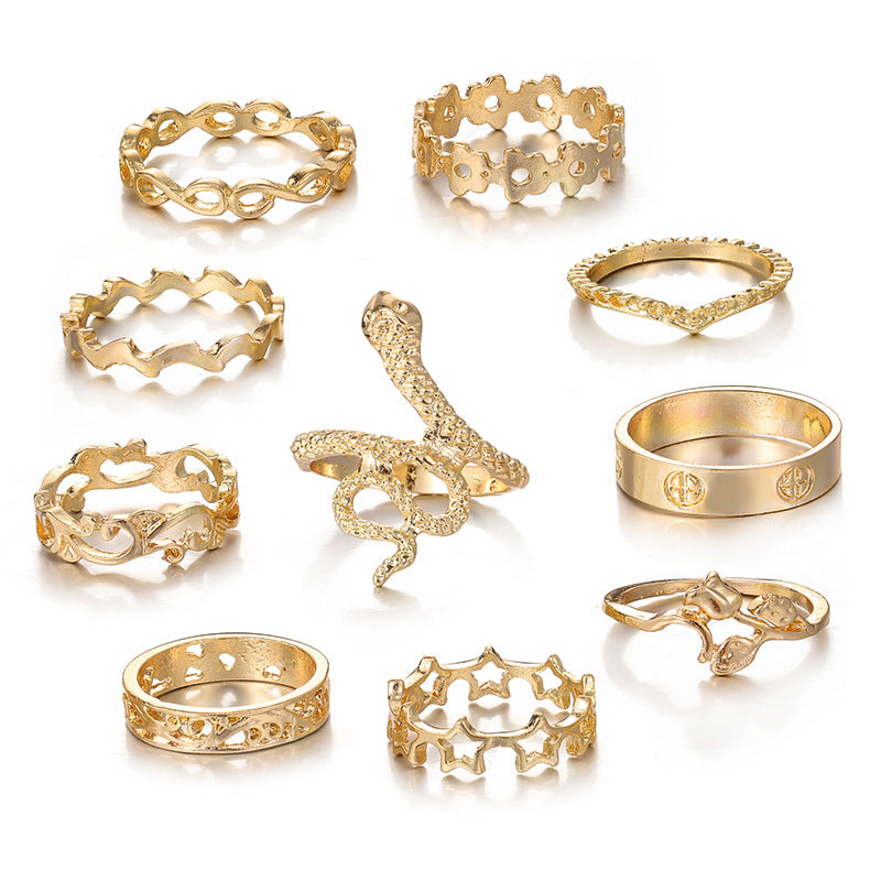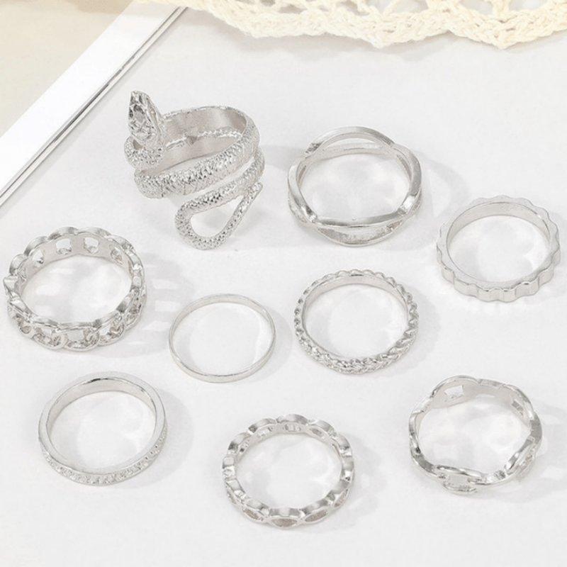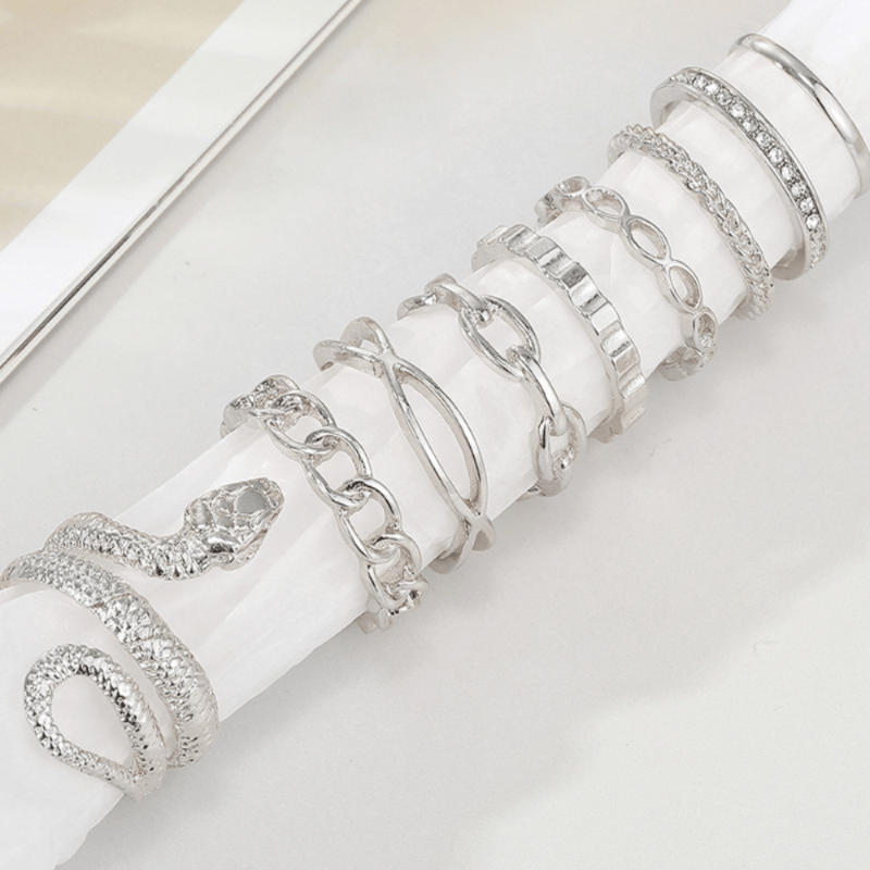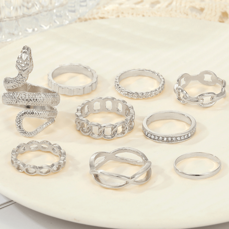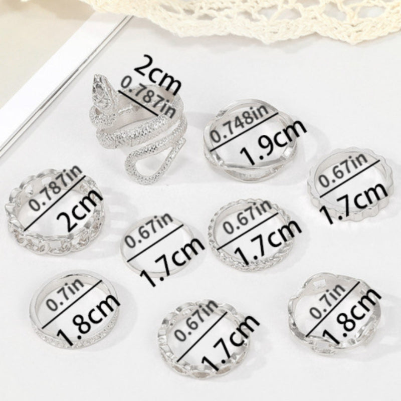 Elevate your daily outfits with this set of 9 stacking rings featuring snake chain and cross designs. Perfect for mixing and matching to create different styles for any occasion.