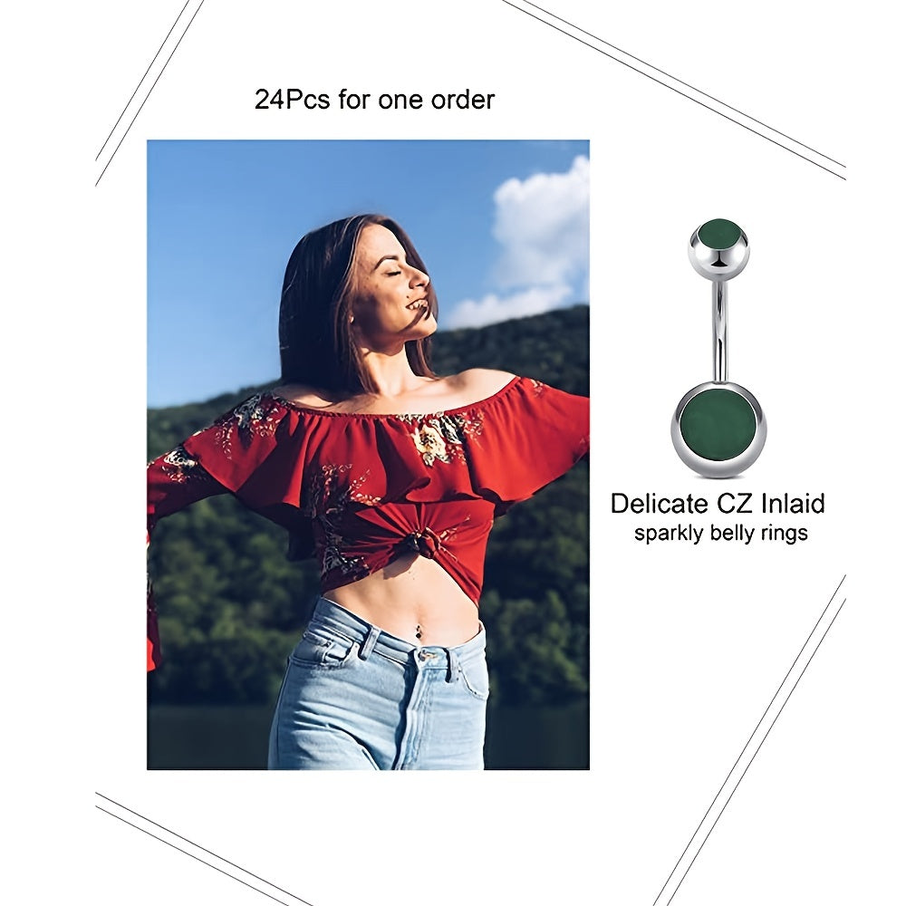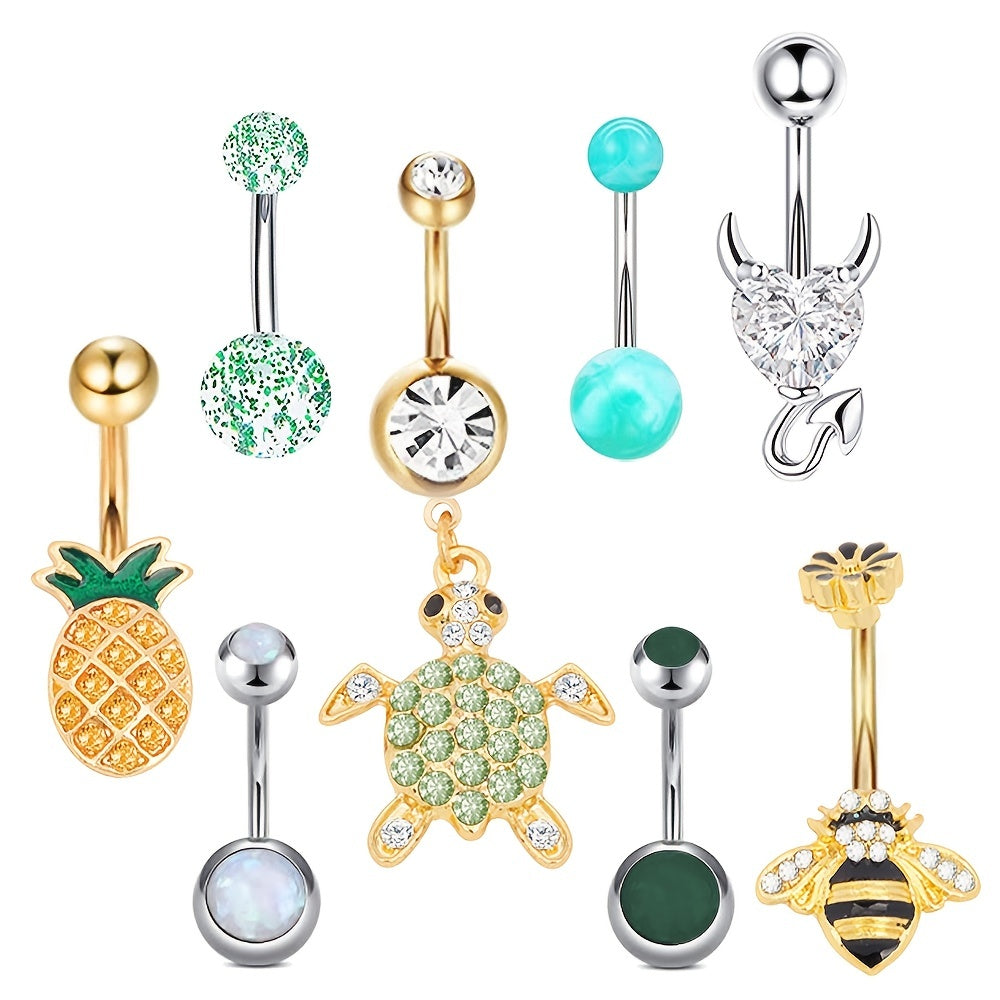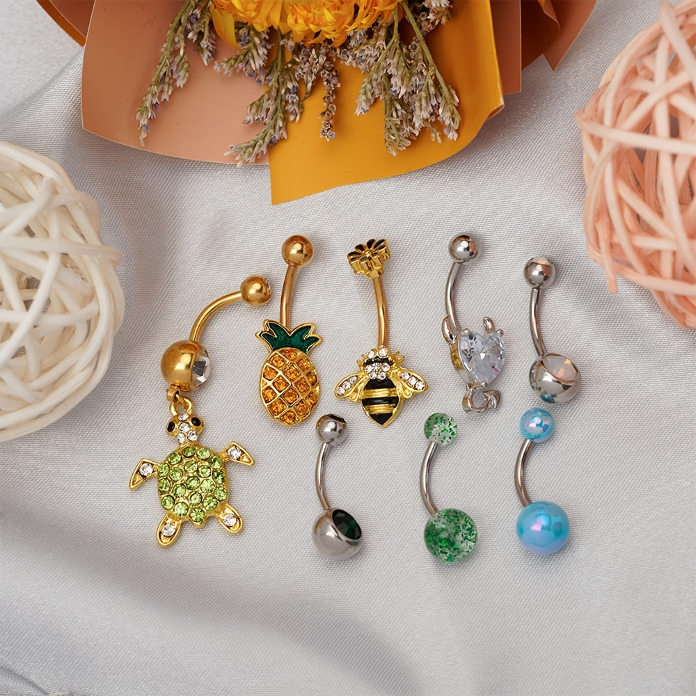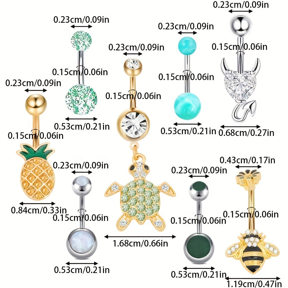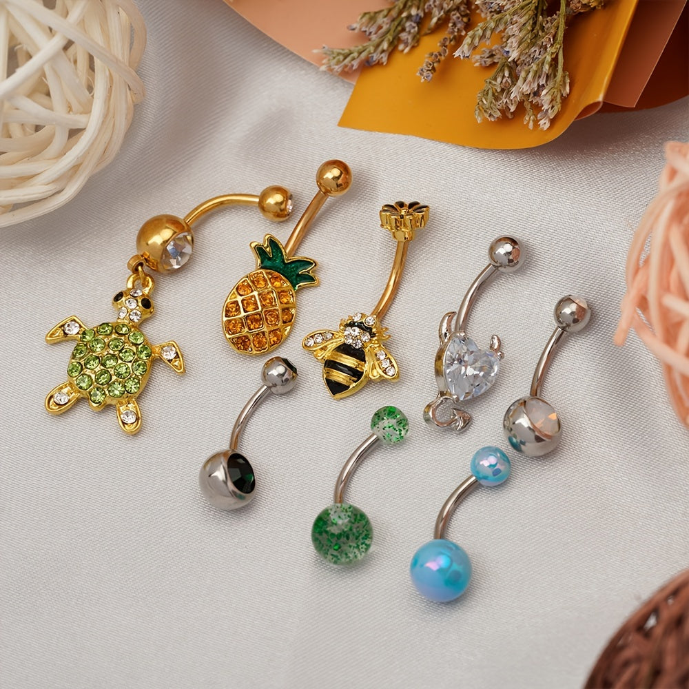 Elevate your style with this 9-piece belly button ring set featuring zircon inlaid designs of bees, pineapples, and turtles. Each ring is crafted with high-quality materials for comfortable wear.