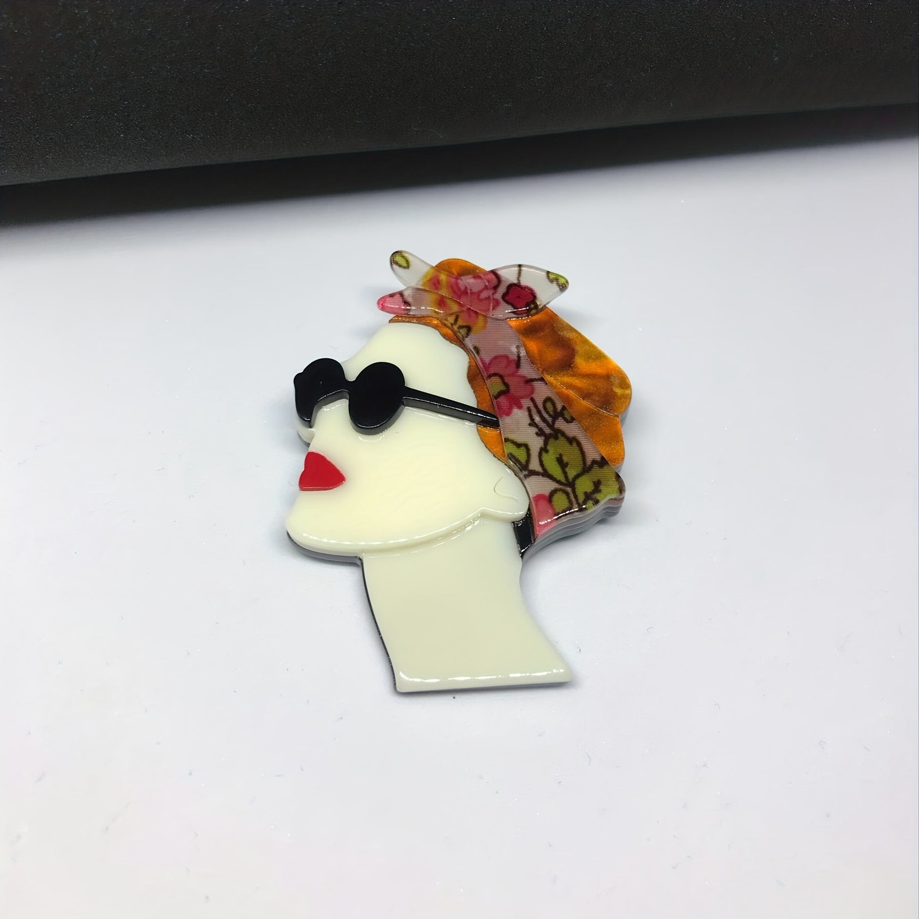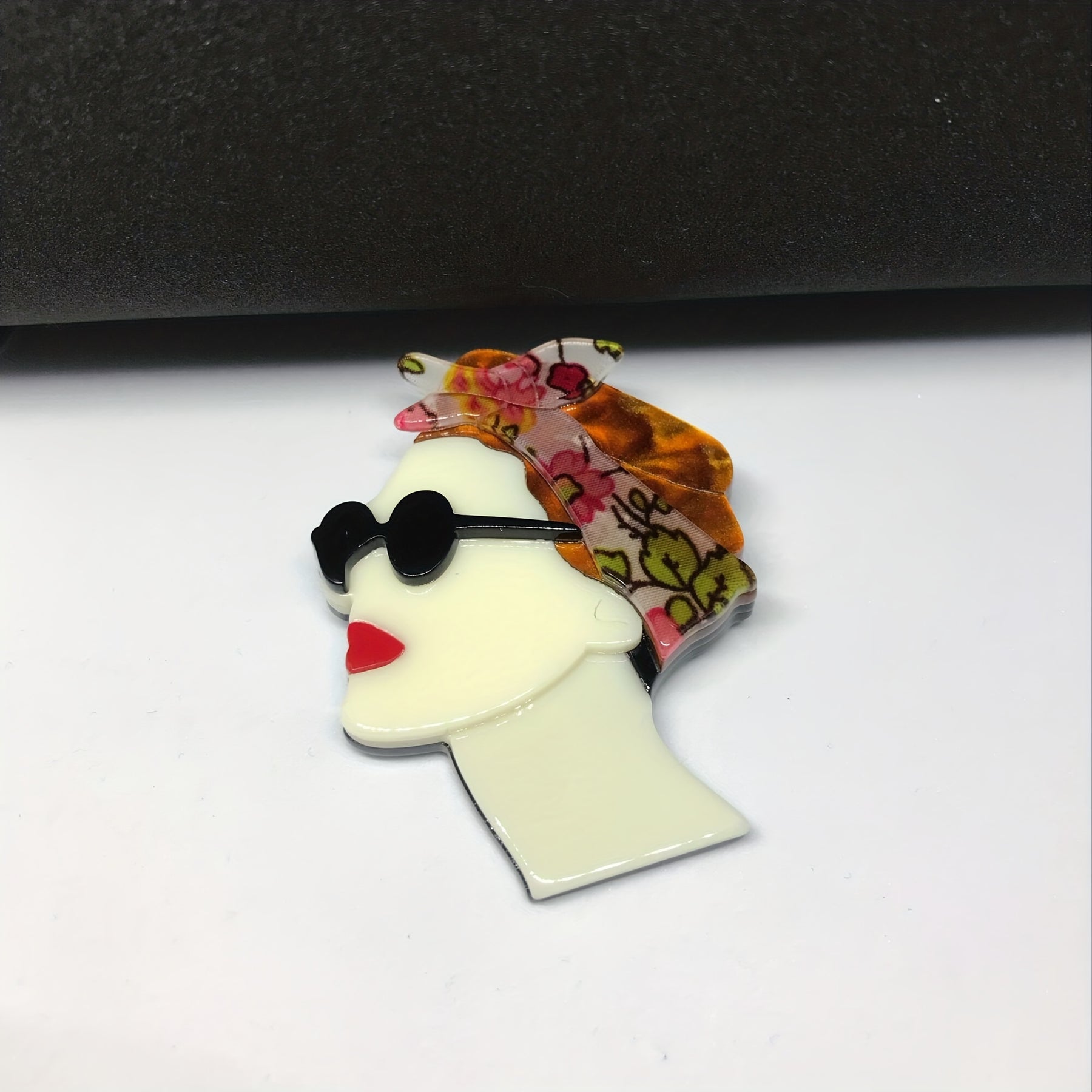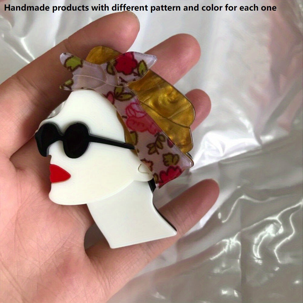 Add a stylish touch to your outfit with this acrylic brooch featuring a woman wearing a headscarf and sunglasses.