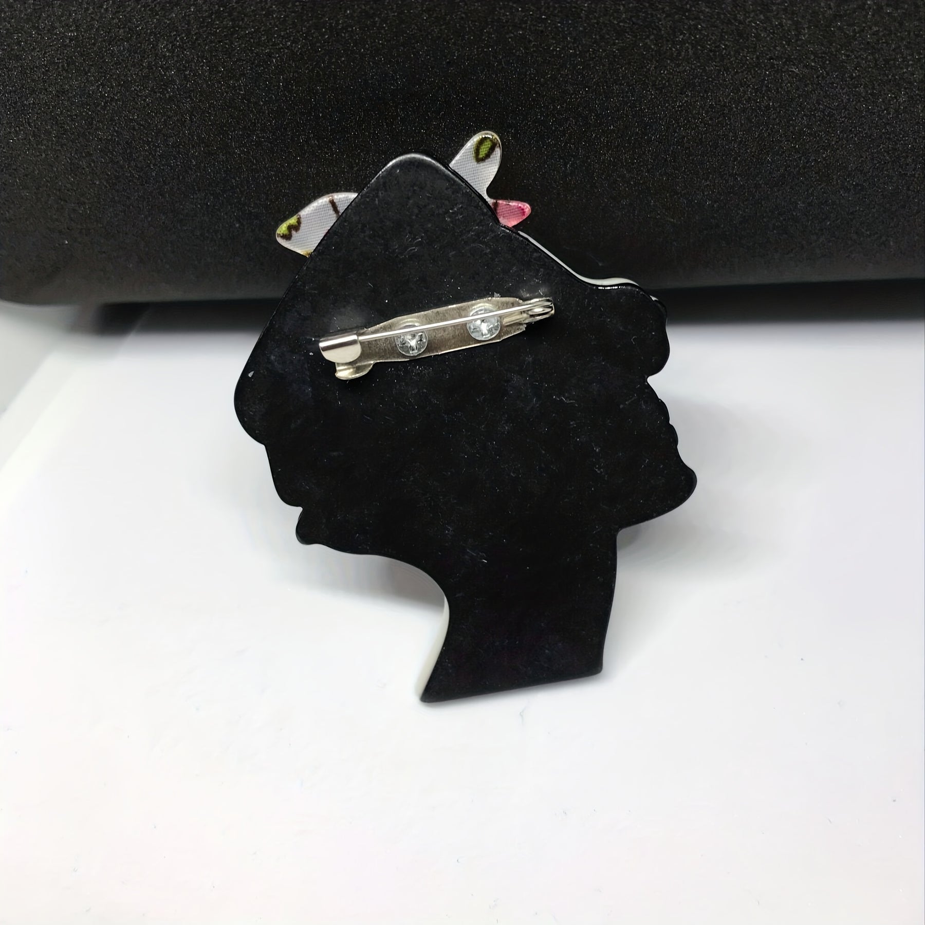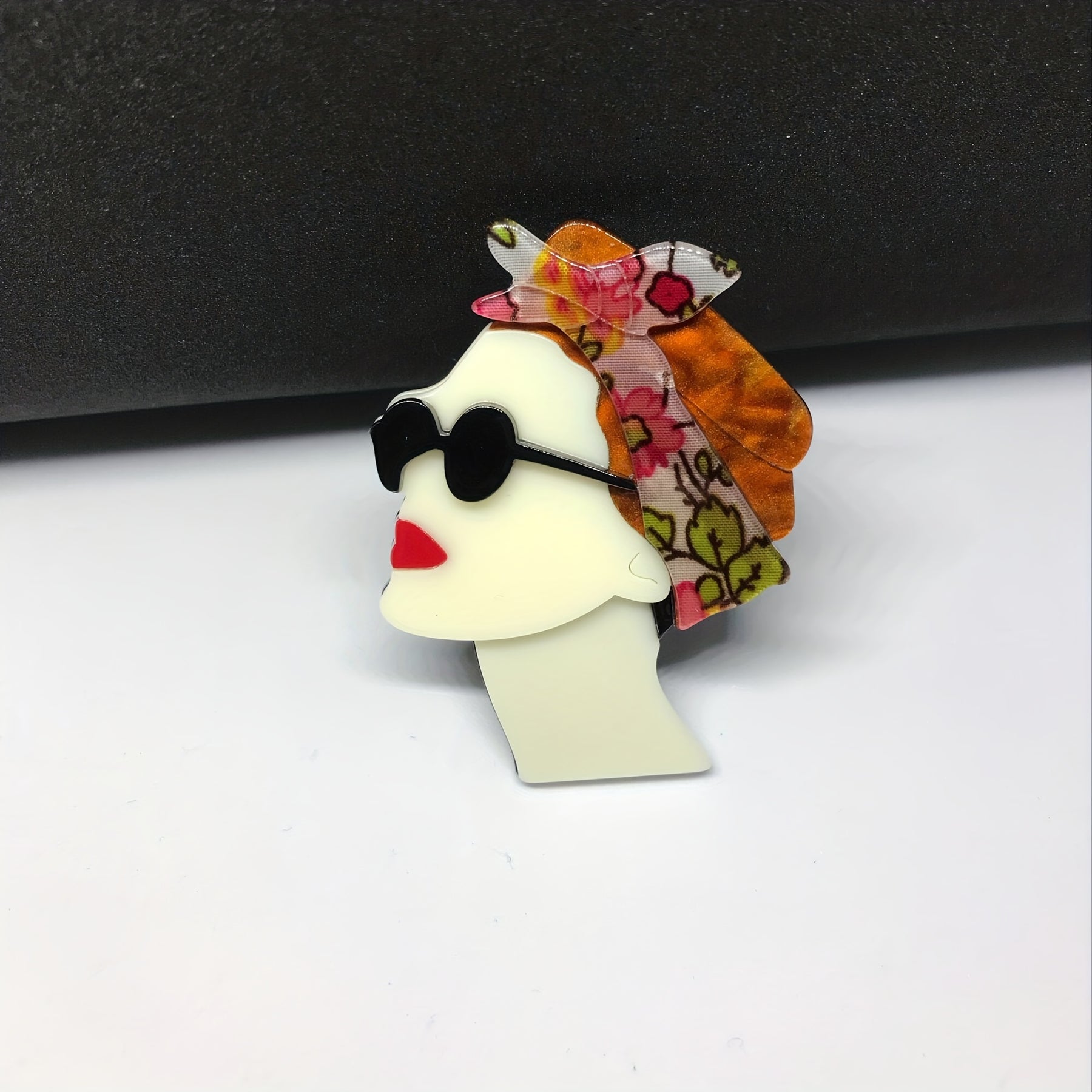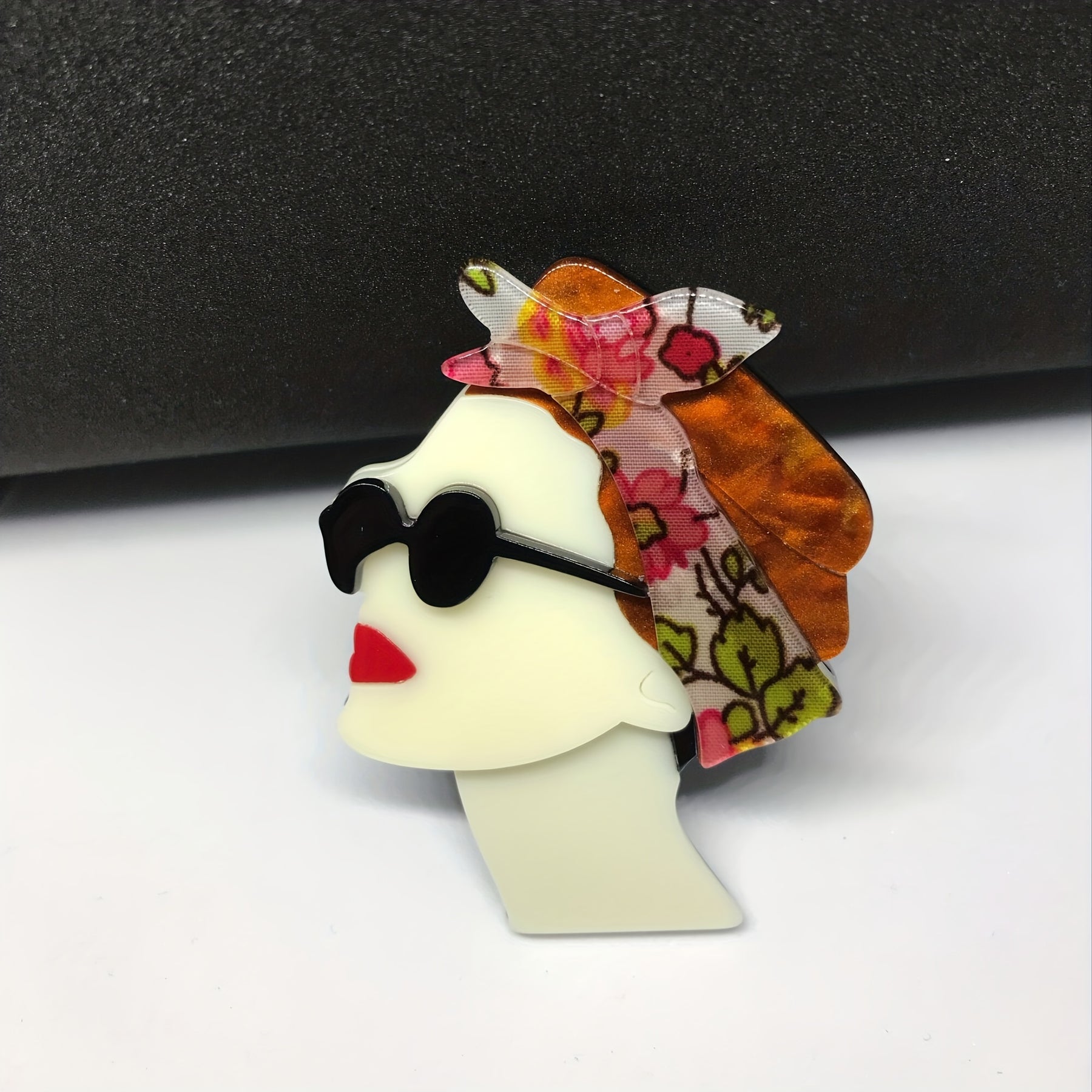 Add a stylish touch to your outfit with this acrylic brooch featuring a woman wearing a headscarf and sunglasses.