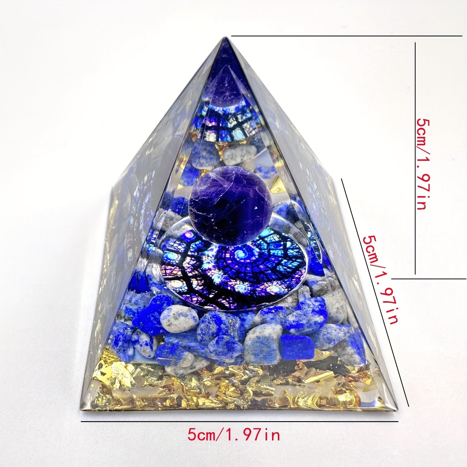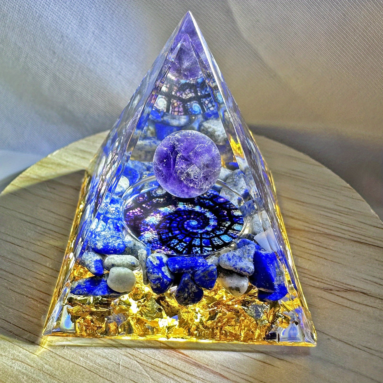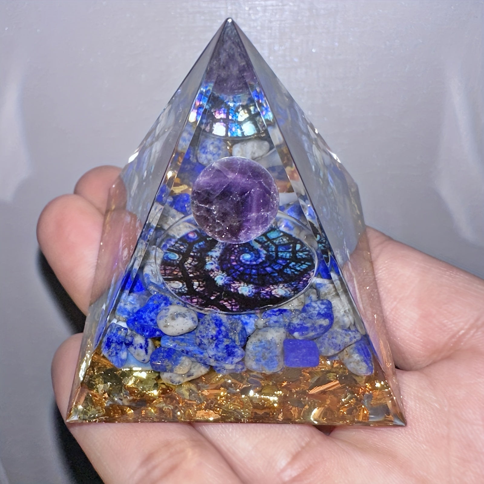This orgone pyramid is designed to harness positive energy, featuring amethyst chakra stones for balance. Use it for meditation, healing, and energy enhancement.