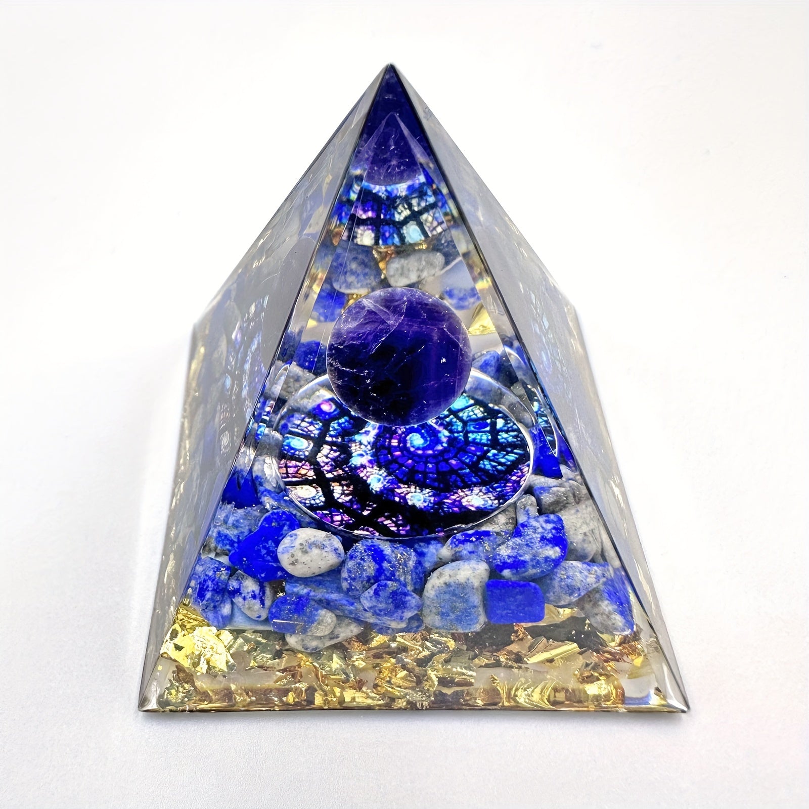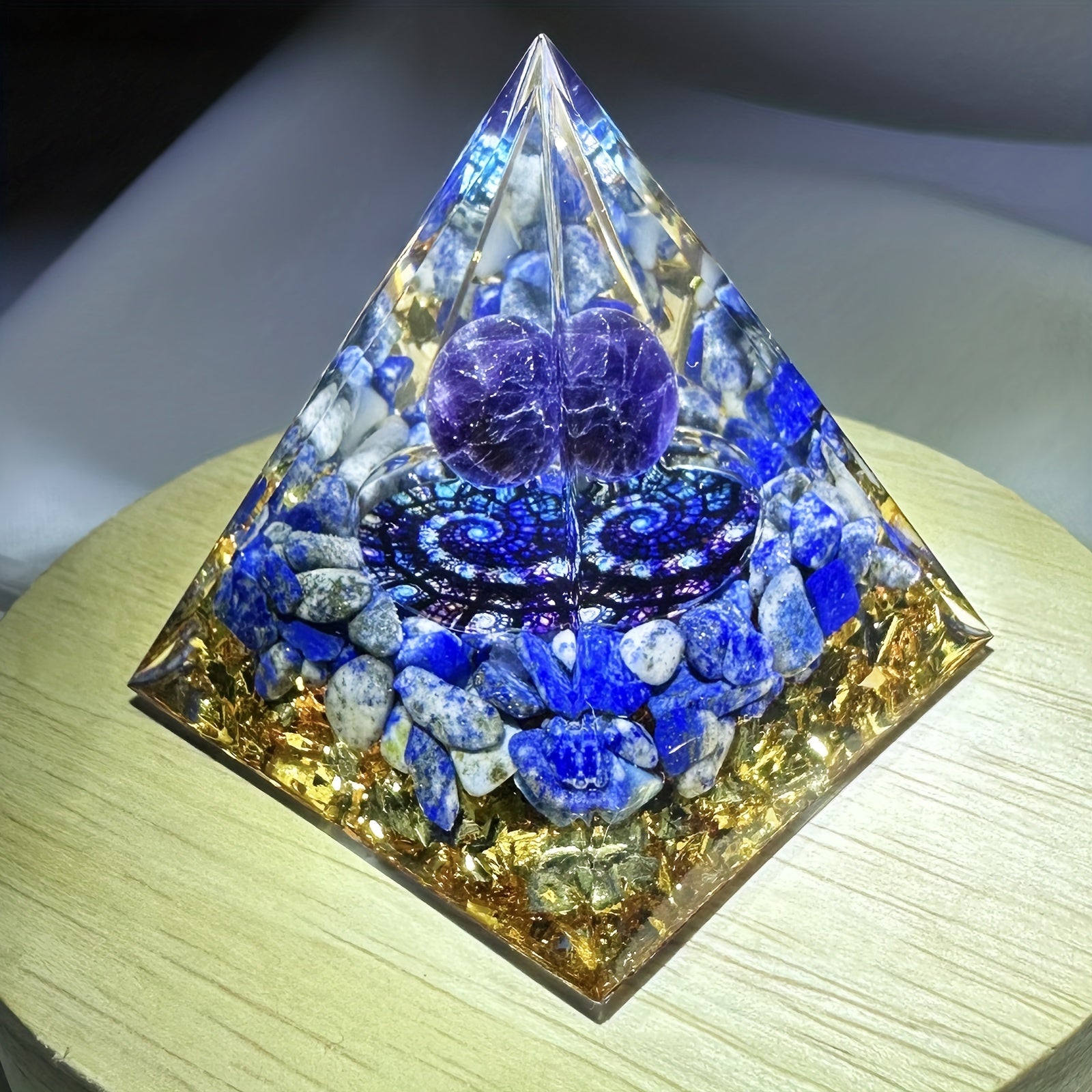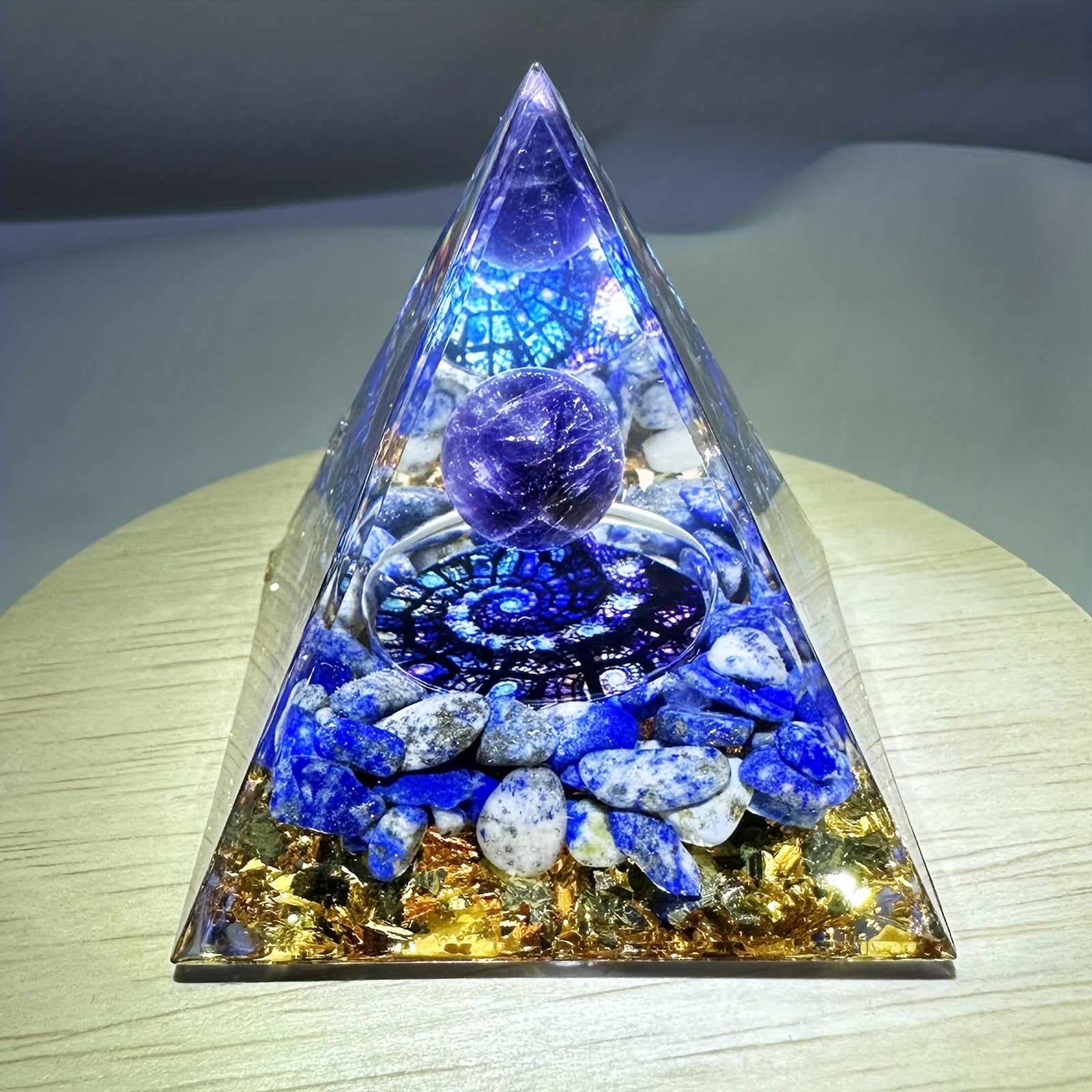 This orgone pyramid is designed to harness positive energy, featuring amethyst chakra stones for balance. Use it for meditation, healing, and energy enhancement.