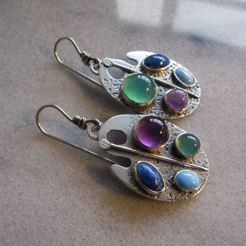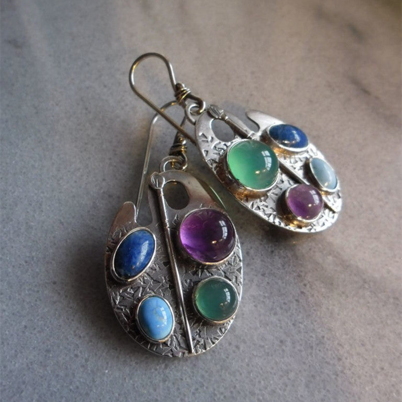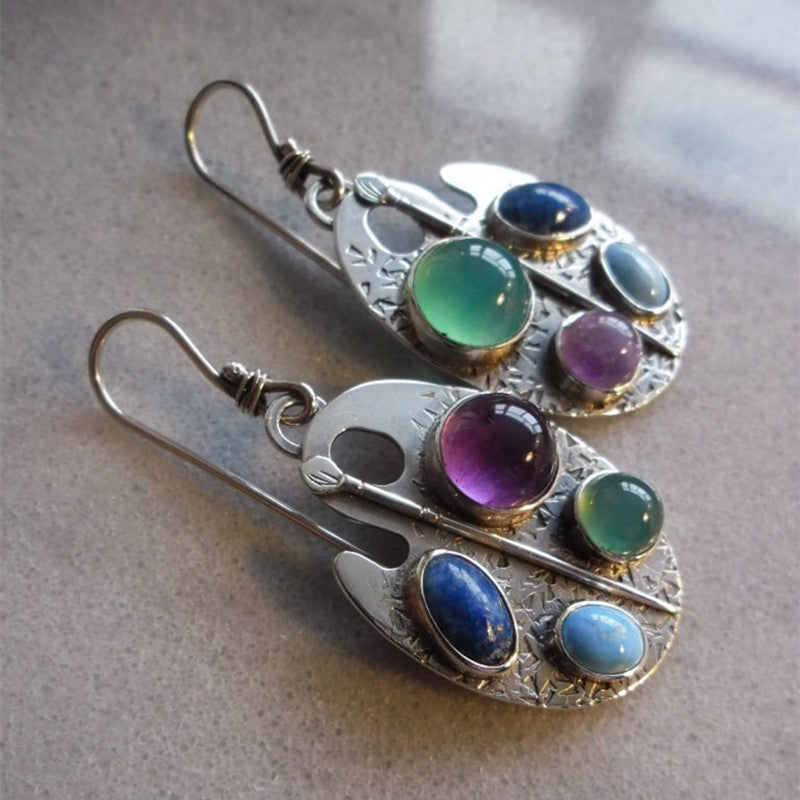 Beautiful dangle earrings featuring hand carved pattern and inlaid with 4 metal plated Lazuli stones. These earrings have an antique silver finish that adds a touch of elegance to any outfit.
