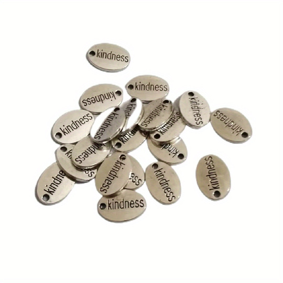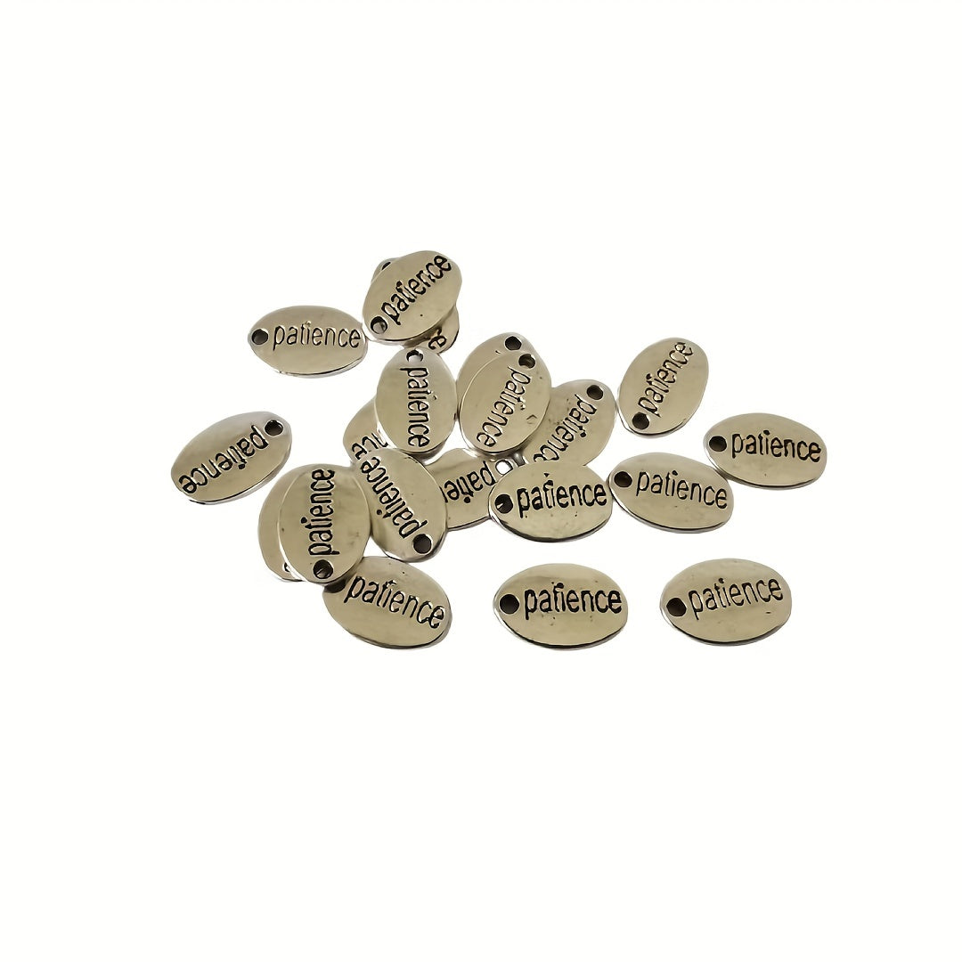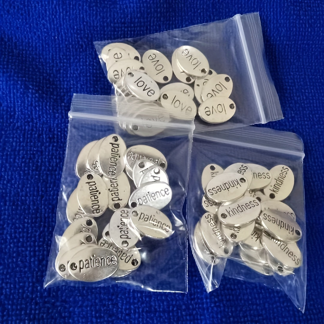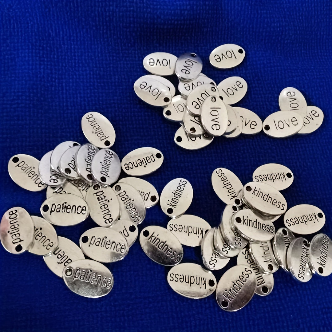 Enhance your jewelry making with these 20 or 60 antique silver oval alloy tag pendants featuring Kindness, Love, and Patience word patterns.