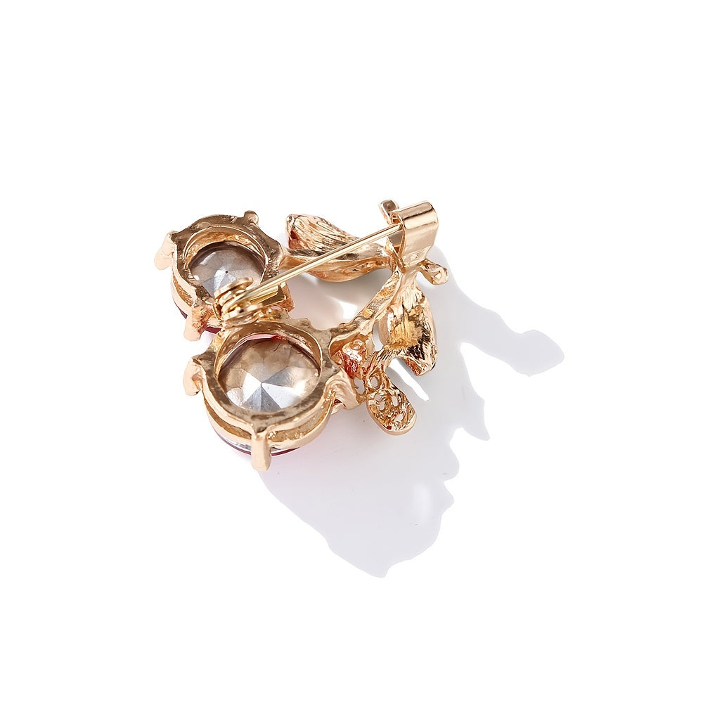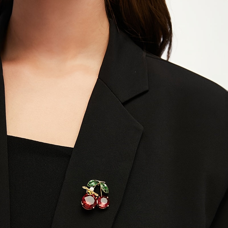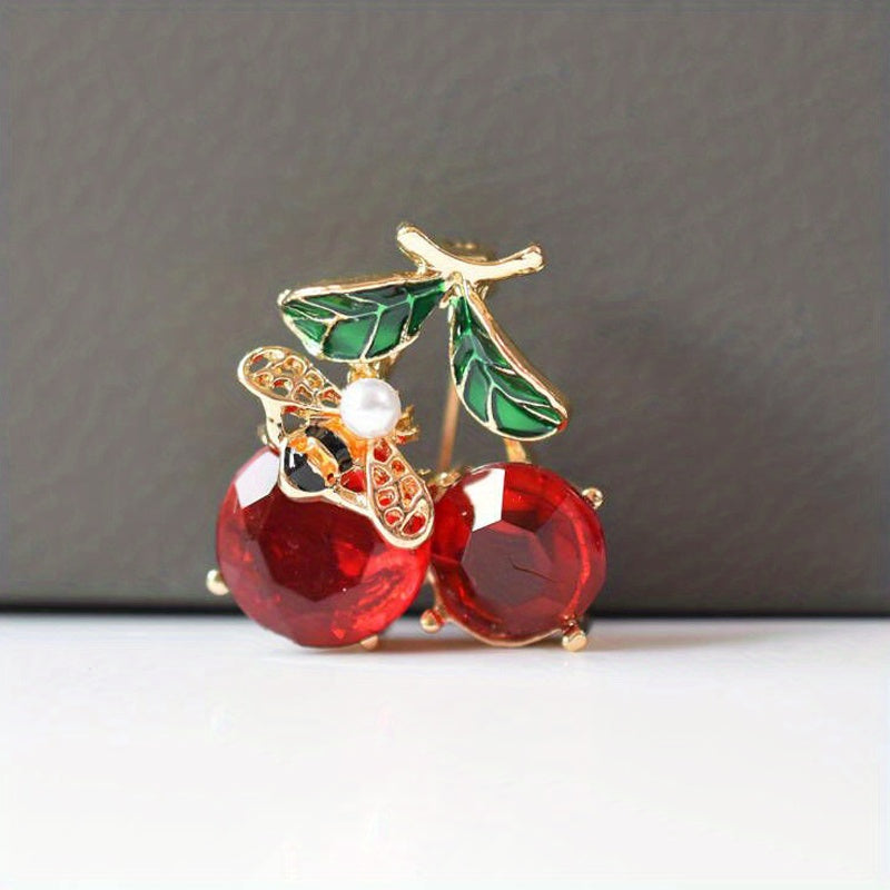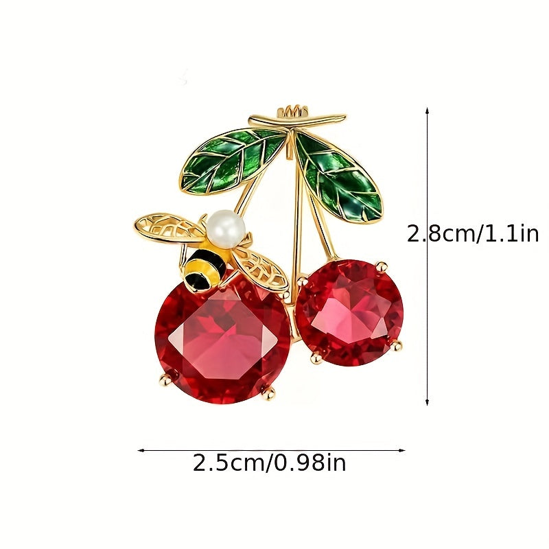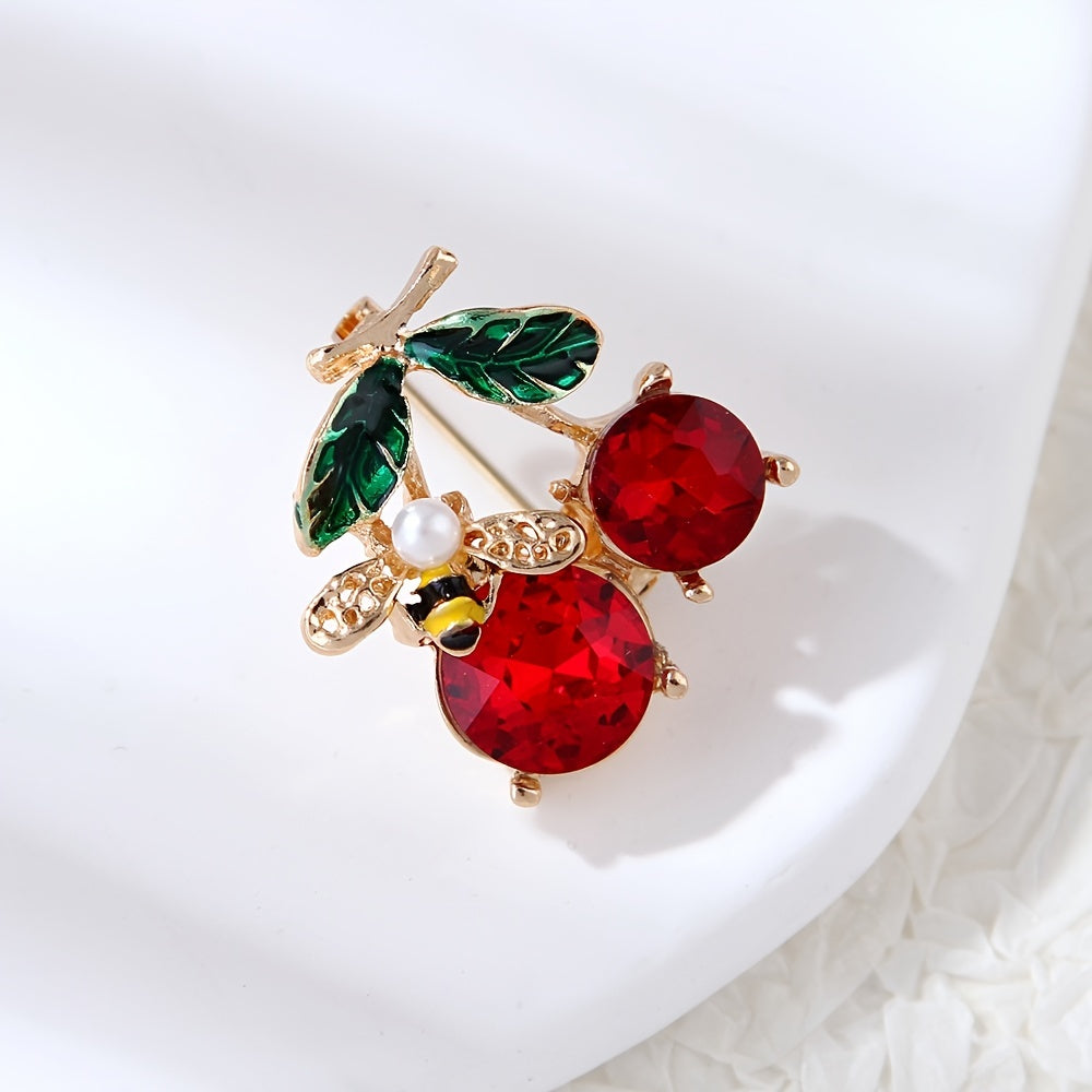 Add a touch of whimsy to your outfit with this bee and cherry themed brooch pin. It features rhinestones, faux pearls, and red enamel details, making it a charming accessory.