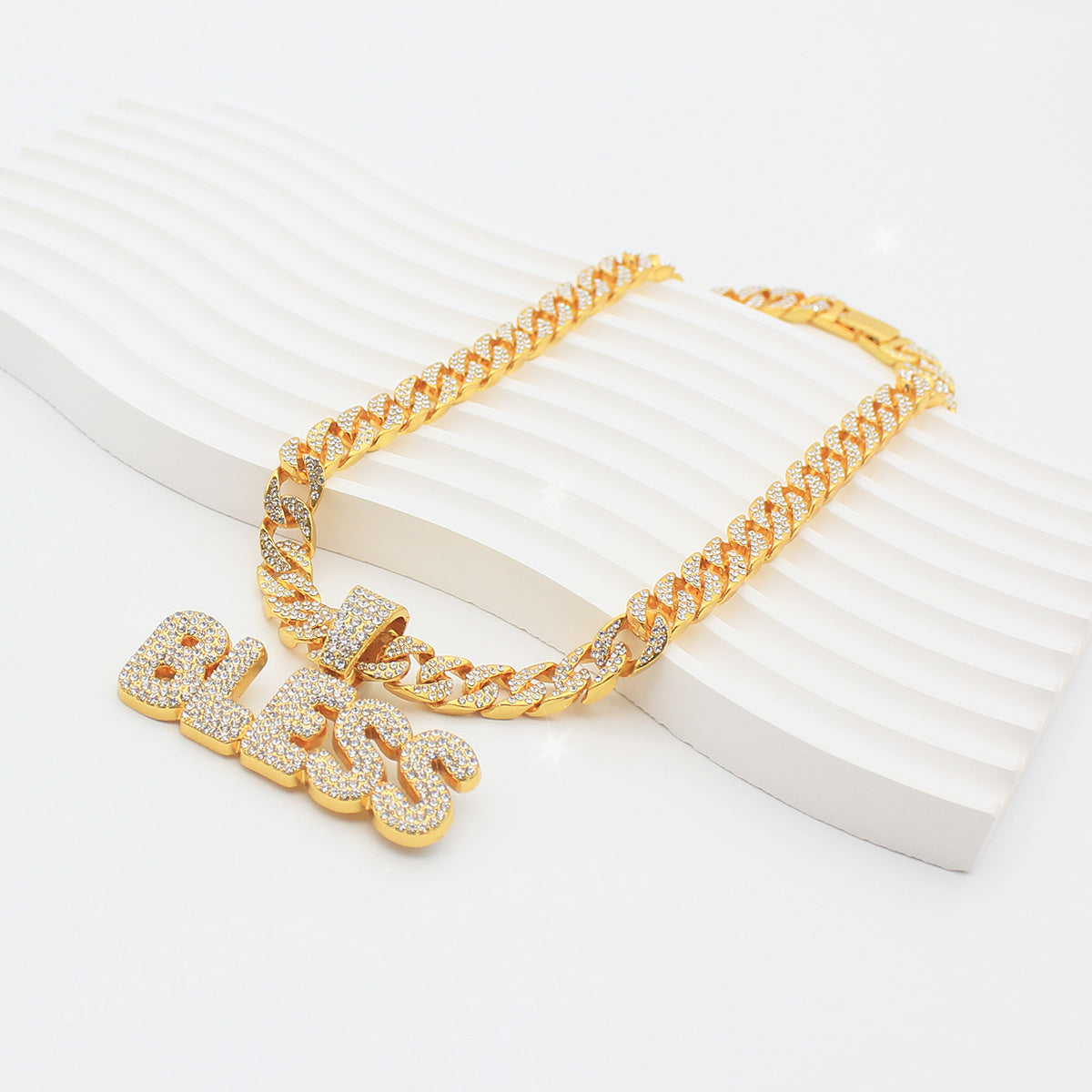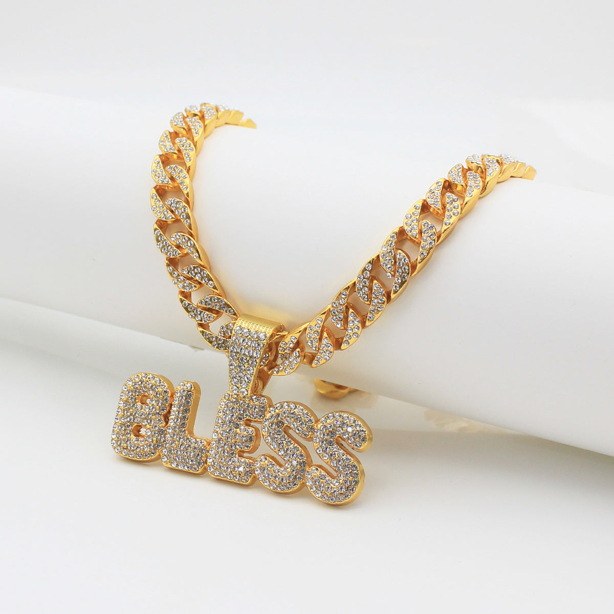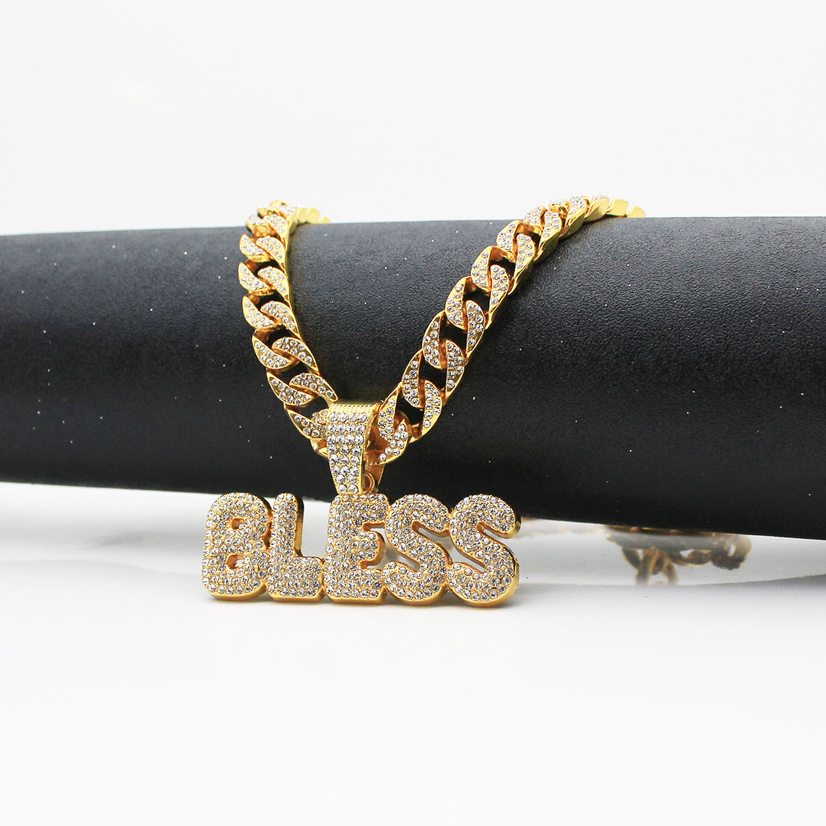 Elevate your style with this exquisite Bless pendant on a Cuban chain. A perfect accessory to complement any outfit.