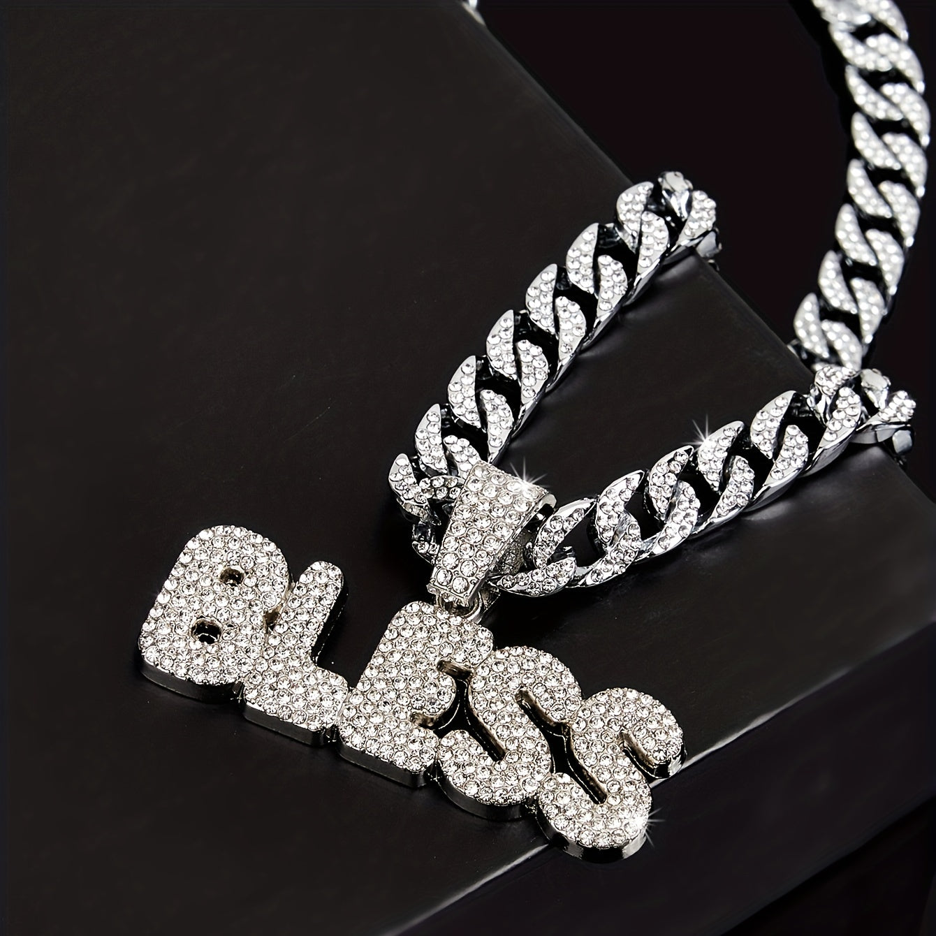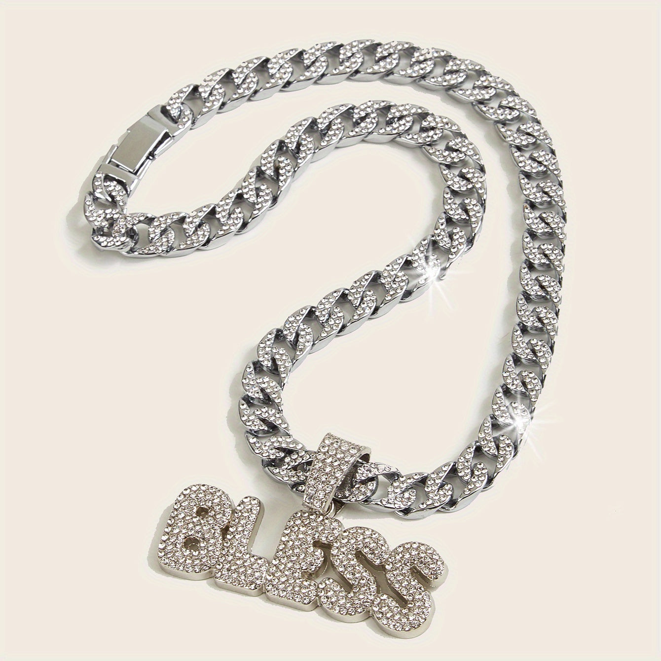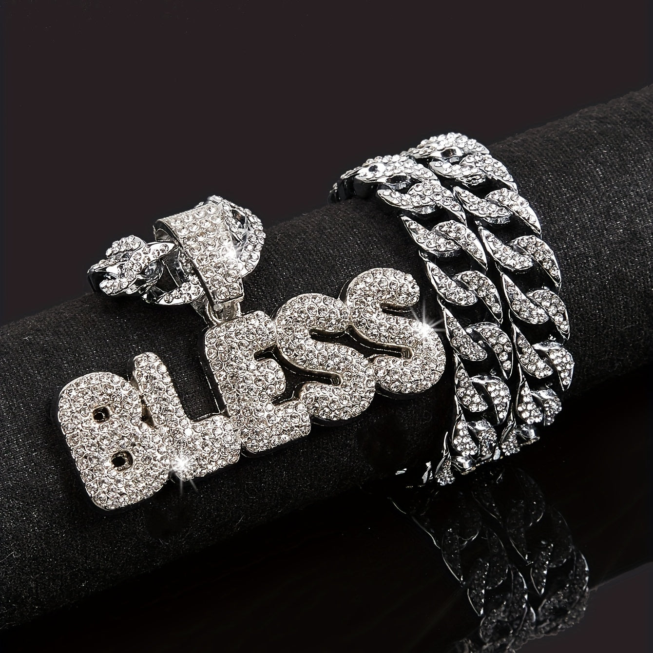 Elevate your style with this exquisite Bless pendant on a Cuban chain. A perfect accessory to complement any outfit.