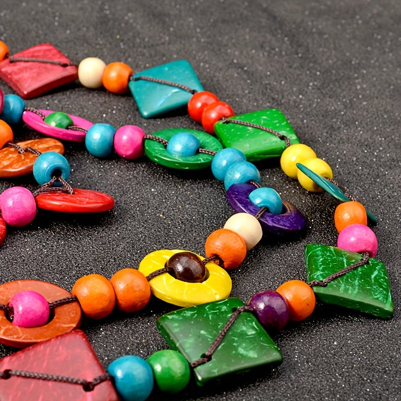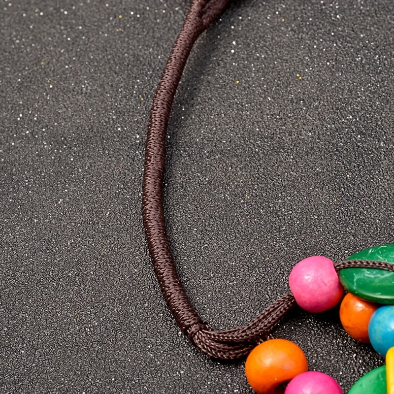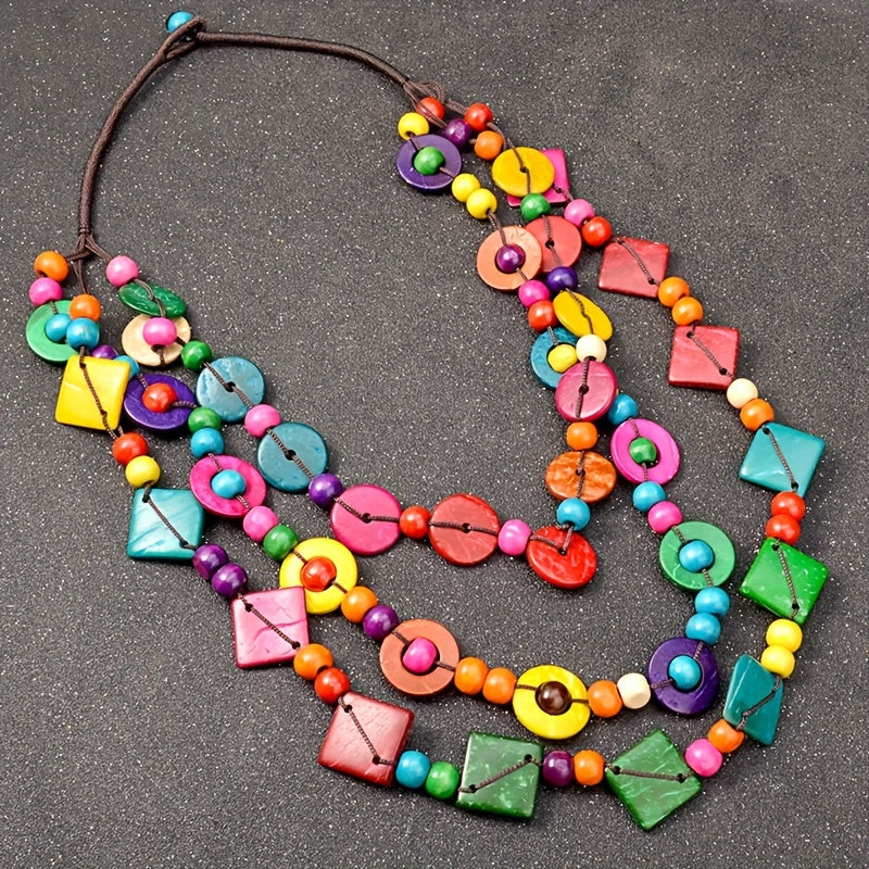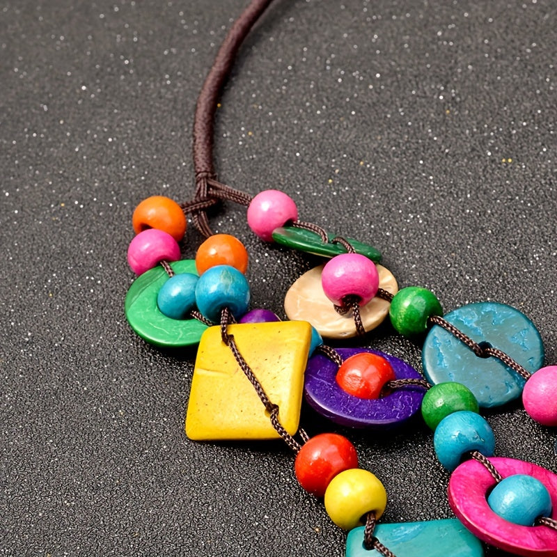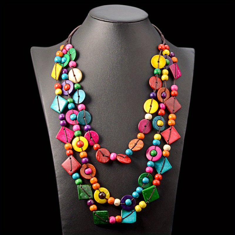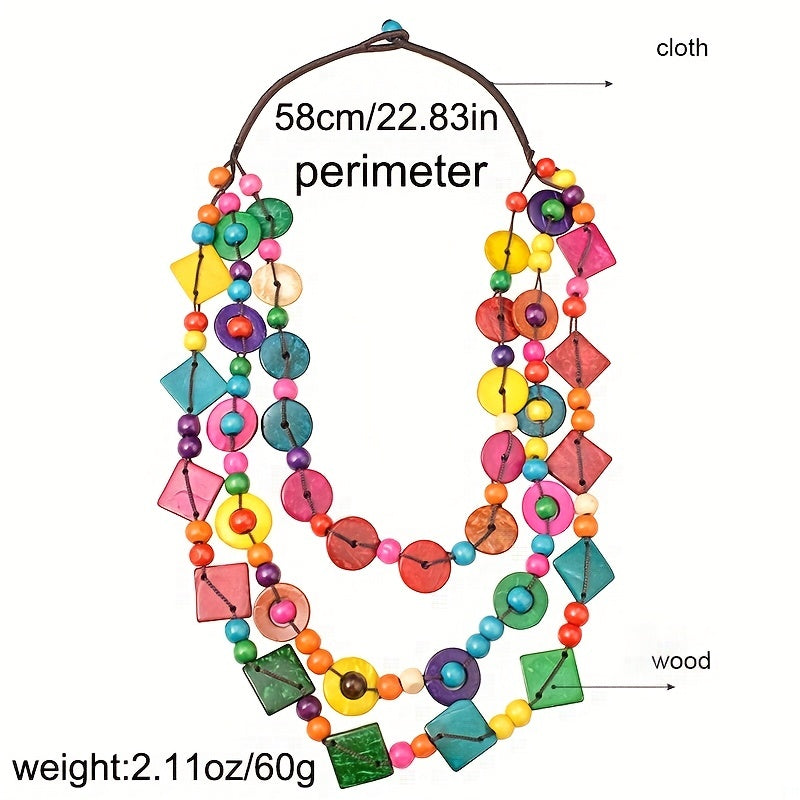 This multilayer necklace is a stylish accessory for parties and events. The vintage design and wooden elements make it a unique piece of jewelry that will enhance any outfit.