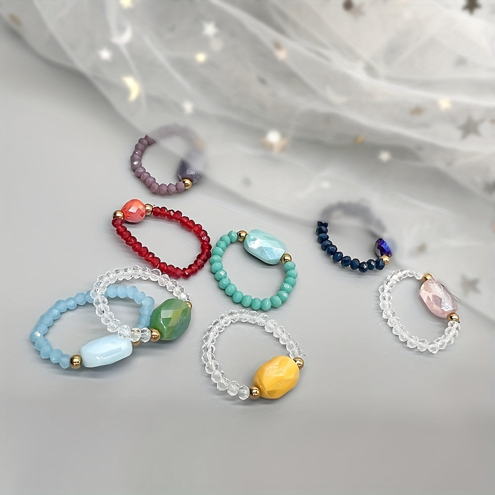 This stunning ring features square crystal glass beads in vibrant colors. It is electroplated for a shiny finish, making it a beautiful finger jewelry accessory for women.