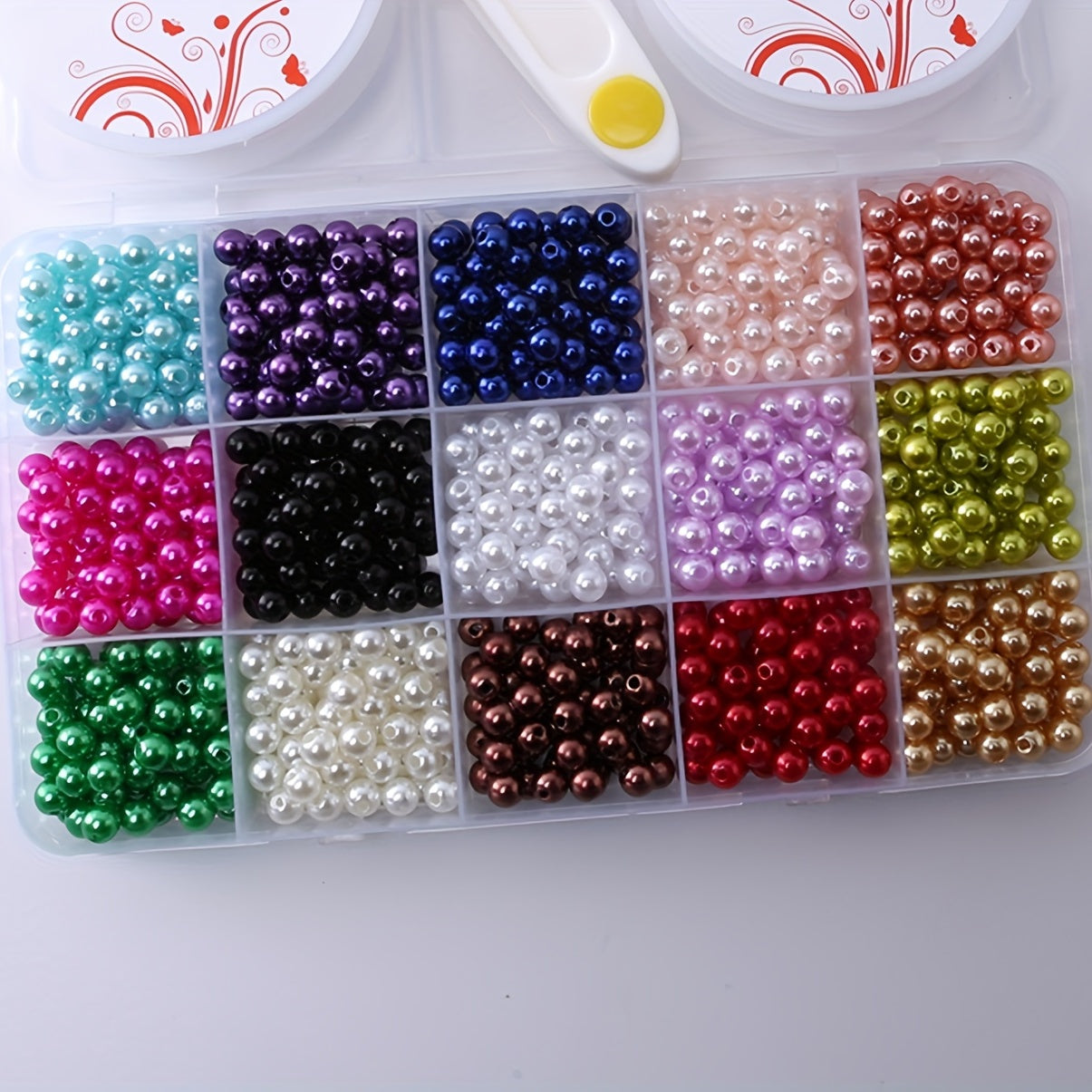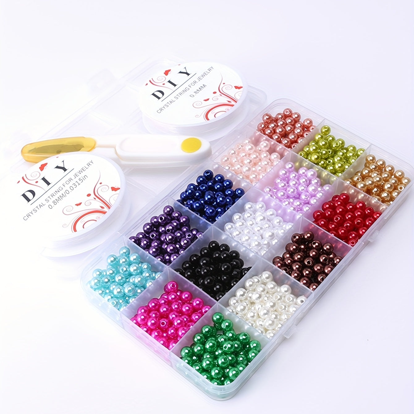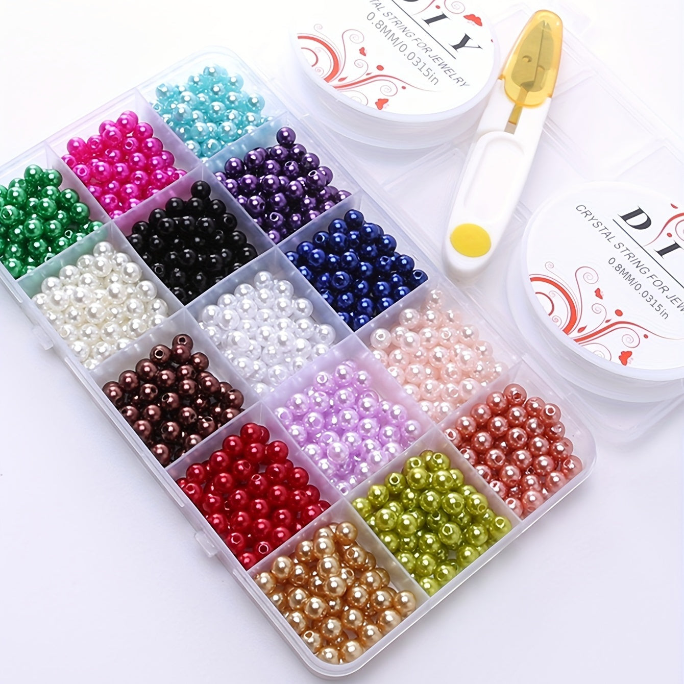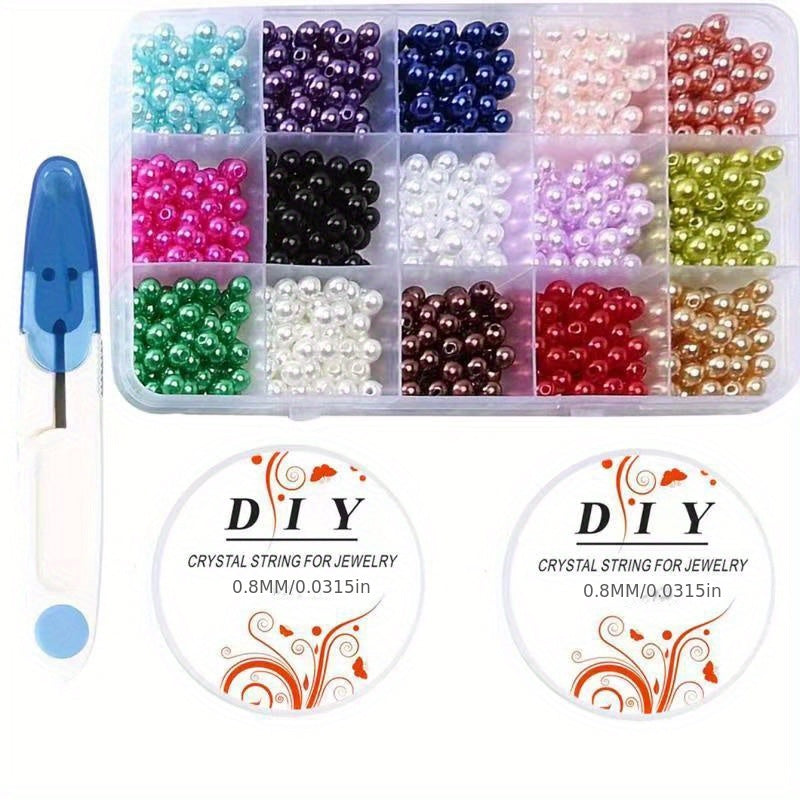 Get creative with this set of 15 grids colorful faux pearl round loose beads. Includes 2 rolls of elastic thread and 1 scissor for easy crafting.