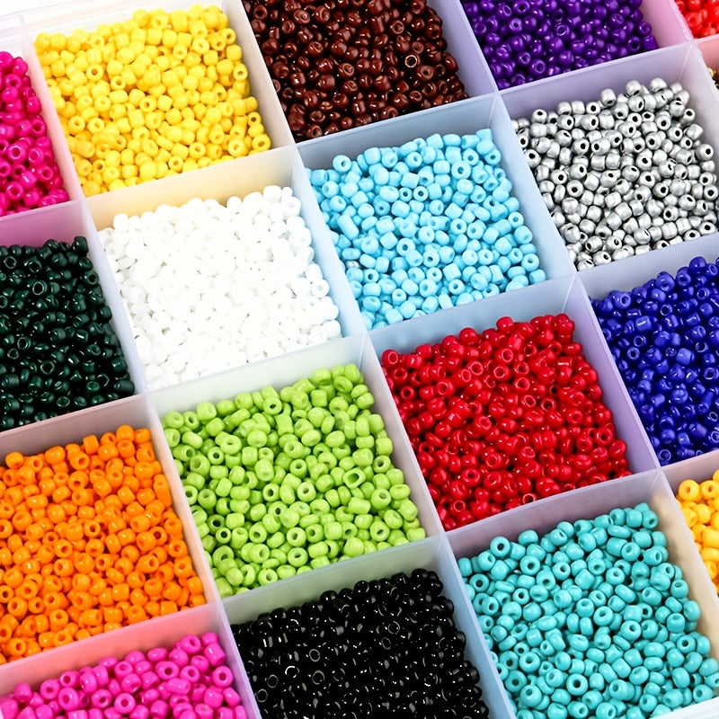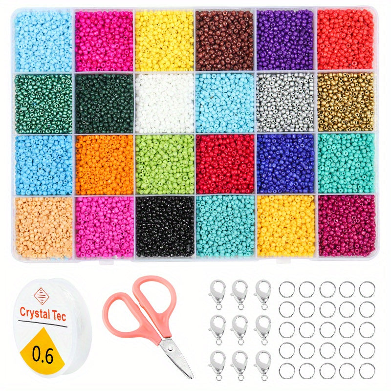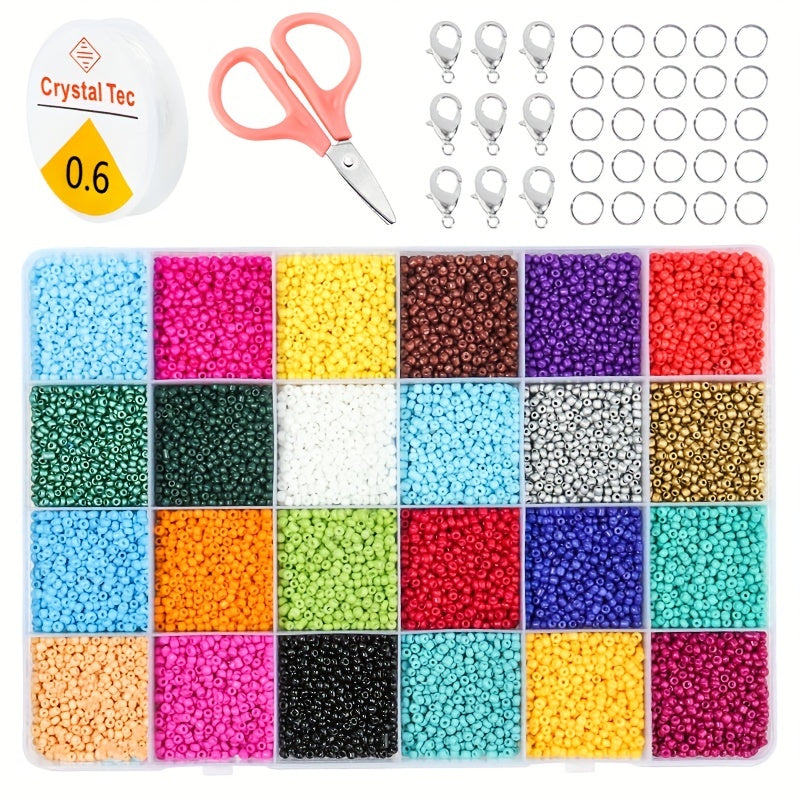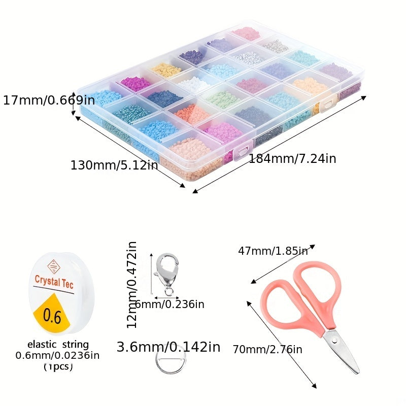 Get creative with this set of 2.3mm colorful glass rice beads perfect for making your own jewelry. Includes elastic thread, scissor, open jump rings, and lobster clasps in a convenient 24 compartments box.