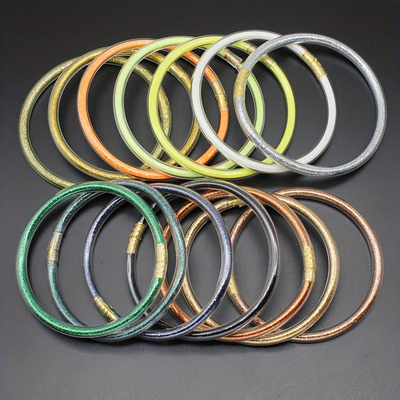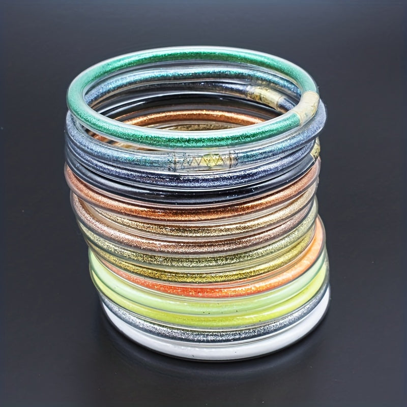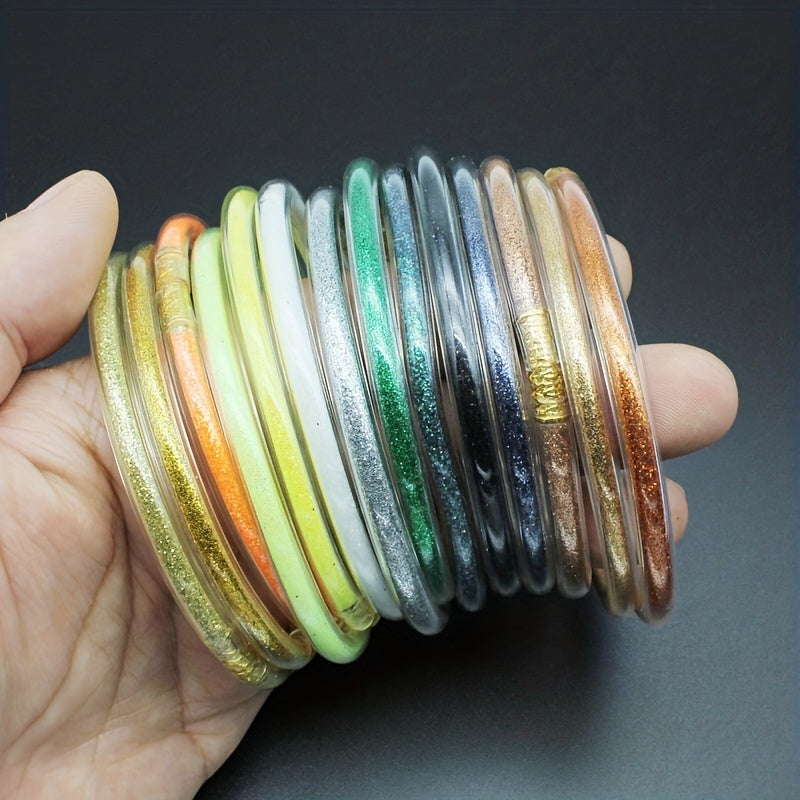 This bangle set includes 14 colors of glittery golden powder foil and jelly silicone material. It is a fun and stylish accessory for girls.