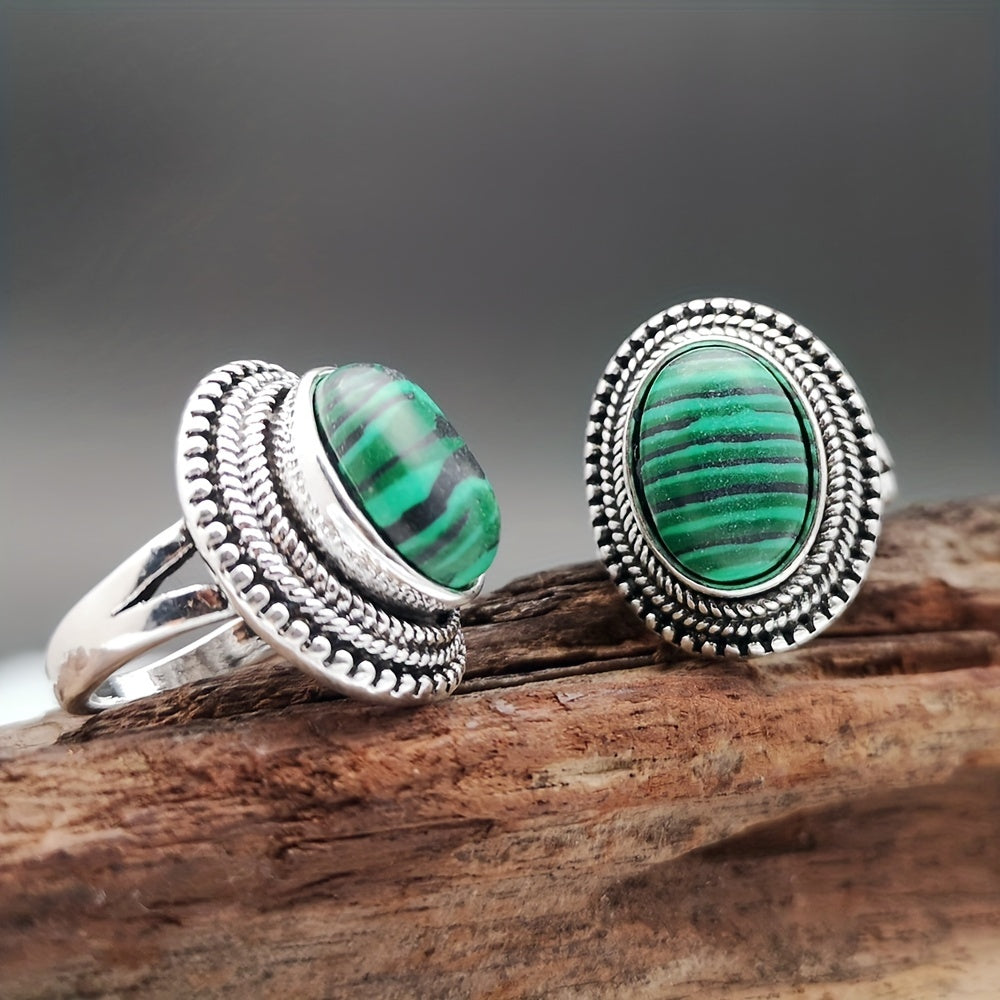 This men's ring features a natural green malachite stone set in a vintage design. Perfect for adding a touch of retro style to any outfit.
